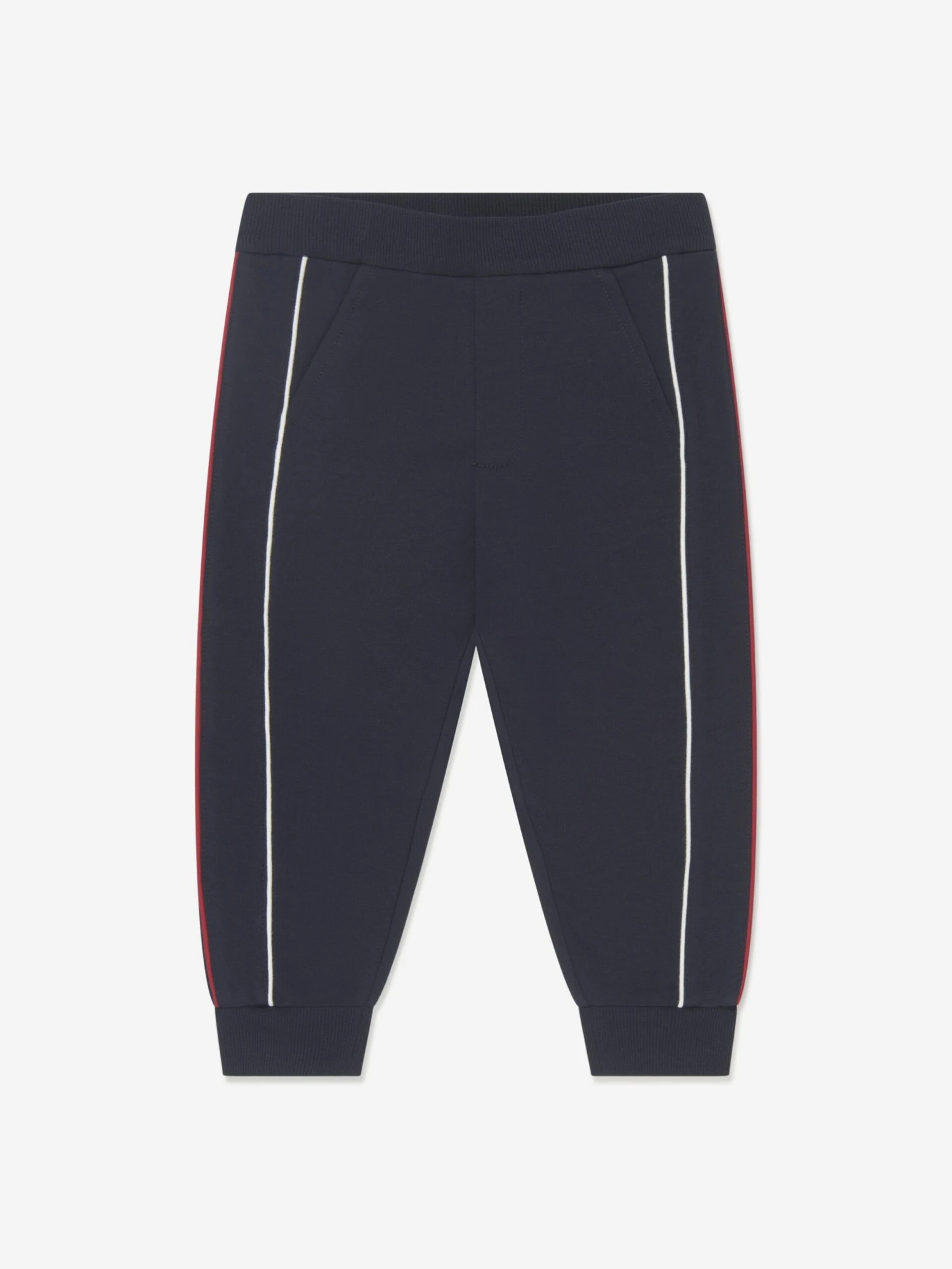 Full of Alpine spirit, these baby boys navy joggers are an elevated casual for everyday comfort. Crafted for movement the piece is composed of an elasticated cotton and decorated with discrete white and red piping on the front, whilst the iconic logo is featured on the reverse.