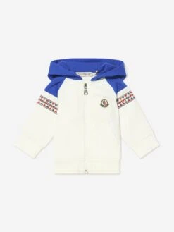 This baby boys tracksuit offers cool, clean Alpine elegance for little ones. Composed of a soft and stretchy cotton, this 2-piece set consists of a comfy white hoodie featuring a branded jacquard on the sleeves, contrast hue hood and sleeves, and the iconic badge motif adorning the chest; whilst matching bottoms arrive with a tonal branded tab on the reverse.