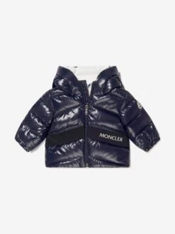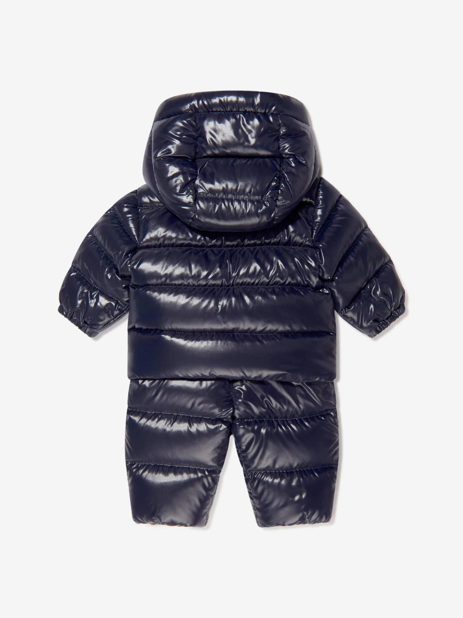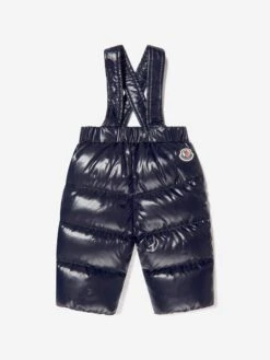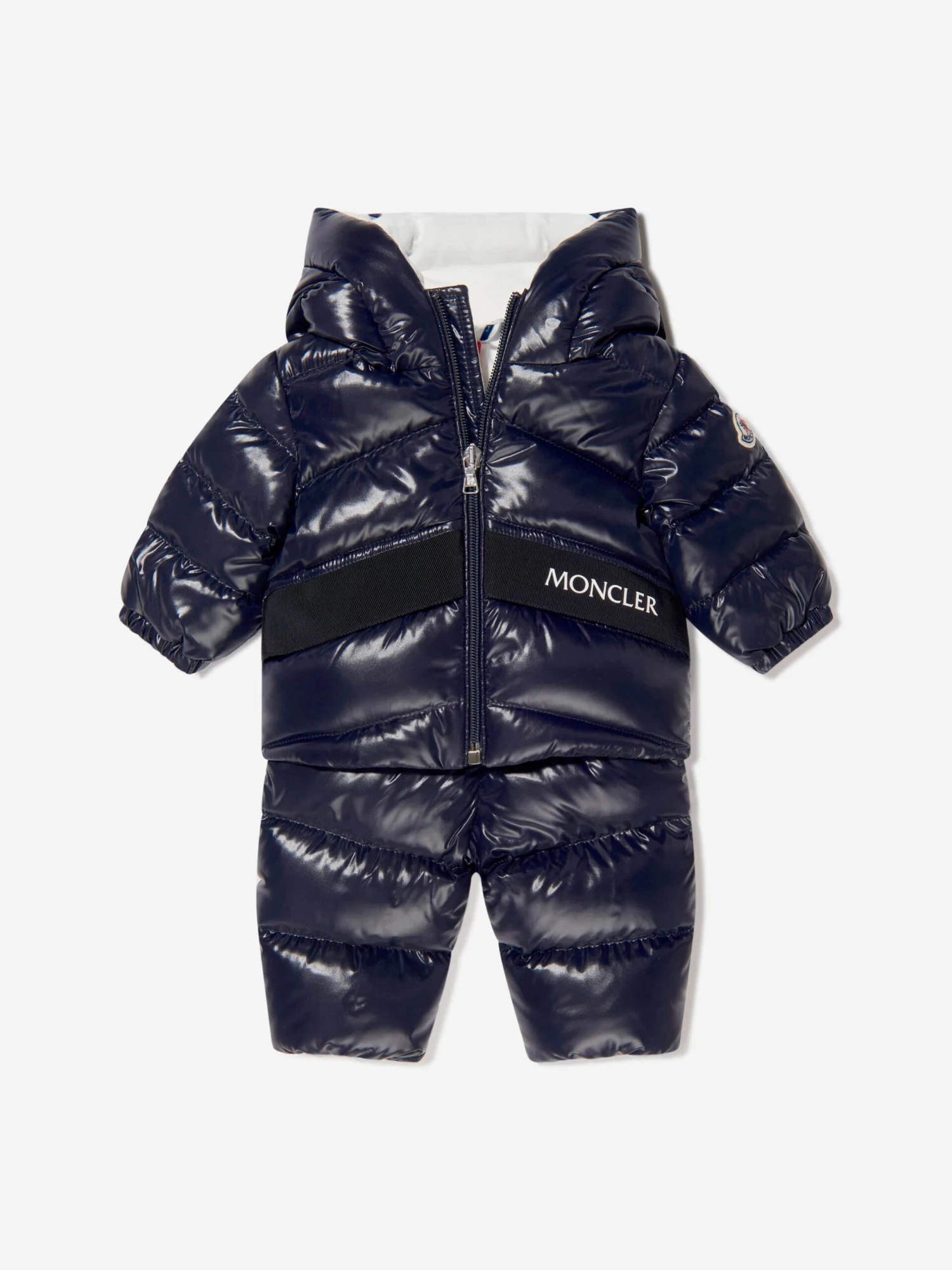 Designed for the snow, so ready for harsh conditions, this baby boys navy 2-piece Frozil snowsuit from Moncler provides complete protection from the elements. Consisting of a stylish puffer jacket and matching romper bottoms, both parts are down padded and encased within a glossy nylon laque shell. A grosgrain chevron works its way across the front, containing a logo print and offers a contrast texture, whilst the iconic felt badge adorns both pieces.