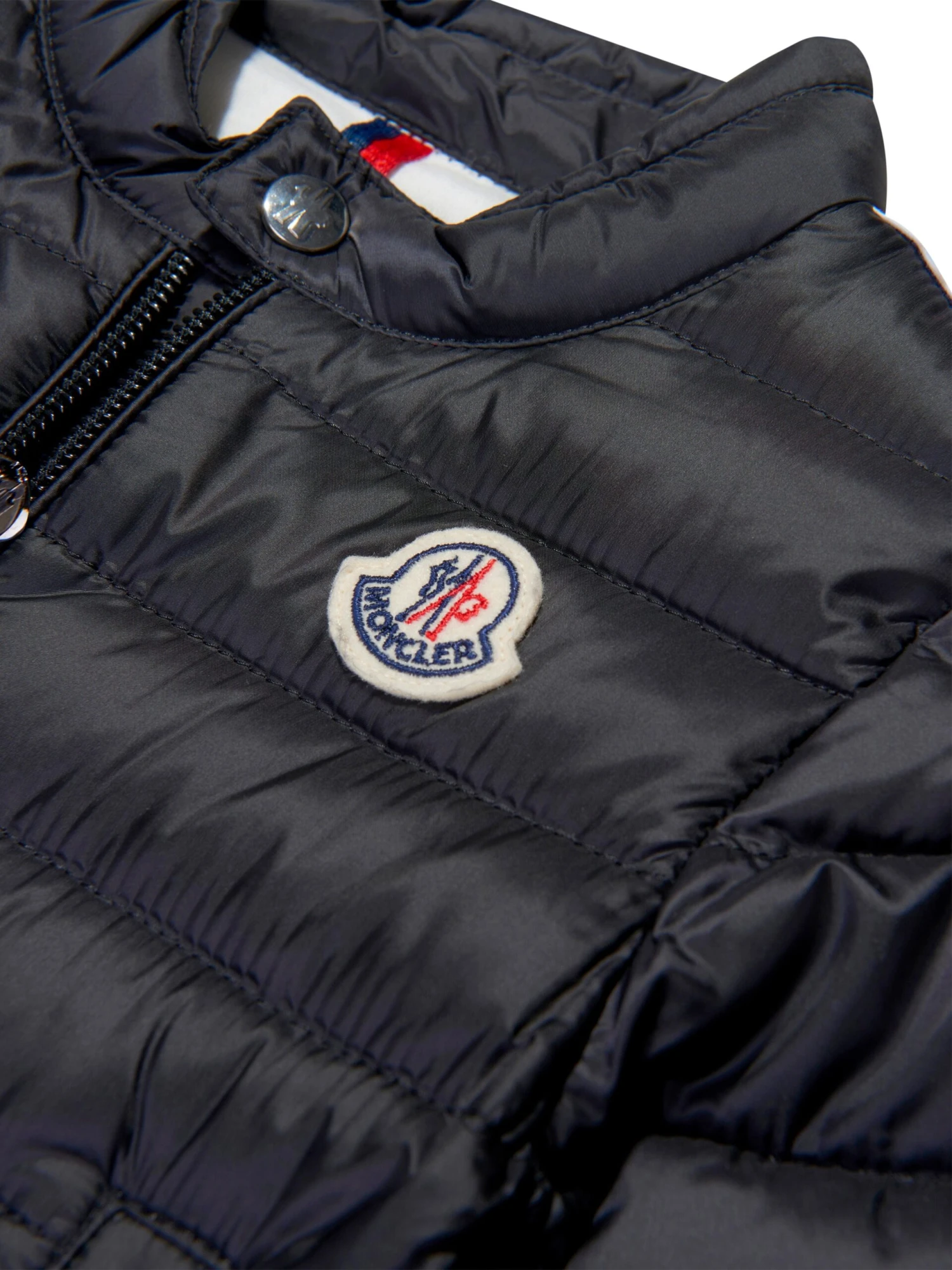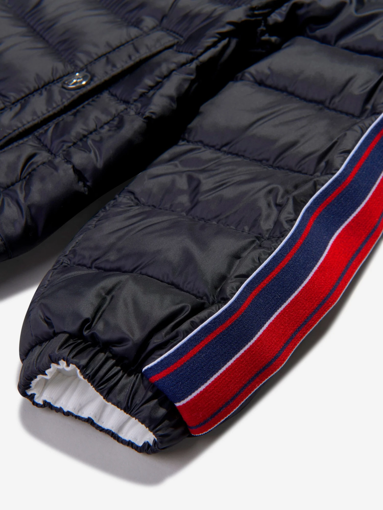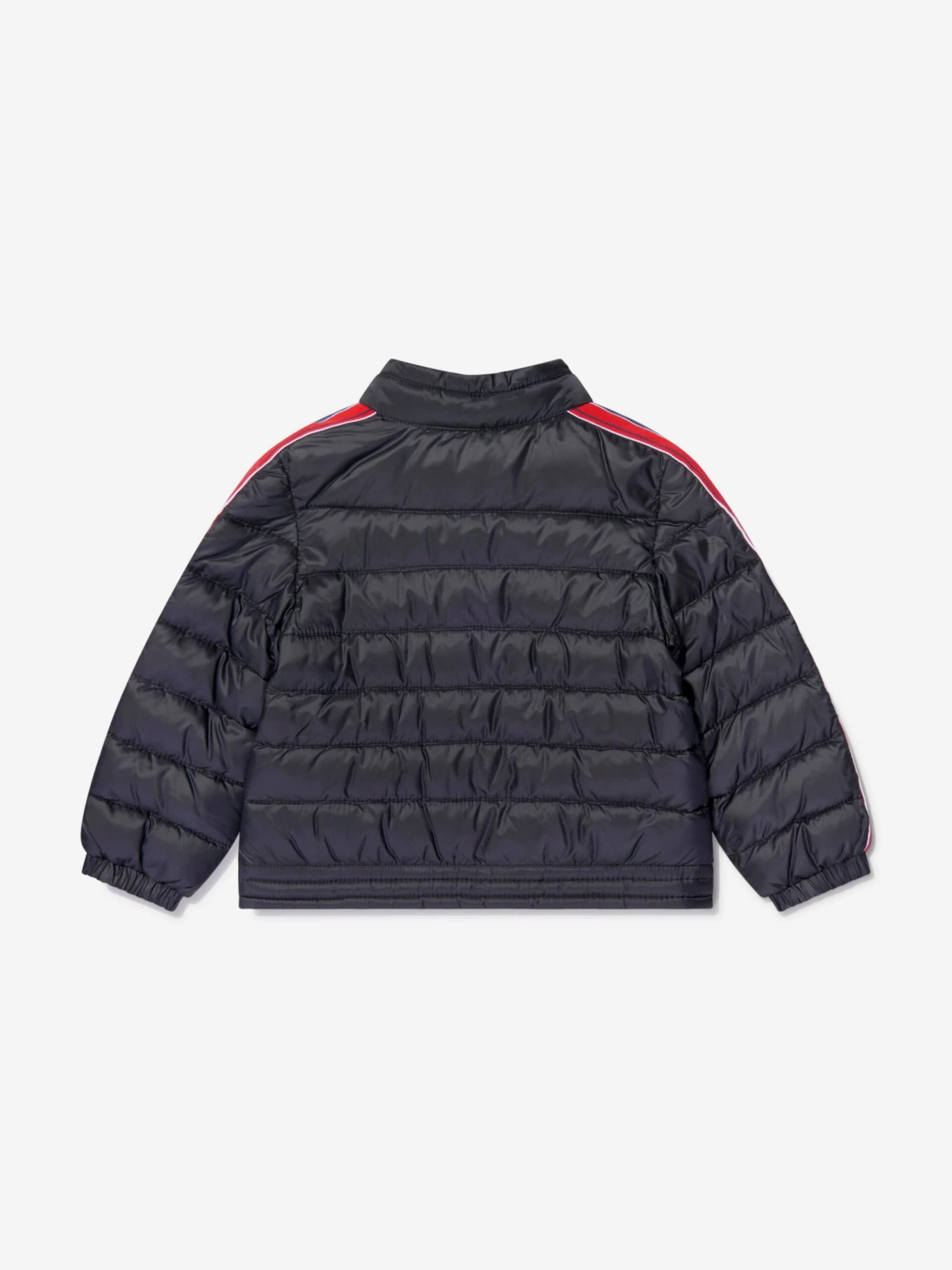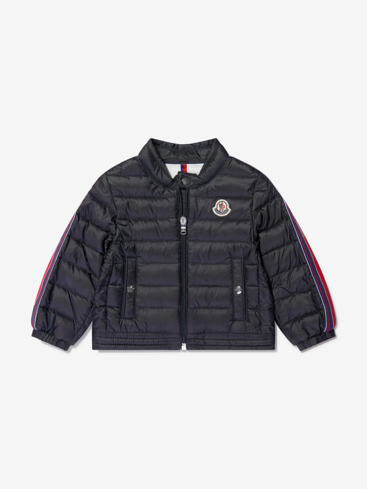 Black jacket for baby boys by luxury brand Moncler Enfant. Down padded for comfort and warmth, it is silky soft, lightweight and water repellent with a white cotton jersey lining. There are navy blue, white and red striped trims along the sleeves and the brand’s signature logo badge is on the chest. It has popper fastening on the neck and pockets.