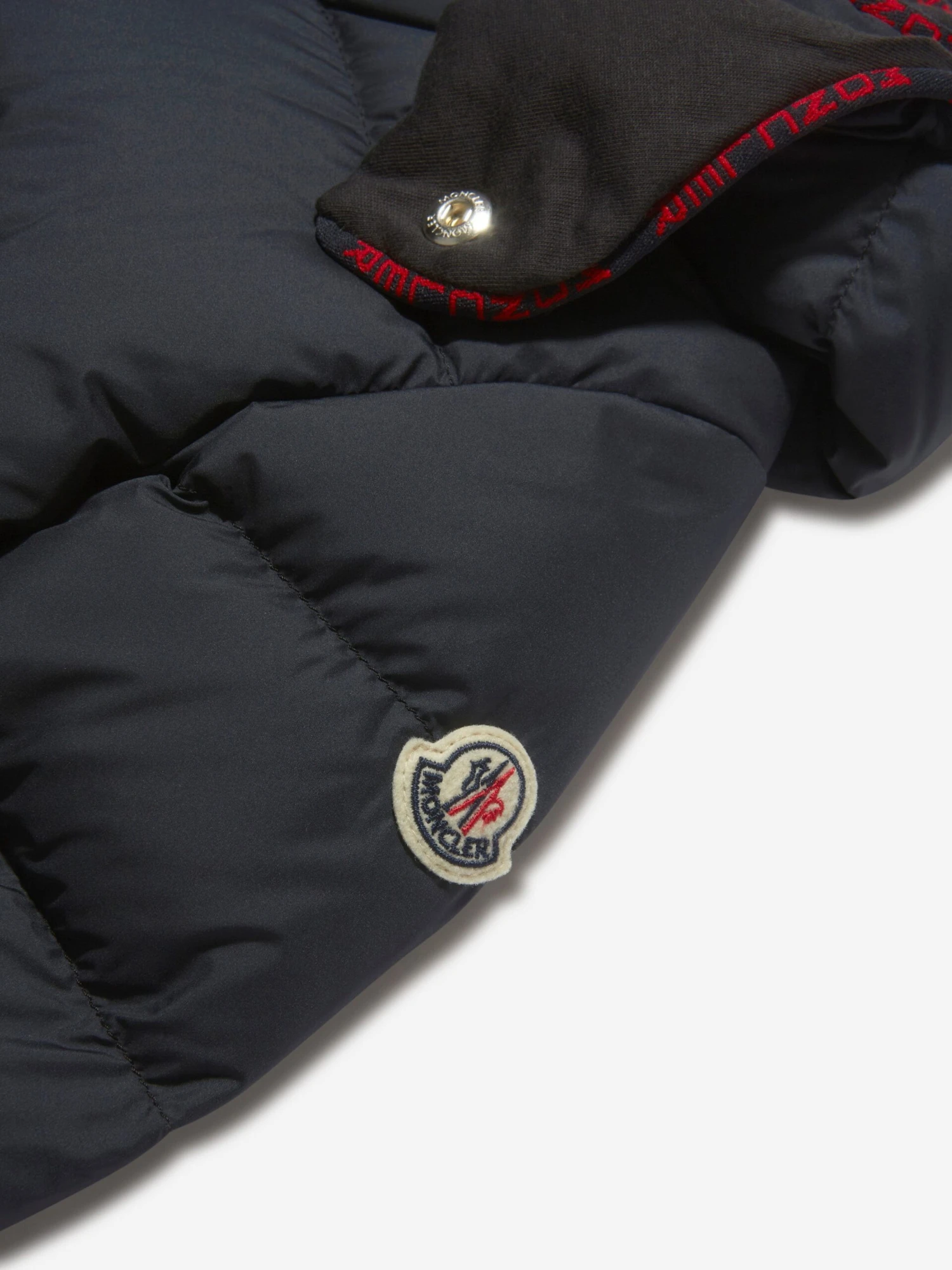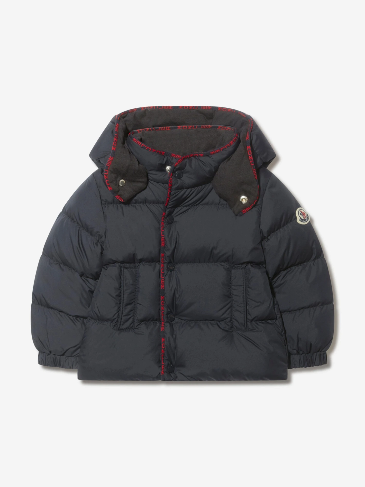 Future textures meet Alpine heritage for this baby boys navy Batarn jacket from Moncler. Delivering style and warmth, this down padded piece features a striking red logo trim working around the hood and front fastening and is finished with the iconic felt logo badge on the left sleeve.