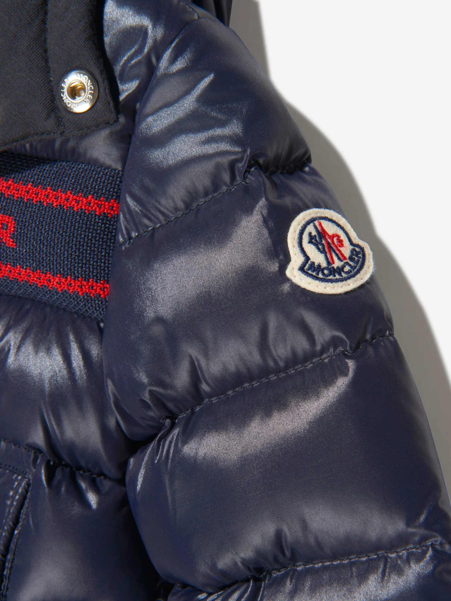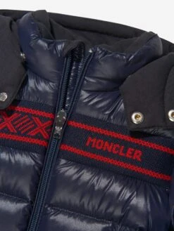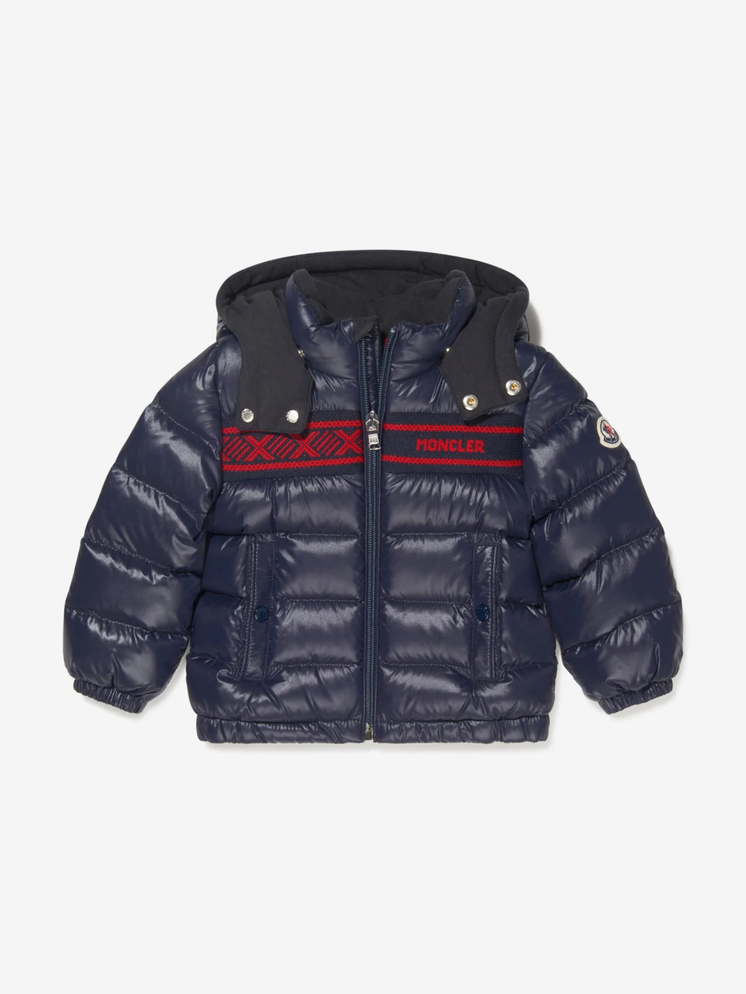 Distinctive and XXXclusive, this baby boys navy Holmi jacket from Moncler delivers style and warmth. Glossy nylon lacqué contrasts with a woven red and navy jacquard across the chest and sleeves containing a logo and repeating X motif for a distinctive piece. Luxurious feather and down padding provides cutting edge insulation and the iconic logo badge sits on the left sleeve.