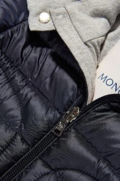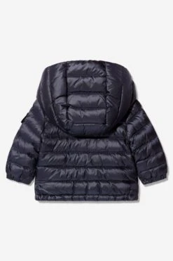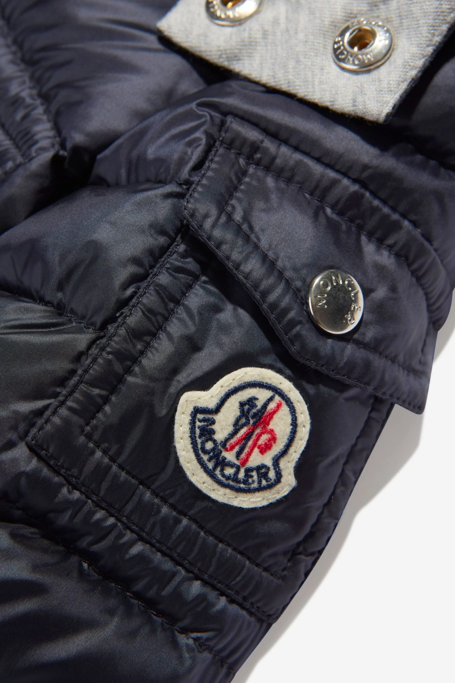 Informed by their Alpine heritage, this baby boys navy Lauros jacket from Moncler offers warmth and comfort in a stylish everyday silhouette. Luxurious down padding combines with boudin quilting for cosy insulation and the clean design is accented with a grey lined hood and finished with the iconic logo appliqué adorning the sleeve pocket.