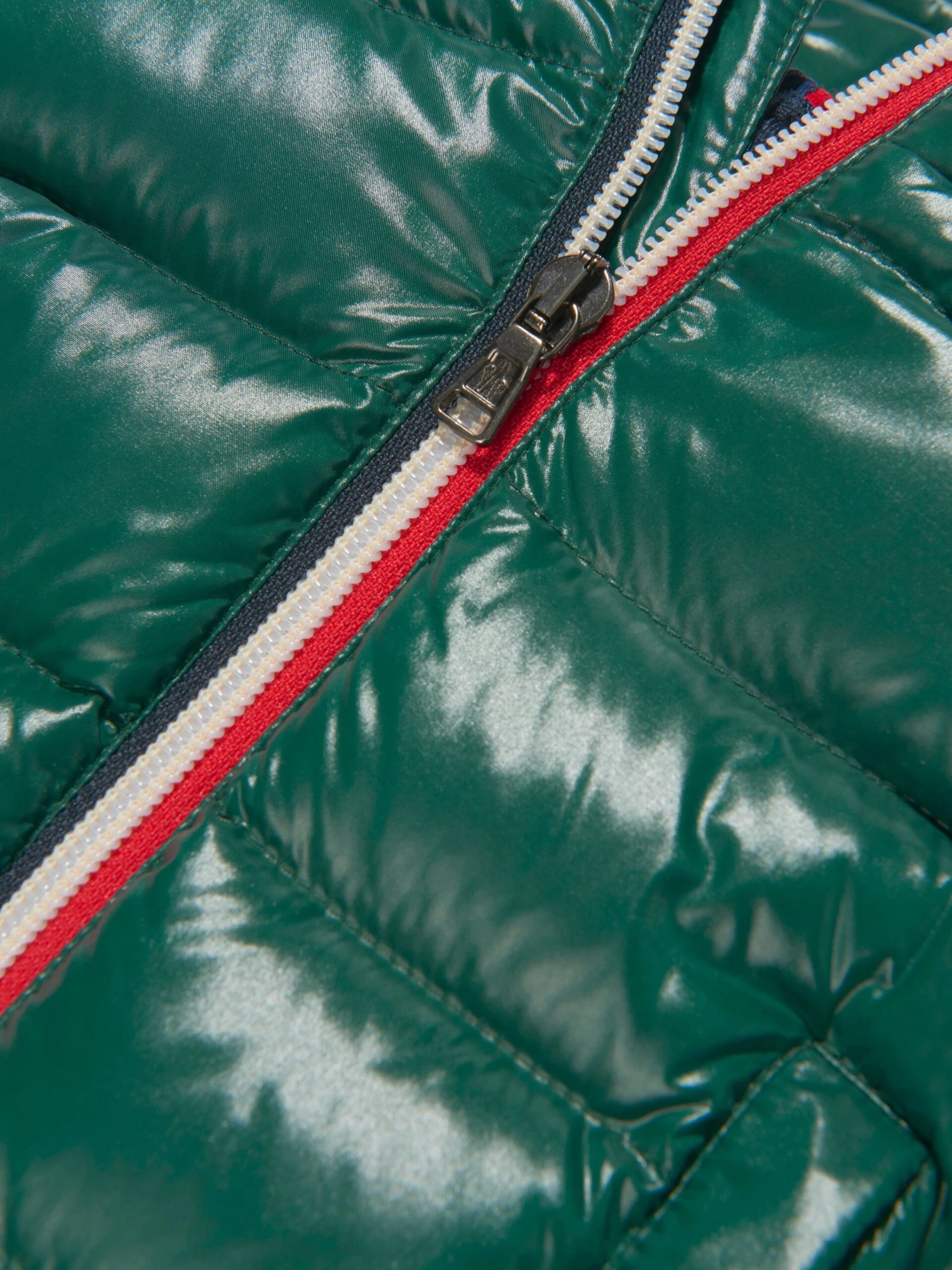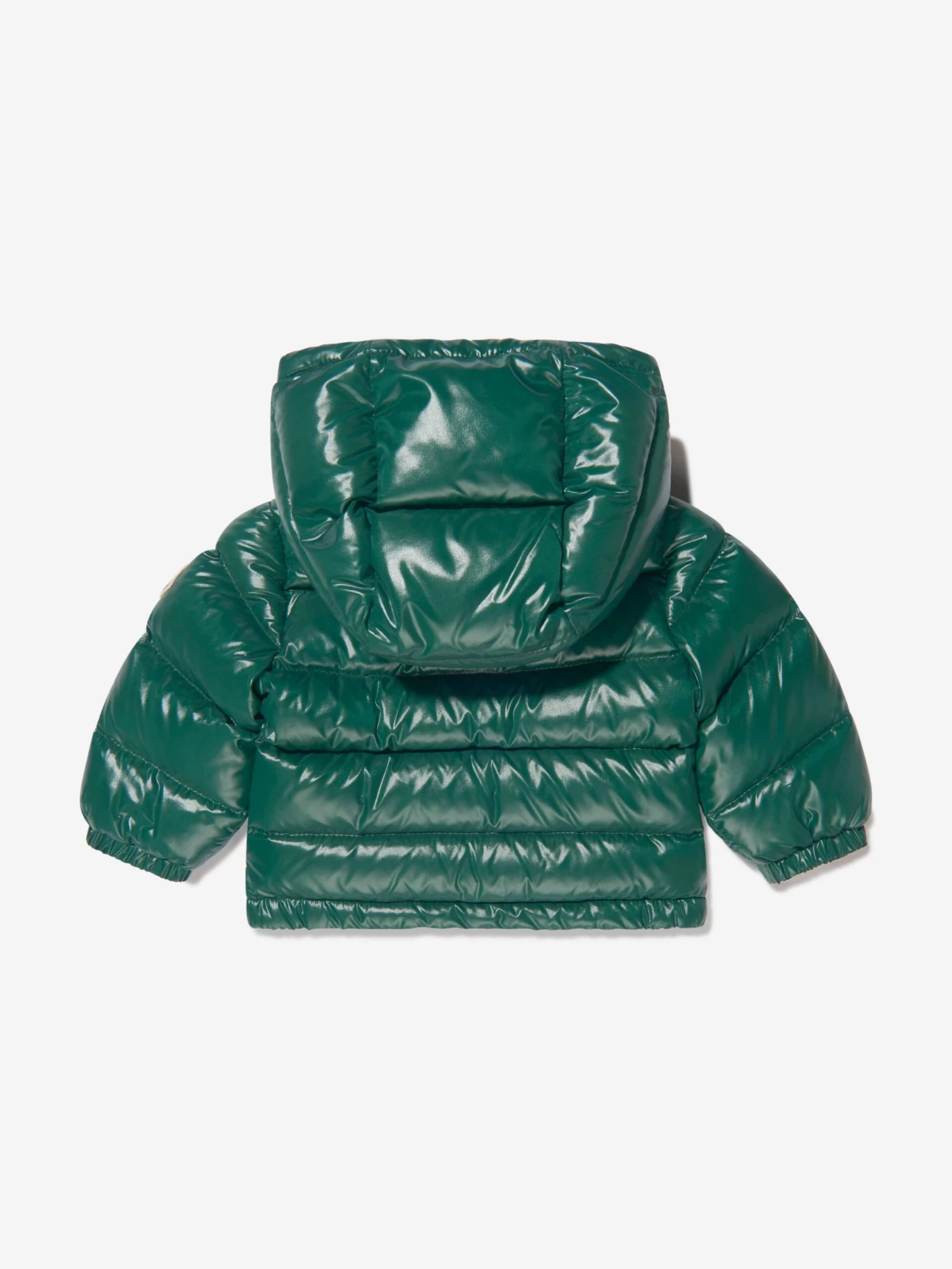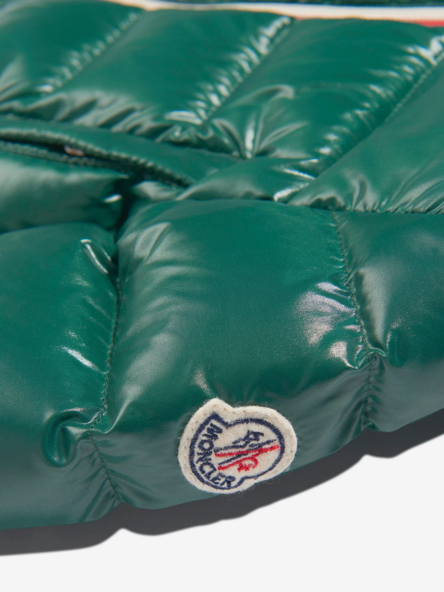Moncler allow their Alpine heritage to shine through for this baby boys green Aubert jacket. Showcasing tradition woven into an ultra modern silhouette, a striking tricolour stripe zip fastening draws the eye, whilst the iconic badge emblem sits on the left sleeve. Down padded for warmth and luxury, this weatherproof piece is ready for adventure.