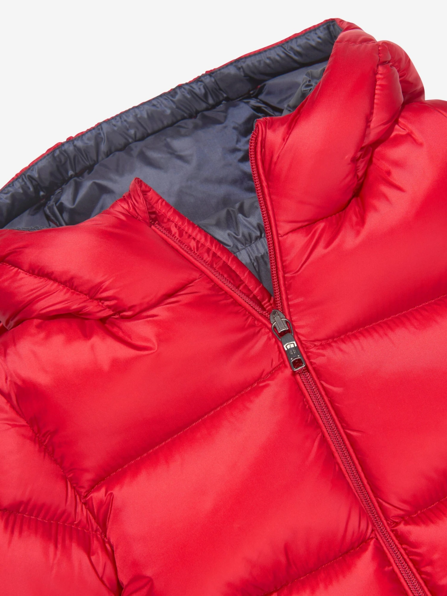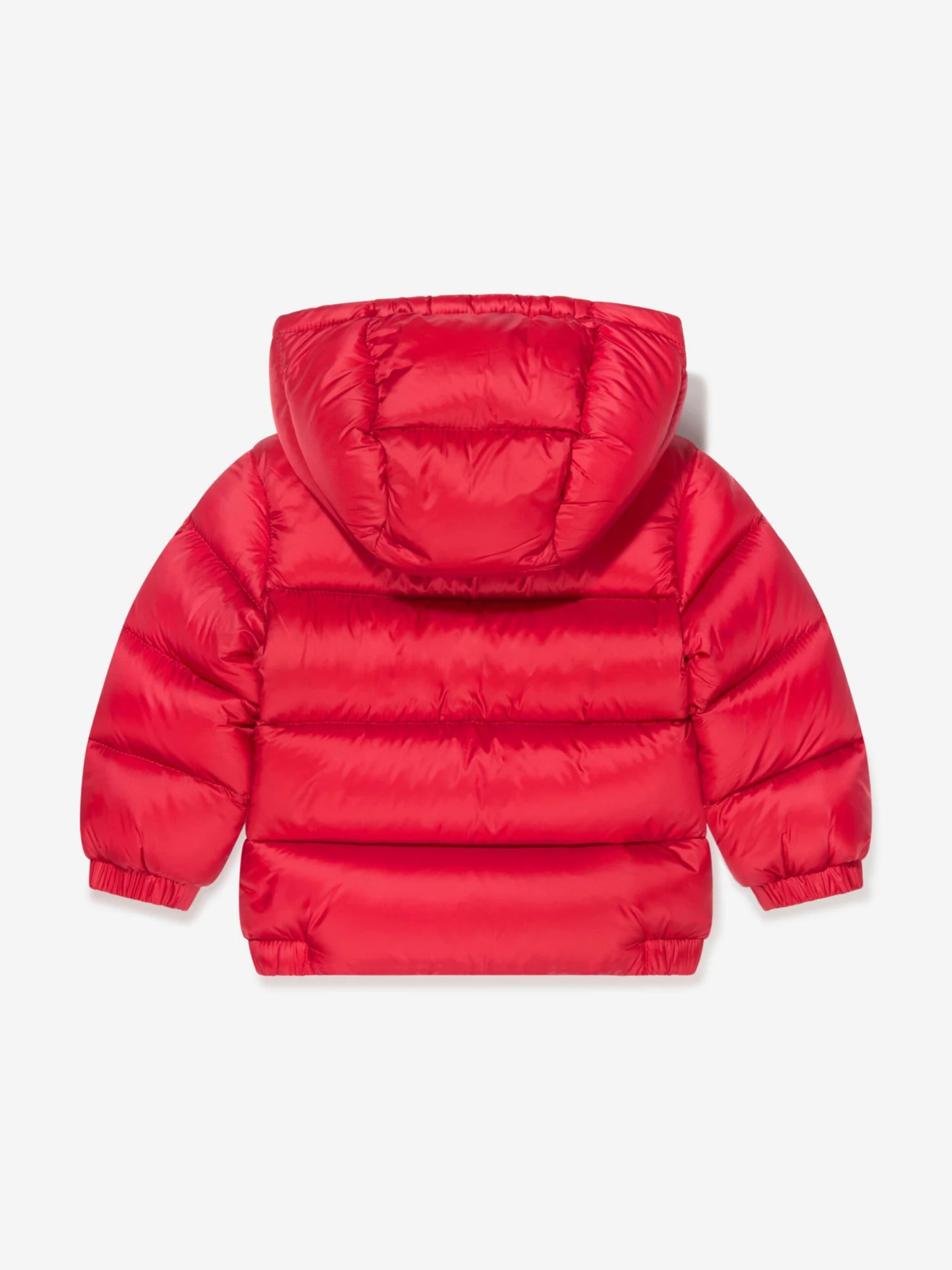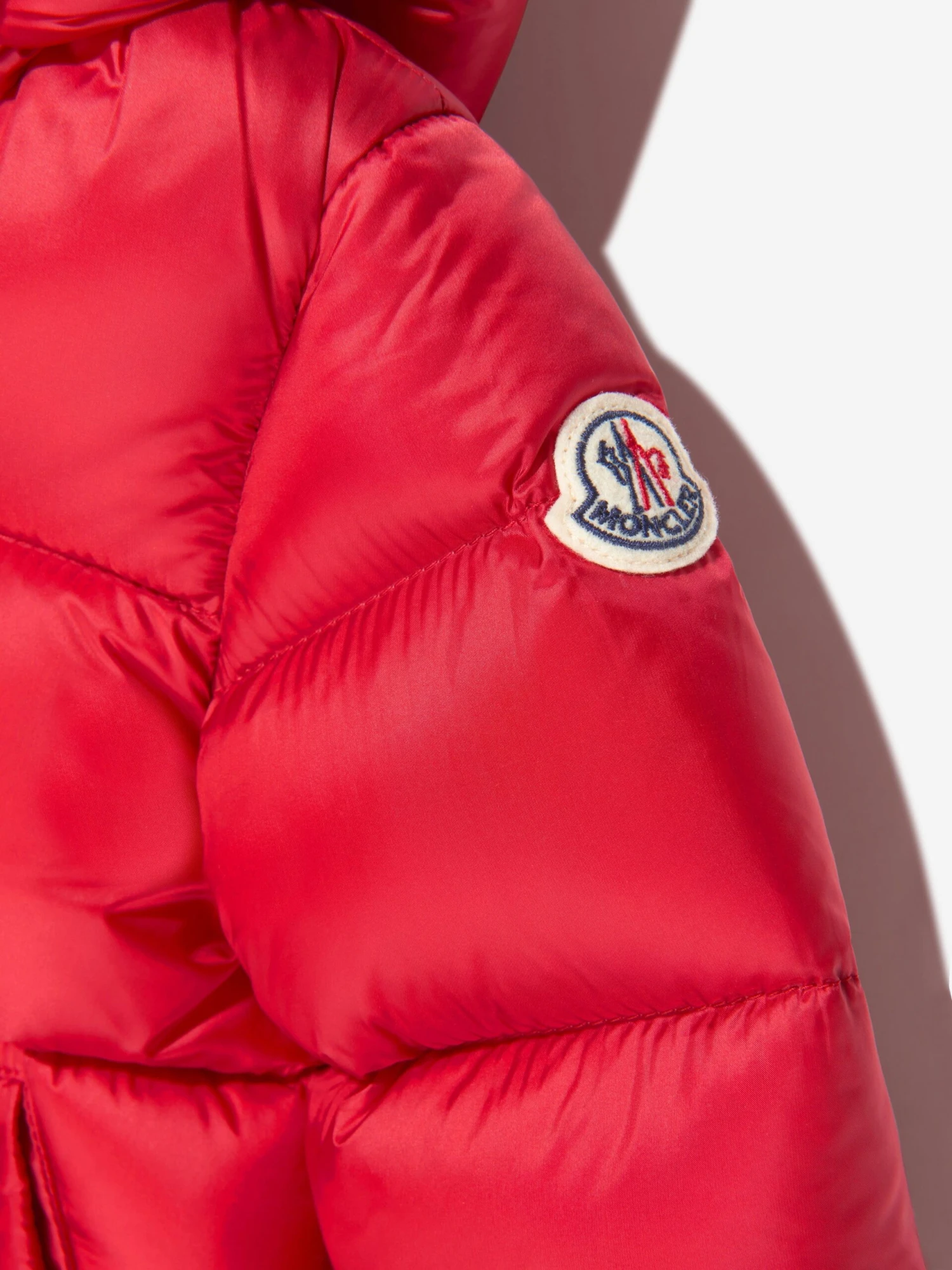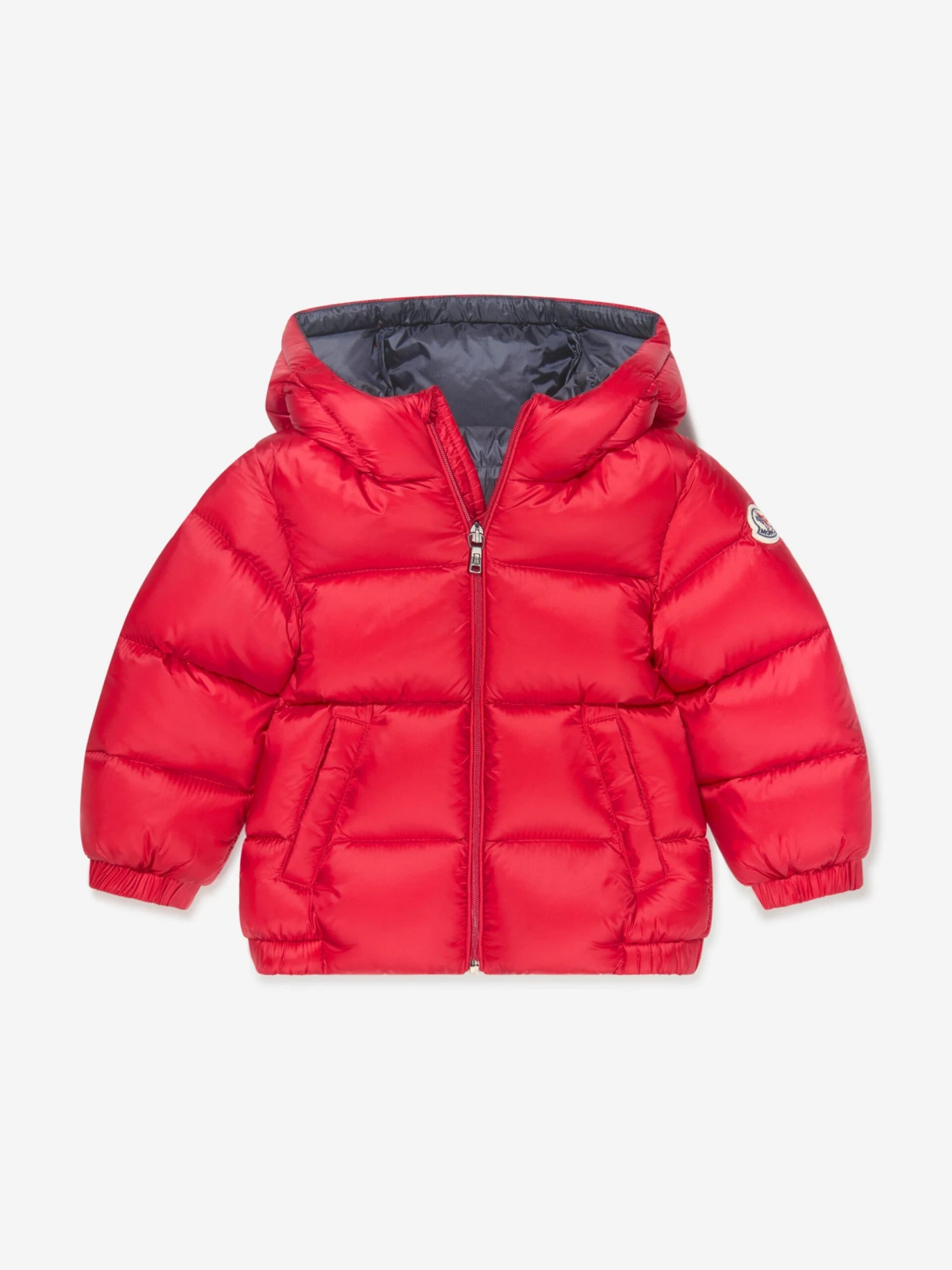 Offering an ultra-modern, minimalist energy, this baby boys red New Macaire jacket from Moncler is chic and weatherproof. The clean boudin-quilted piece is crafted from sleek longue saison and is down padded for warmth and comfort. A navy hued lining offers contrast aesthetics, joining the iconic badge emblem sitting on the left sleeve.