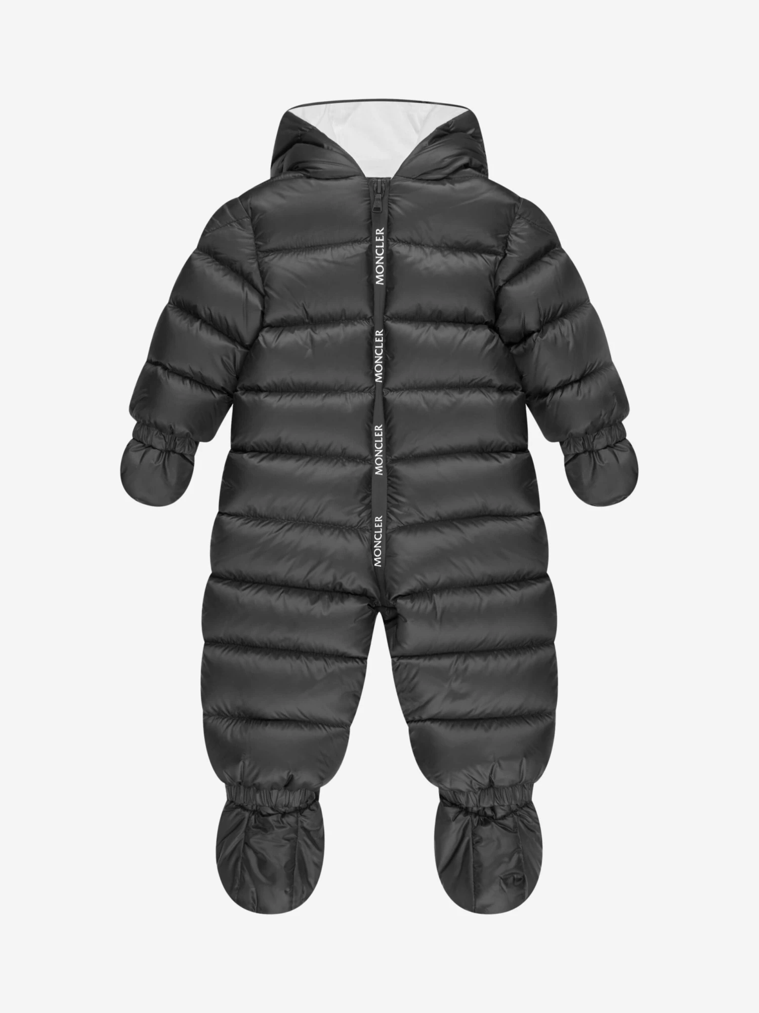 Bundle up your little one in luxury with this adorable Moncler Enfant baby snowsuit. Designed to keep your baby snug as a bug, the sleek black soft nylon outer is padded for extra warmth with covered feet, hands, a cosy hood and a secure zip fastening down the front.