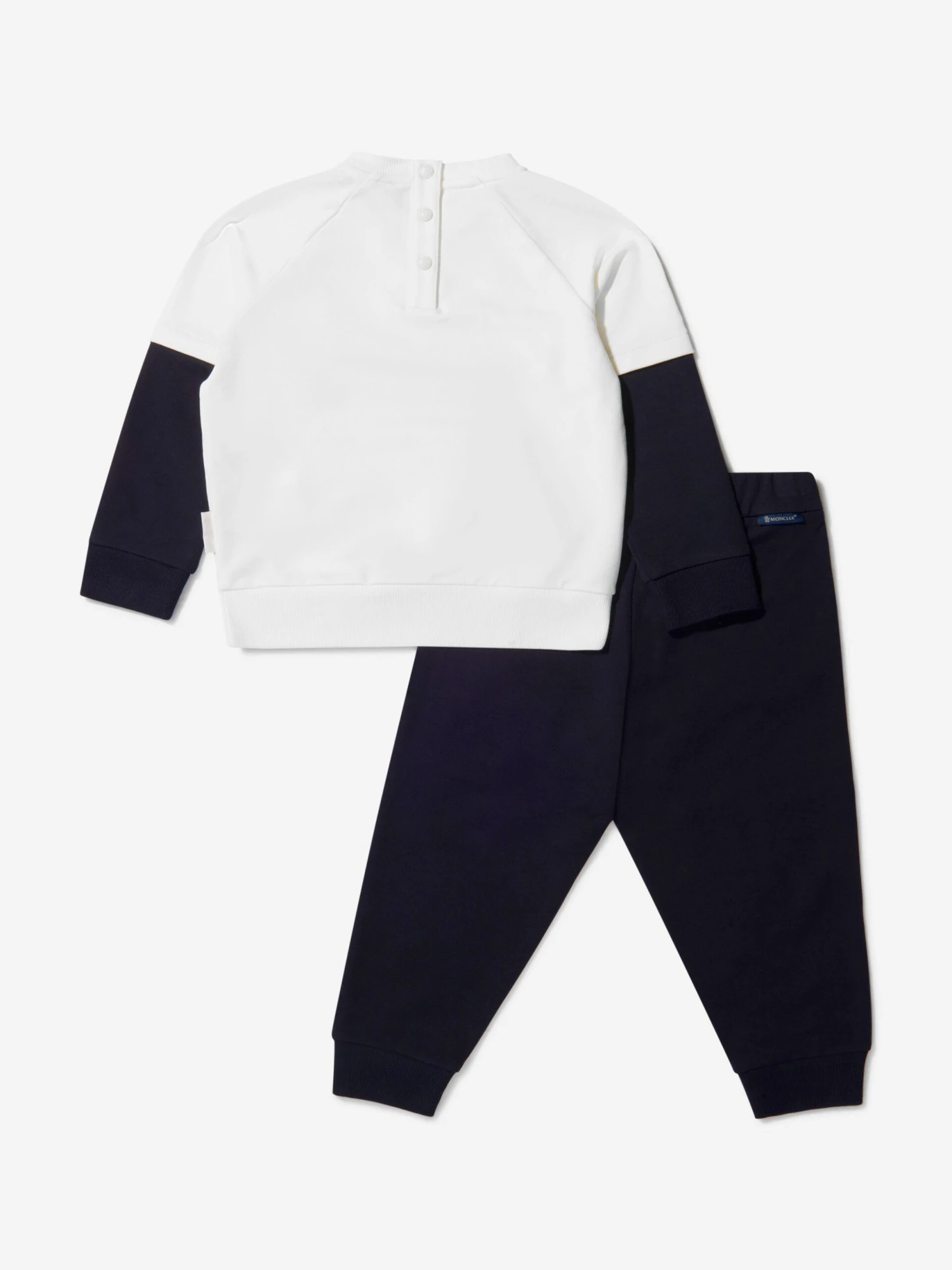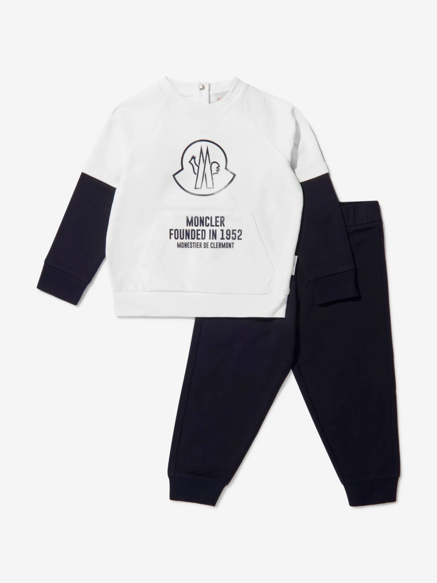 Little boys black and white tracksuit by luxury brand Moncler Enfant, made in soft and mid-weight cotton jersey. The sweatshirt top has kangeroo pockets, branded back toppers fastenings and comfortable ribbed trims.