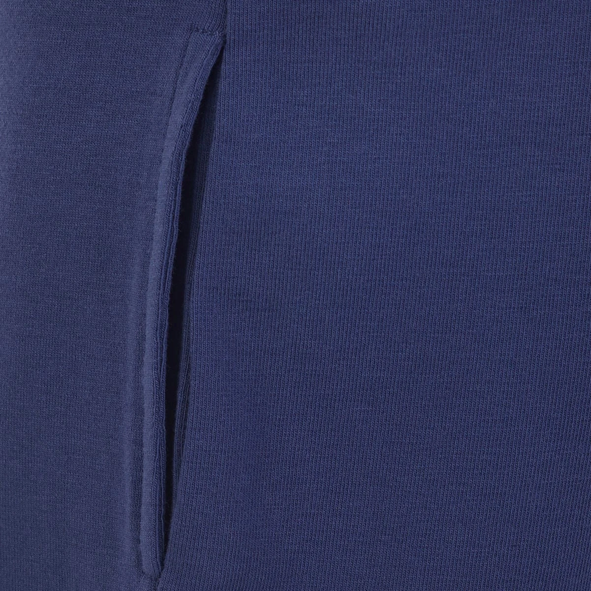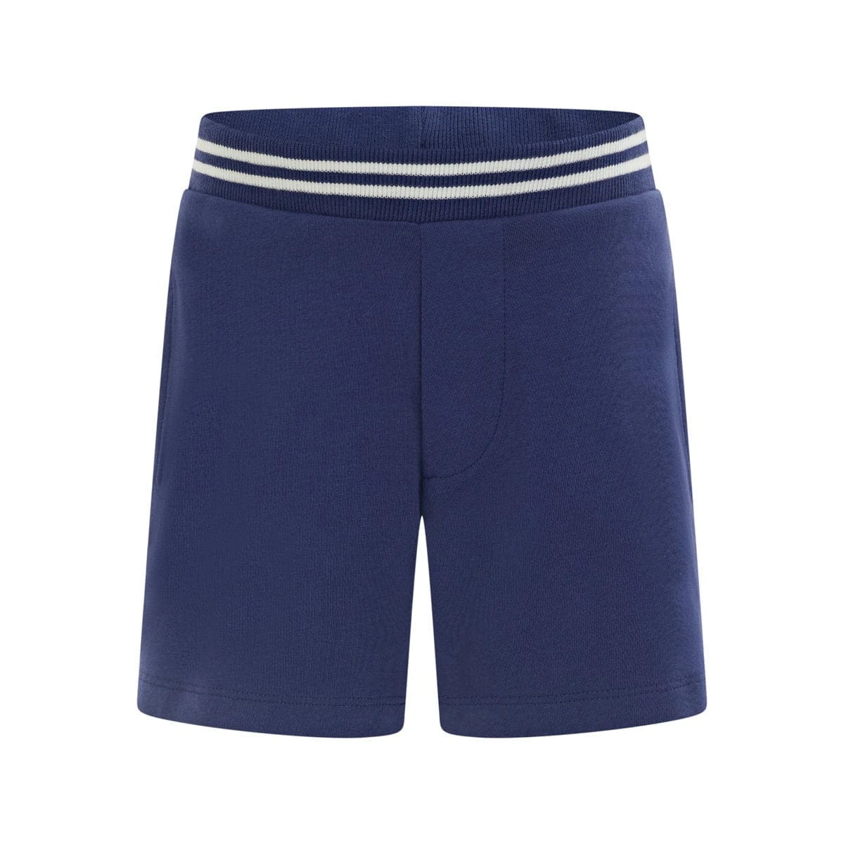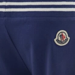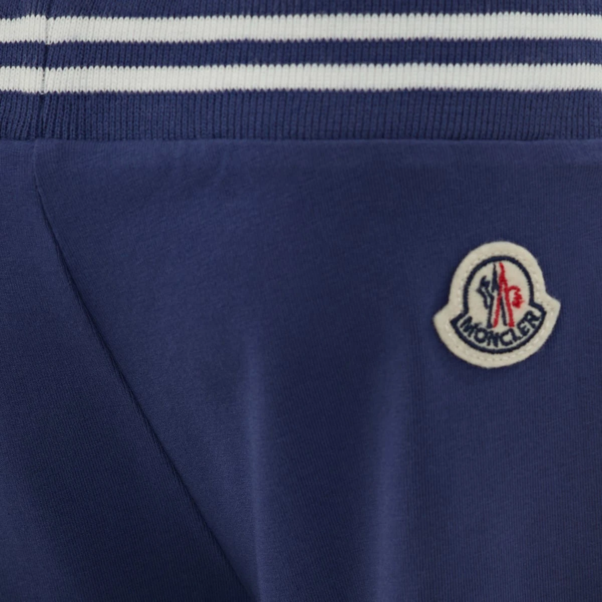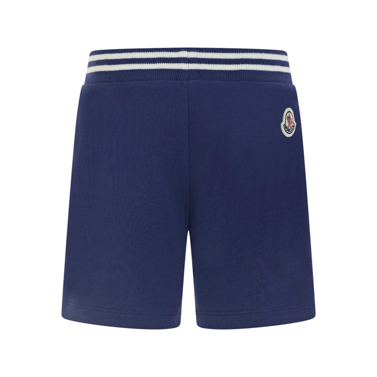 Moncler blue shorts with a striped elasticated waistband, side seam pockets and the logo tab on the reverse.