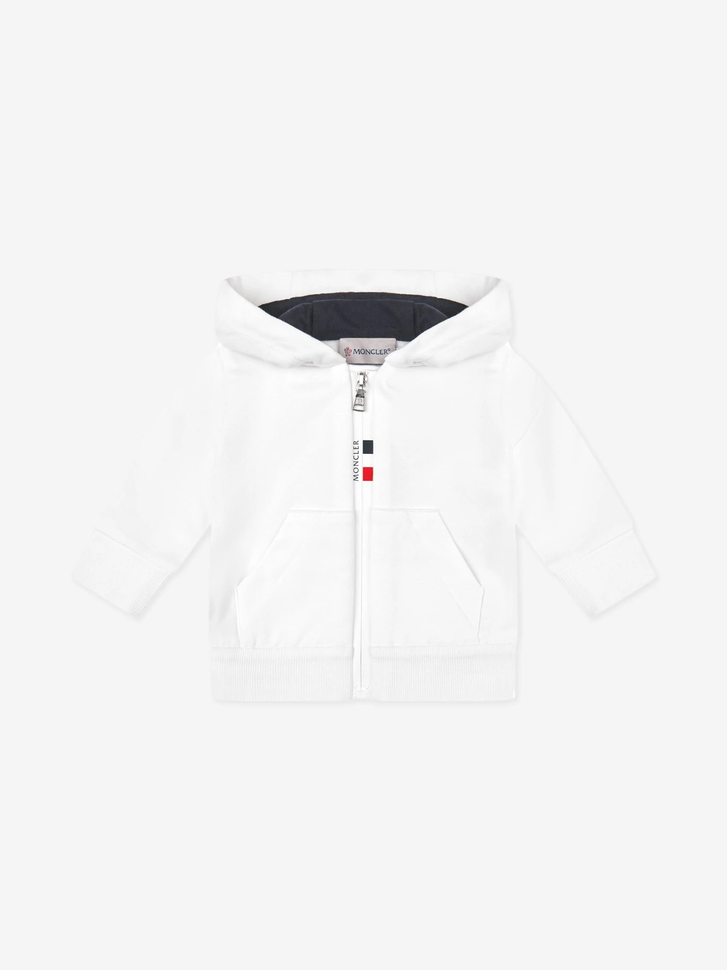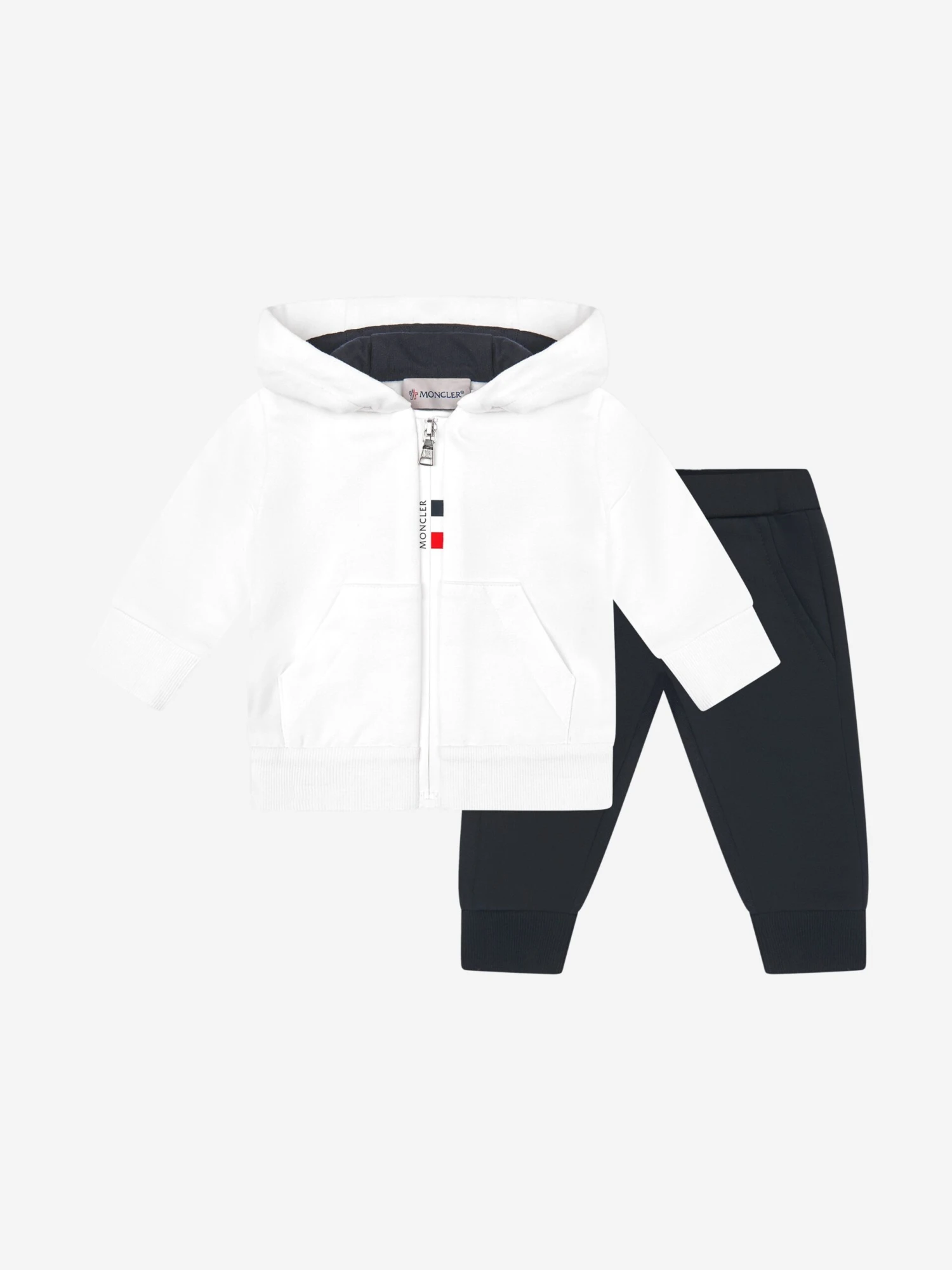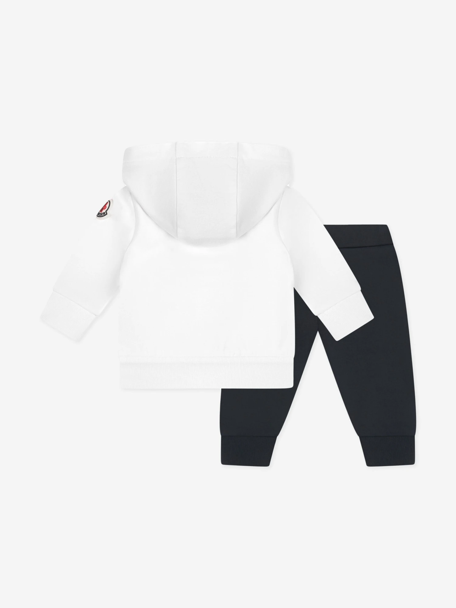 Keep your baby boy supremely comfy and stylish from his early days in this charming Moncler Enfant tracksuit. The luxurious two-piece is crafted from a soft and stretchy cotton jersey and inlcudes a white zip up top that comes with a pair of loose-fit navy joggers. Fitted with ribbed cuff details on the wrists and ankles and an elasticated waistband, this outfit will keep him cosy throughout the day.