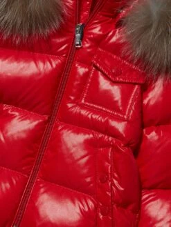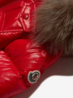 Alpine heritage meets urban living for this red K2 jacket for baby from Moncler. Built to withstand extreme demands, cosy down and feather padding provides elevated insulation in an attractive boudin-quilted laqué shell. A gorgeous tonal fox fur trim sits on the hood for an extra warm and luxurious touch.