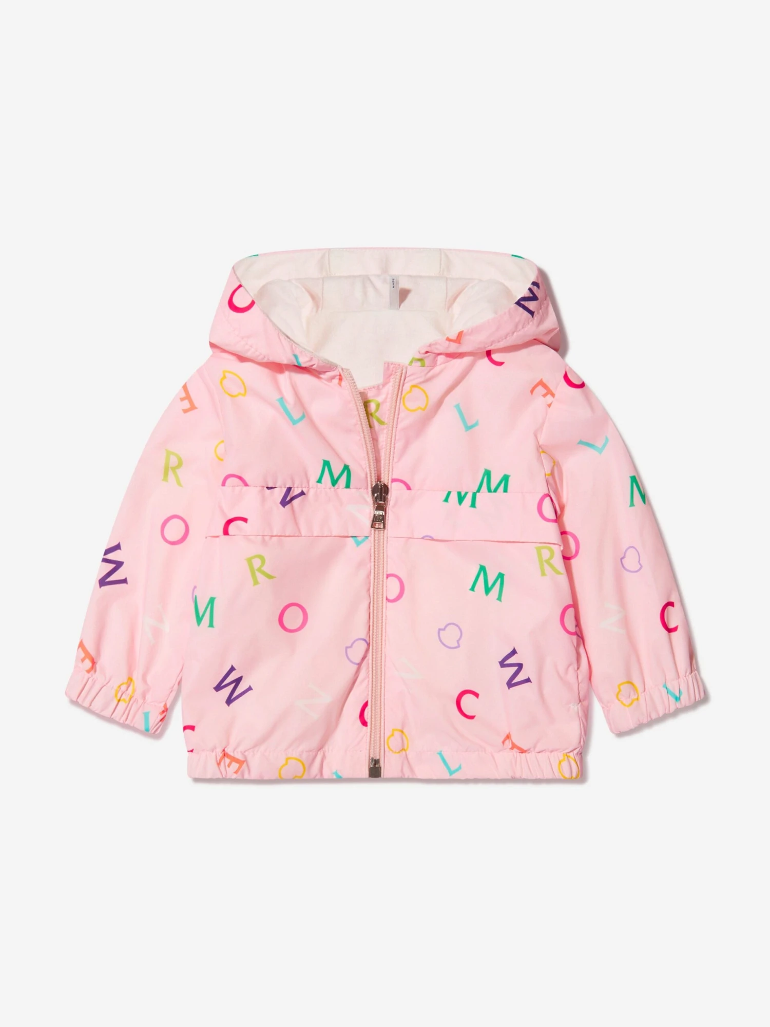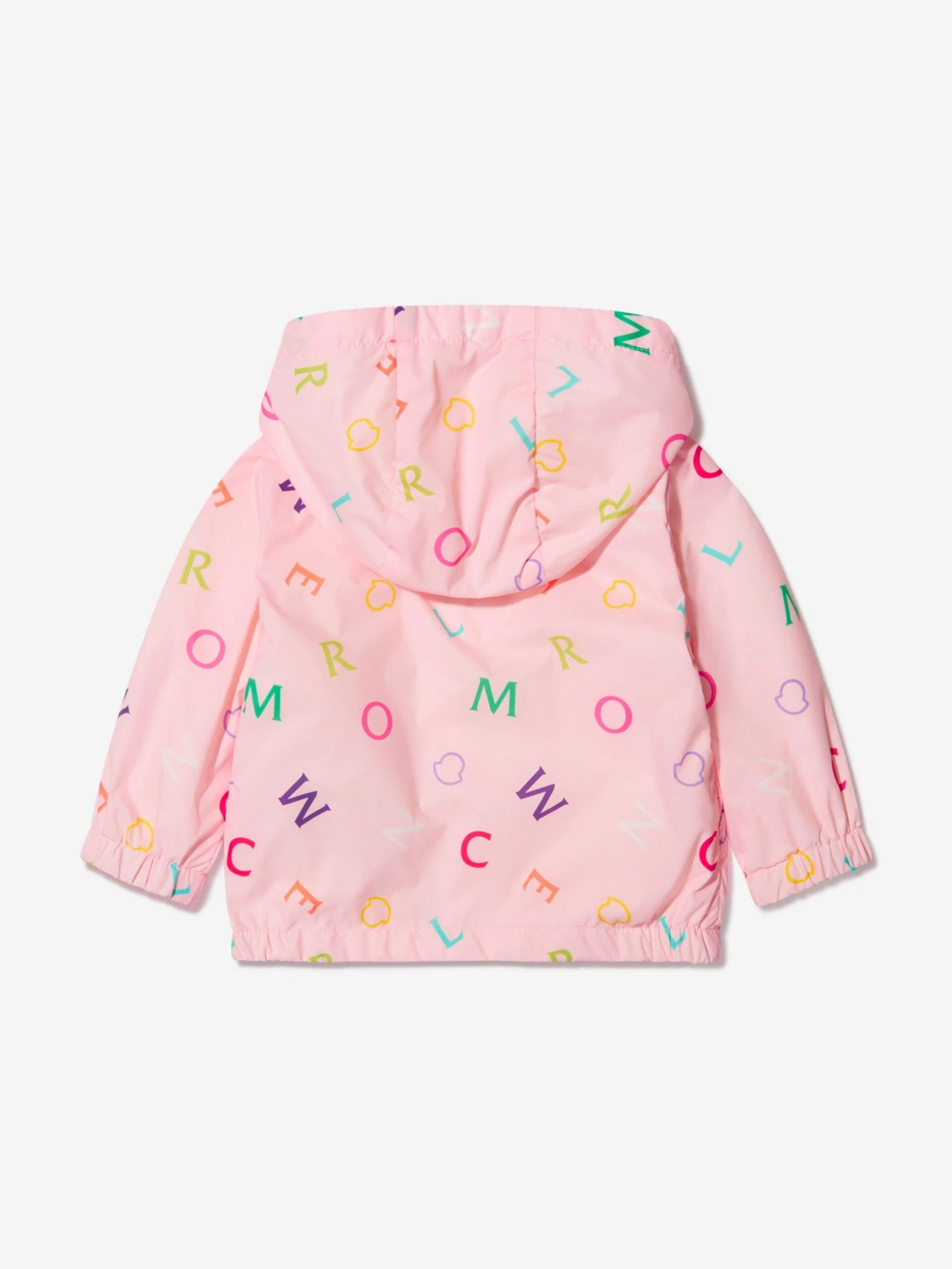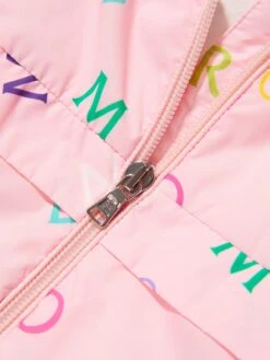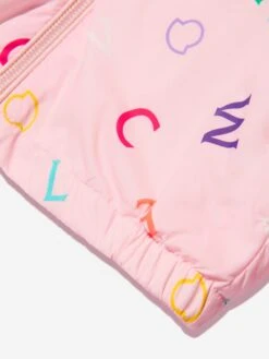 Light in weight, big on protection, this baby girls pink Anstey jacket from Moncler is a sweet and stylish solution for springtime strolls. Crafted from an easy-to-wear nylon, the soft cotton-lined piece is decorated with a delightful all-over, multi-hued logo print; with the iconic bade appliqué adorning the left sleeve. Perfect for cross-seasonal dressing.