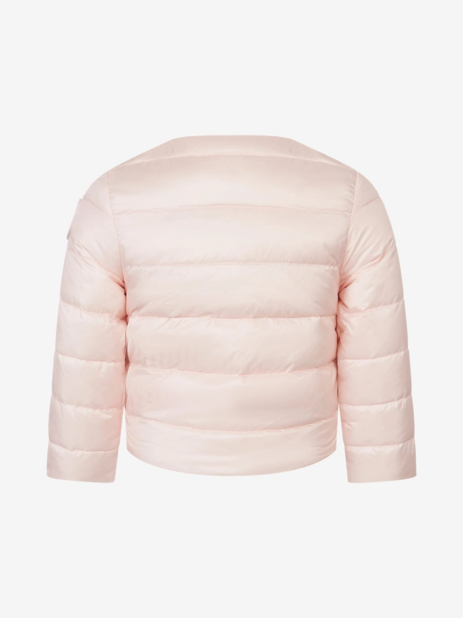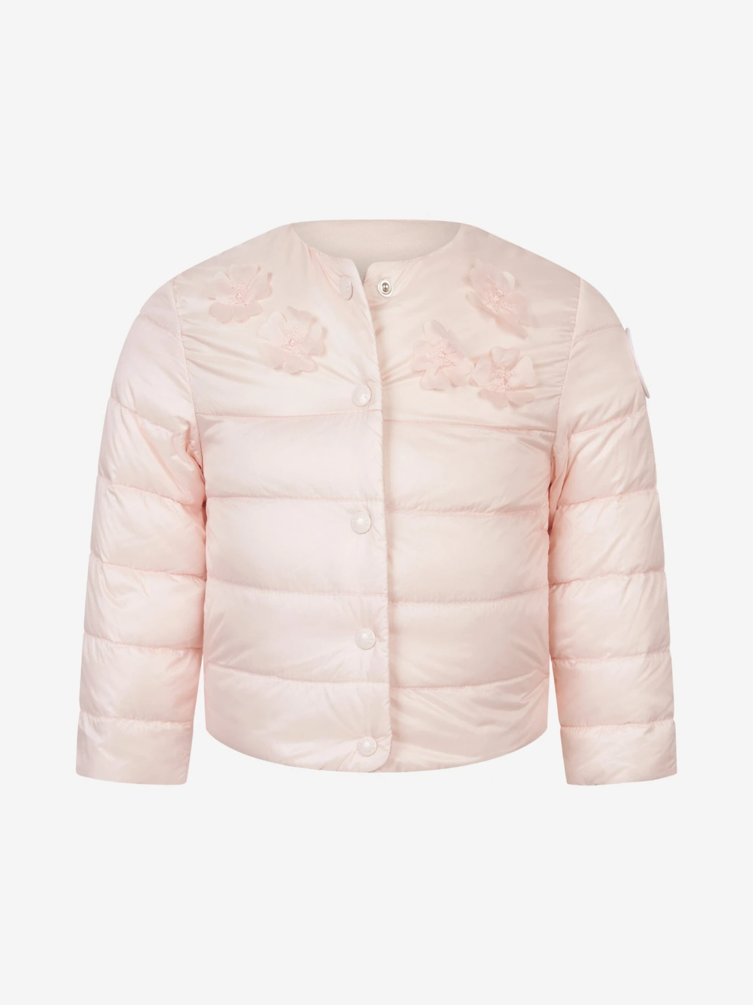 Wrap her up in luxury this winter in this baby girls’ Moncler Enfant jacket. The pale pink jacket is made from lightweight nylon and padded for extra warmth with a charming floral appliqué detailing around the neckline. Easy to use popper buttons fasten down the front and this designer jacket is finished with the iconic rubberised Moncler logo patch on the arm.