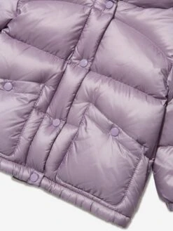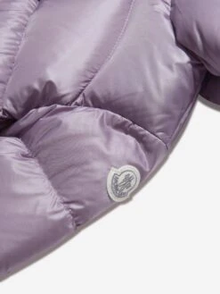 Offering an ultra-modern, minimalist energy, this baby girls lilac Bardanette jacket from Moncler is chic and weatherproof. The clean, feminine laqué piece is down padded for warmth and comfort, whilst a tonal felt logo badge adorns the left sleeve.