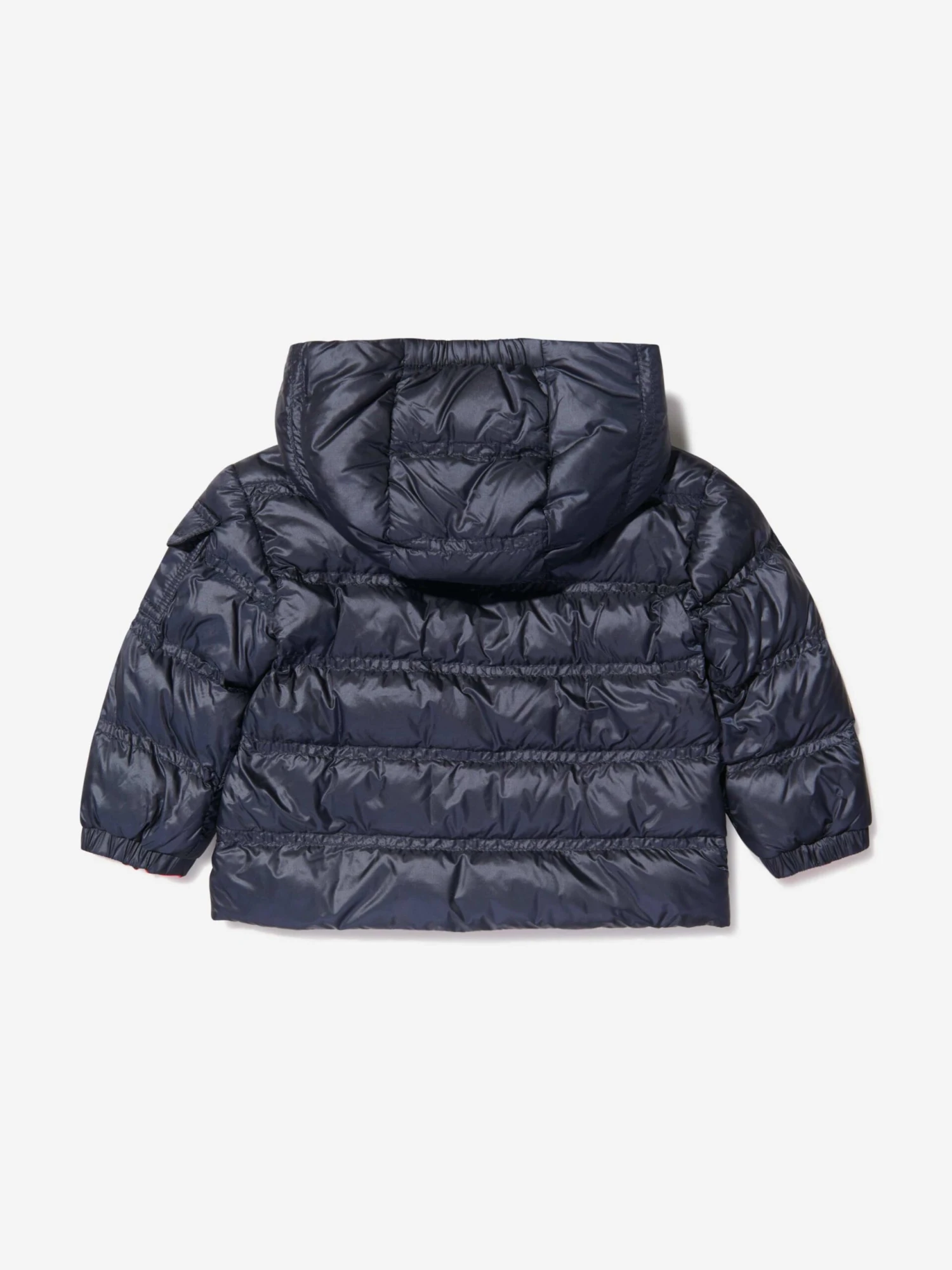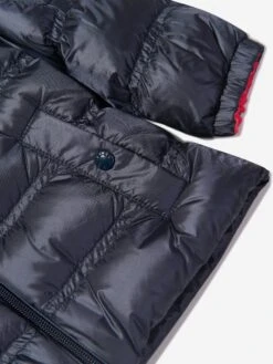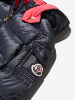 This Moncler navy blue puffer coat for girls is made in soft nylon legere. Padded with premium down filling and water repellent fabric. Features detachable hood, three pockets and front zip fastening for easy everyday dressing. Complete with high-quality press studs in gold and signature Moncler logo.