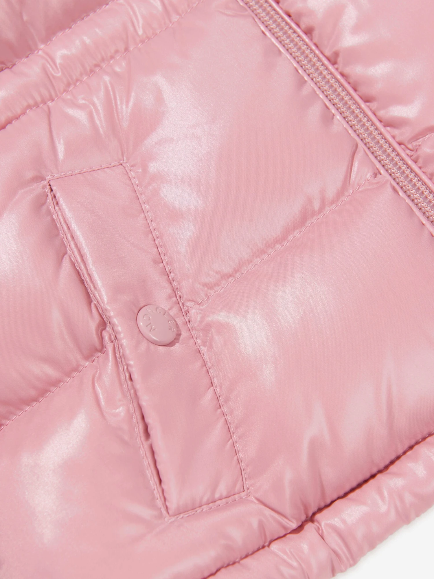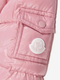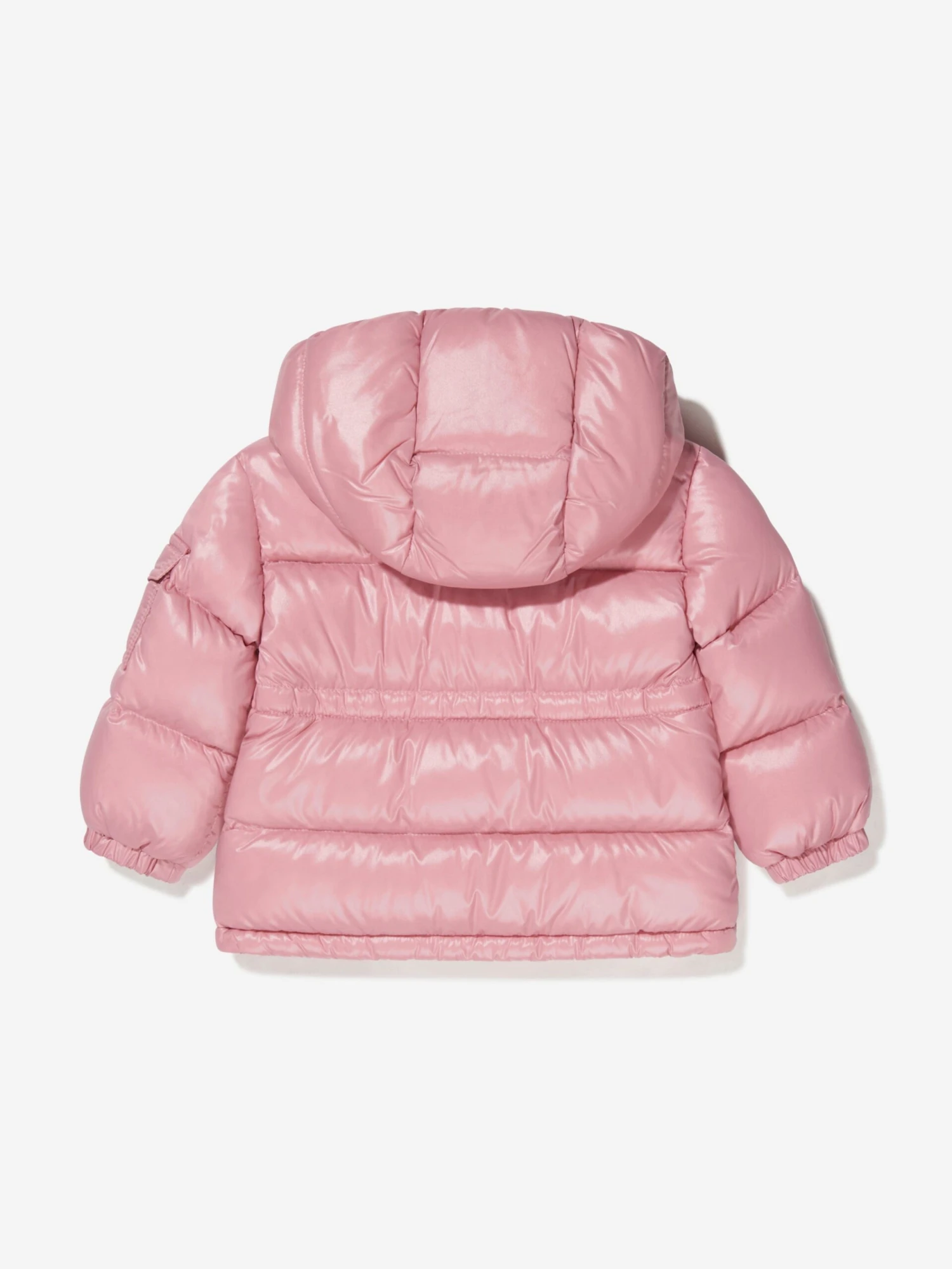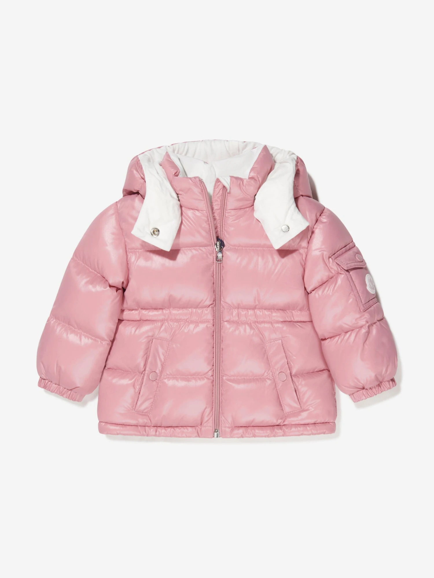 Alpine heritage meets city chic for this baby girls pink Maire jacket from Moncler. Built to withstand extreme demands, cosy down and feather padding provides elevated insulation in an attractive quilted laqué shell. A funnel collar and buttoned wind guard deliver extra protection from the elements with the piece finished with the iconic felt emblem sitting on the left sleeve.
