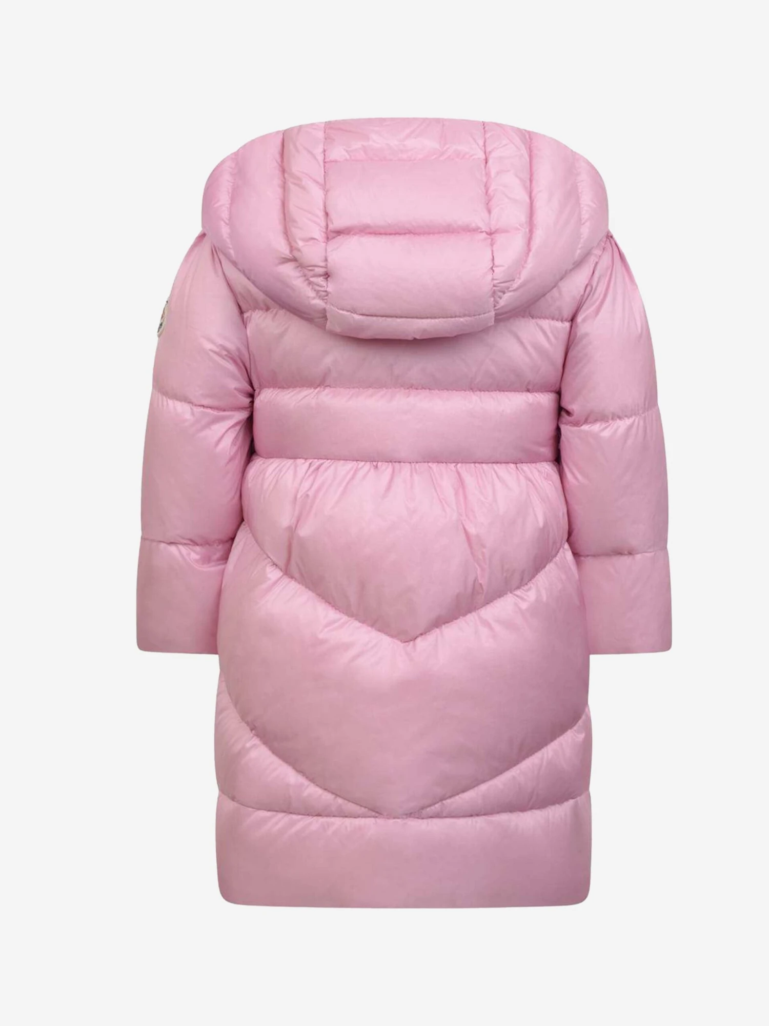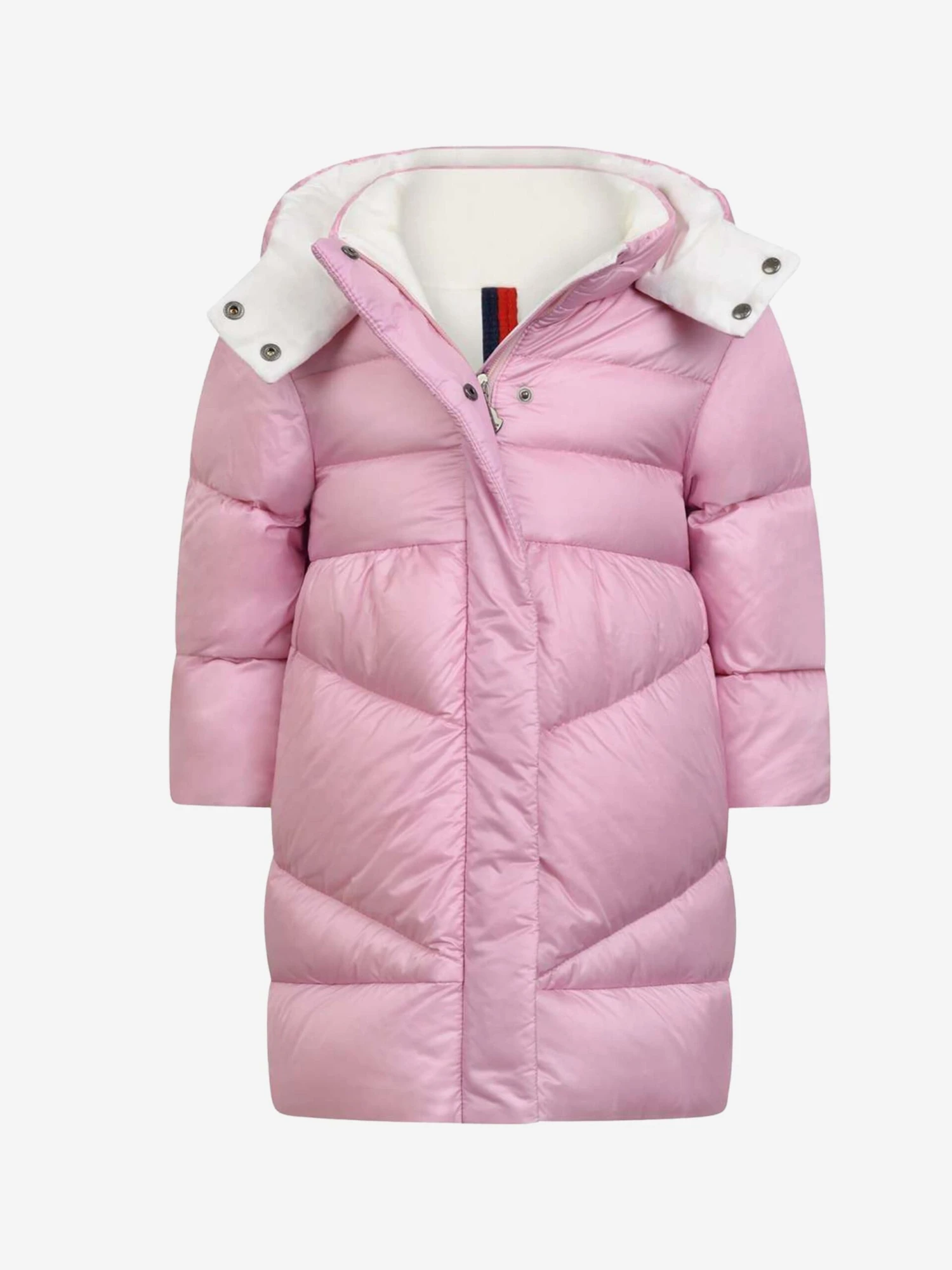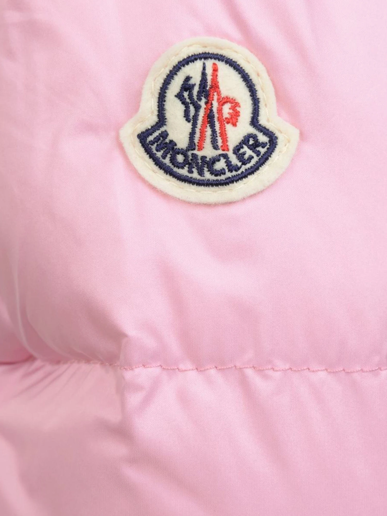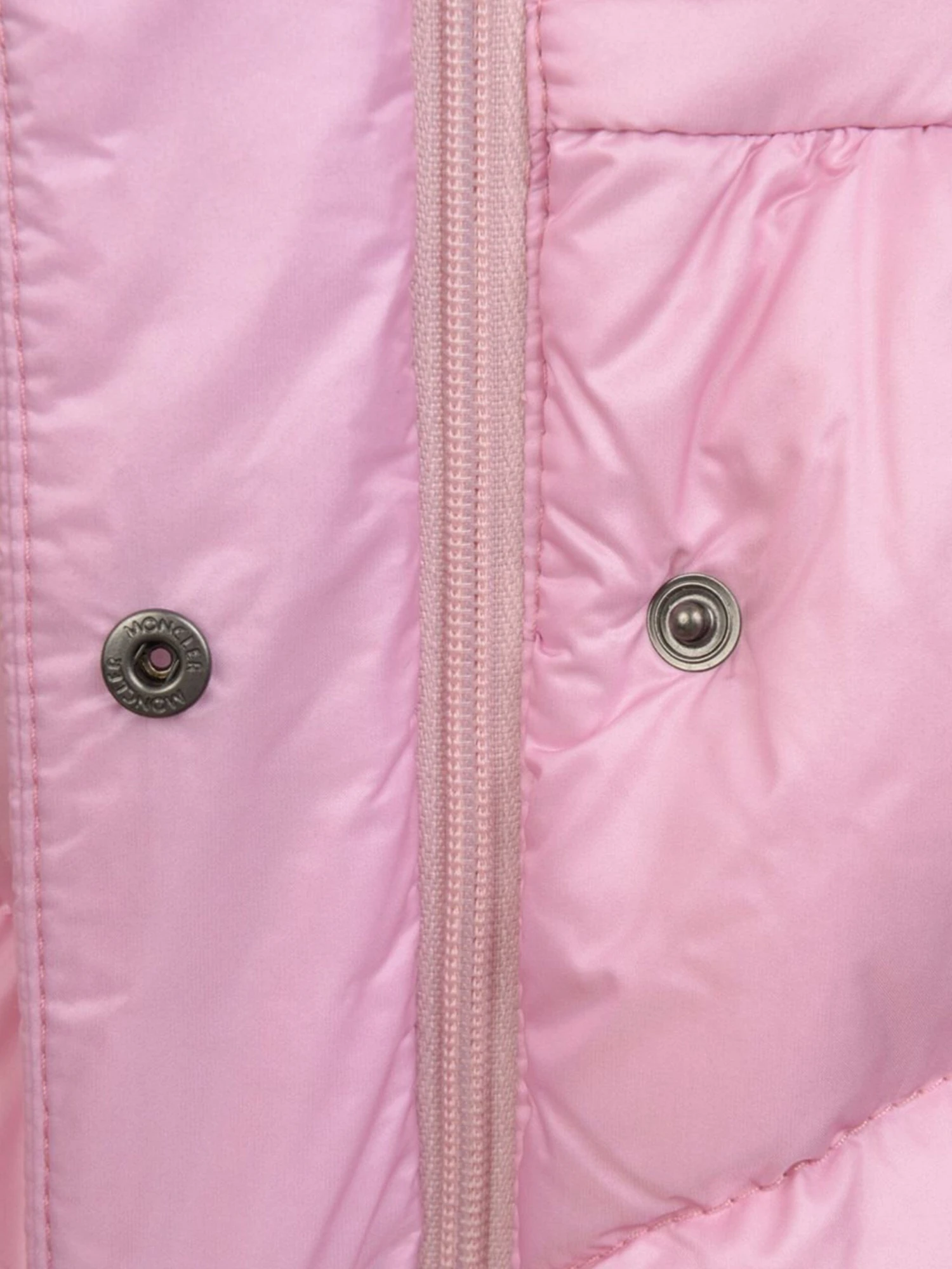 Moncler baby girls vegan coat in a pink hue with a detachable hood, logo patch on the sleeves, a press stud closure and concealed pockets on the seams.