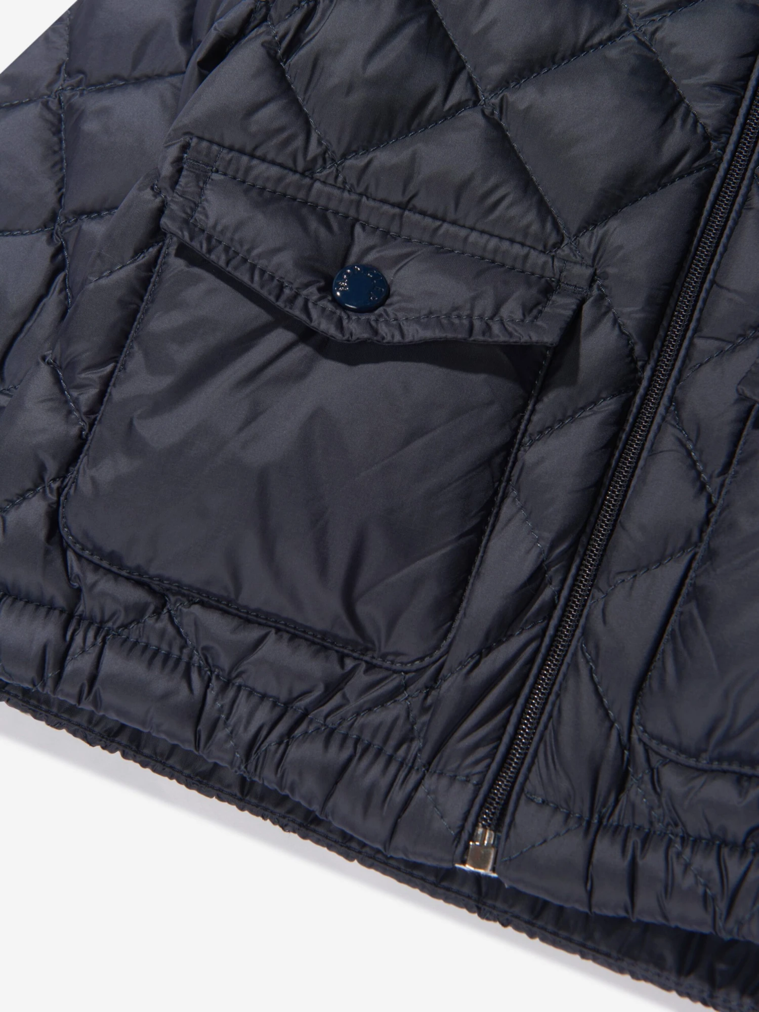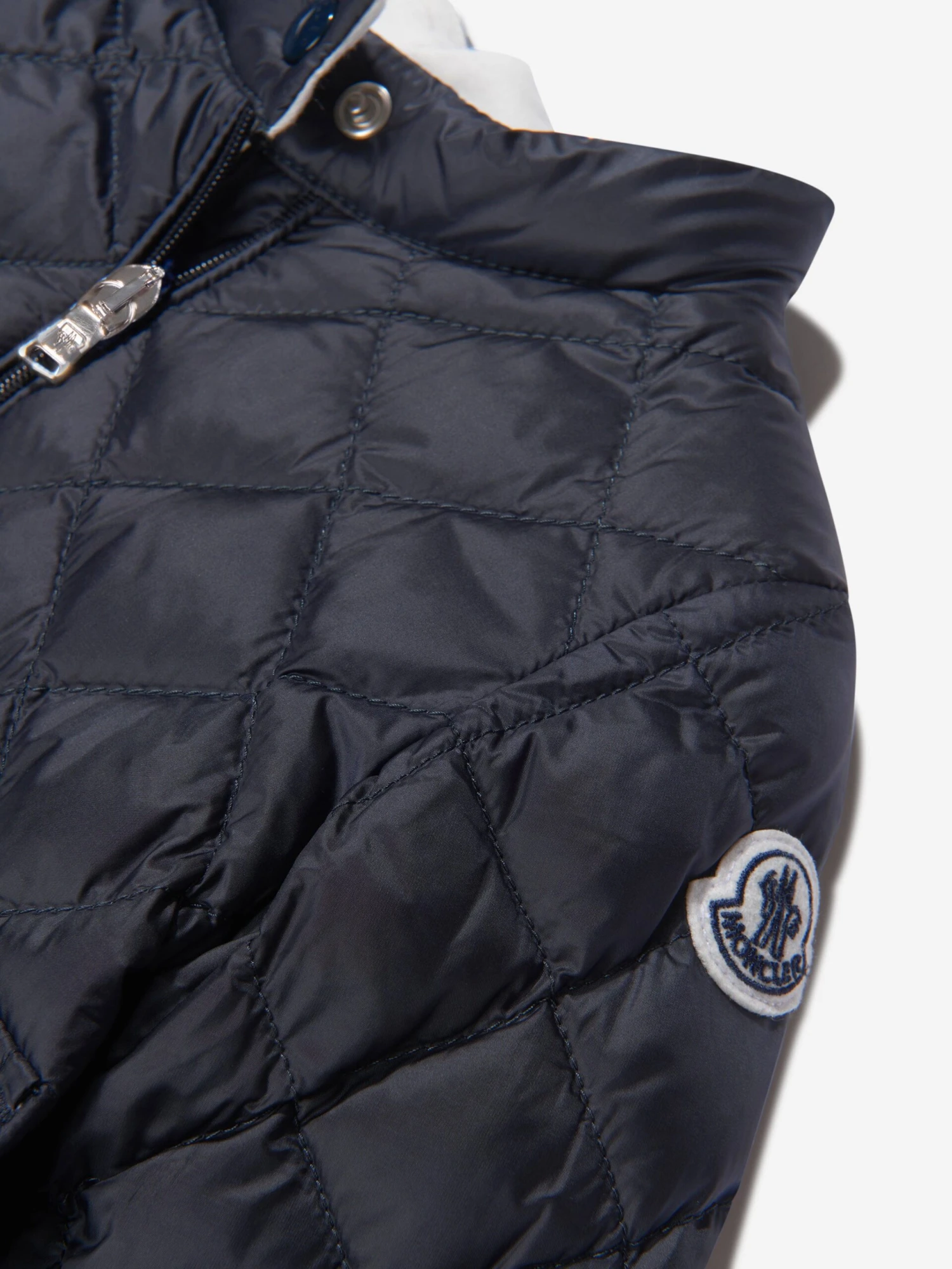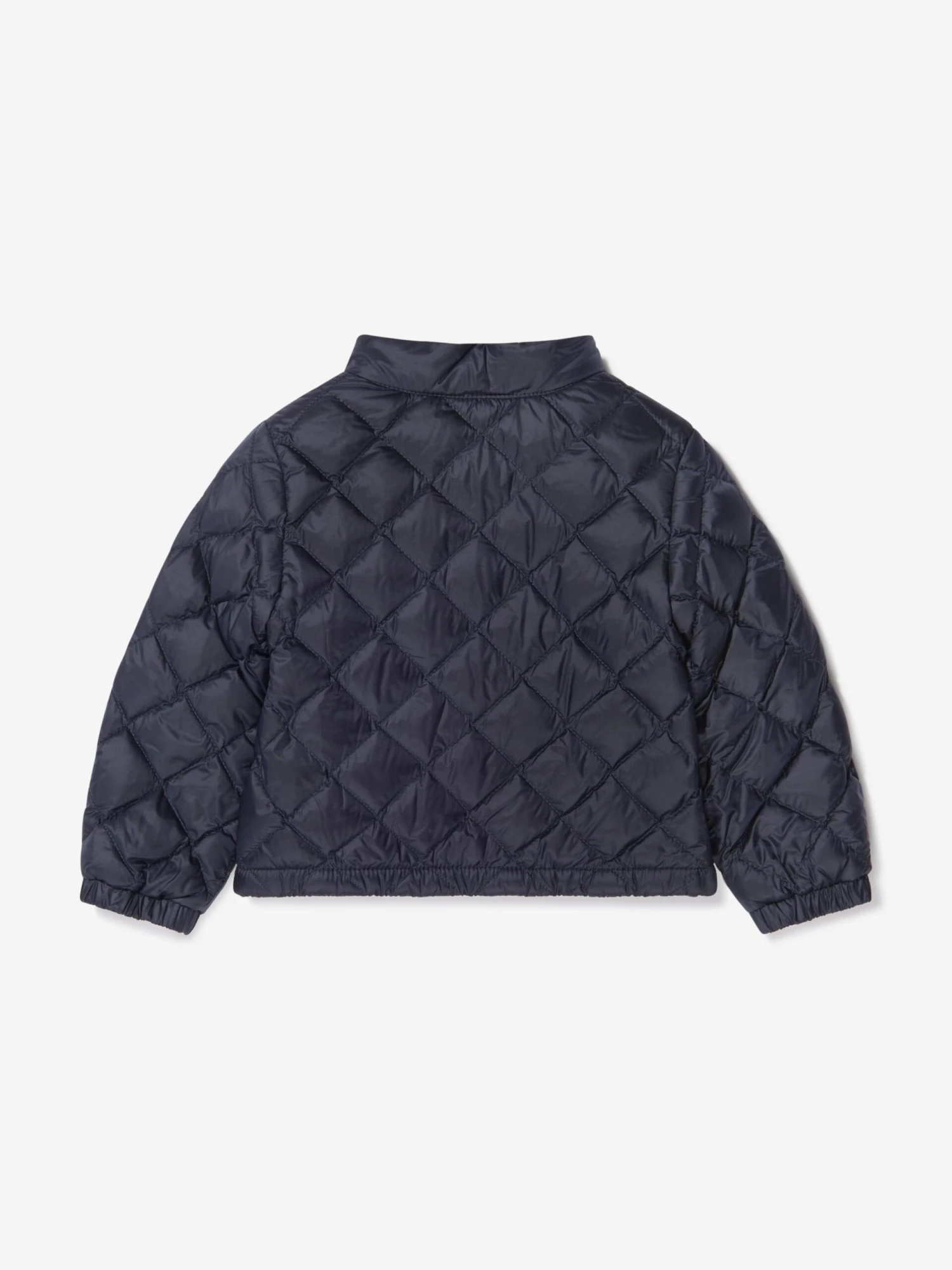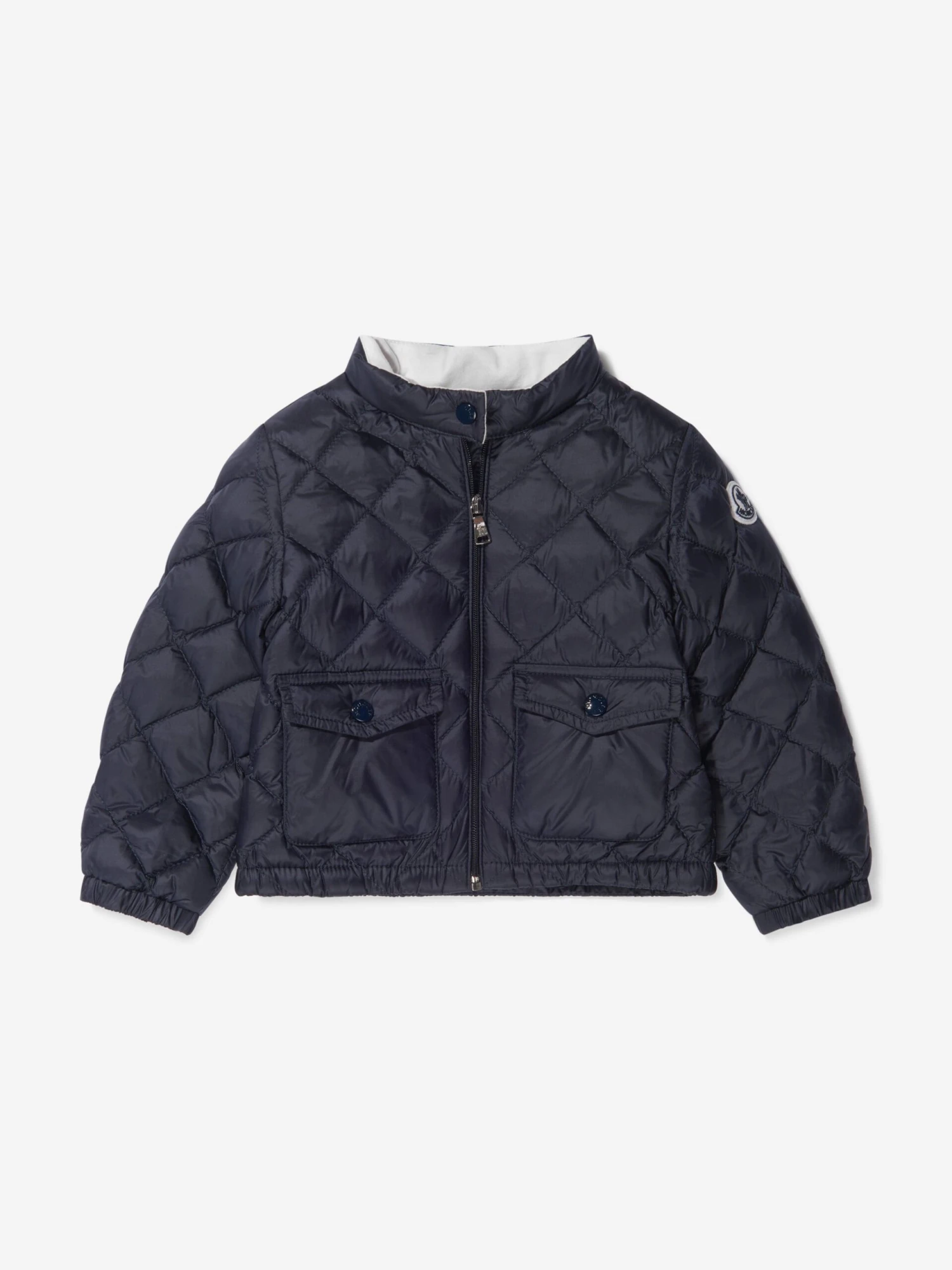A beautifully quilted jacket for baby girls, by luxury brand Moncler Enfant. Luxuriously padded in lightweight down, this water repellent jacket has the brand’s iconic felt logo badge on one sleeve, cute popper fastening front pockets, and a cotton lining for comfort. A concealed hood is folded into the hood.