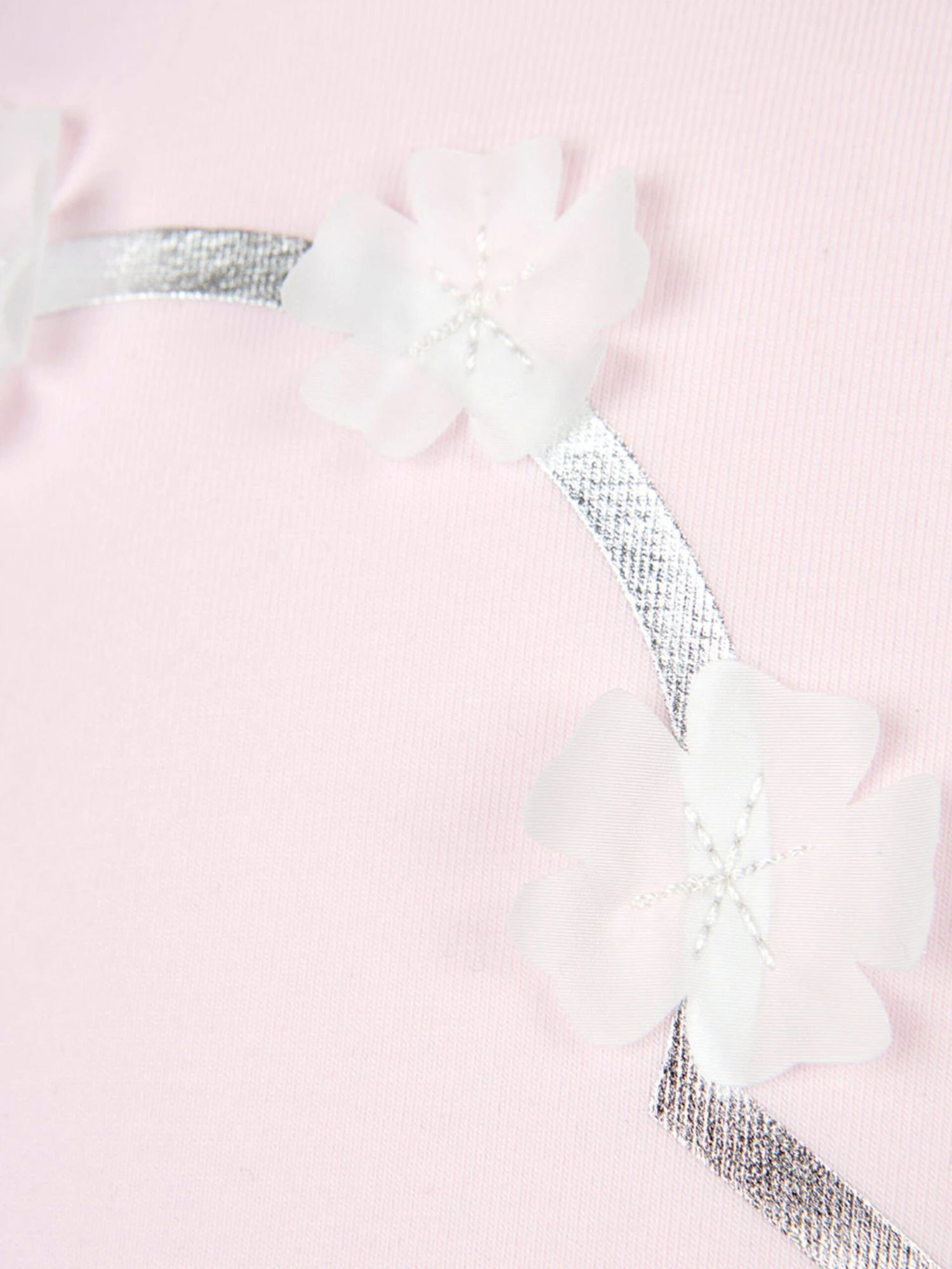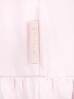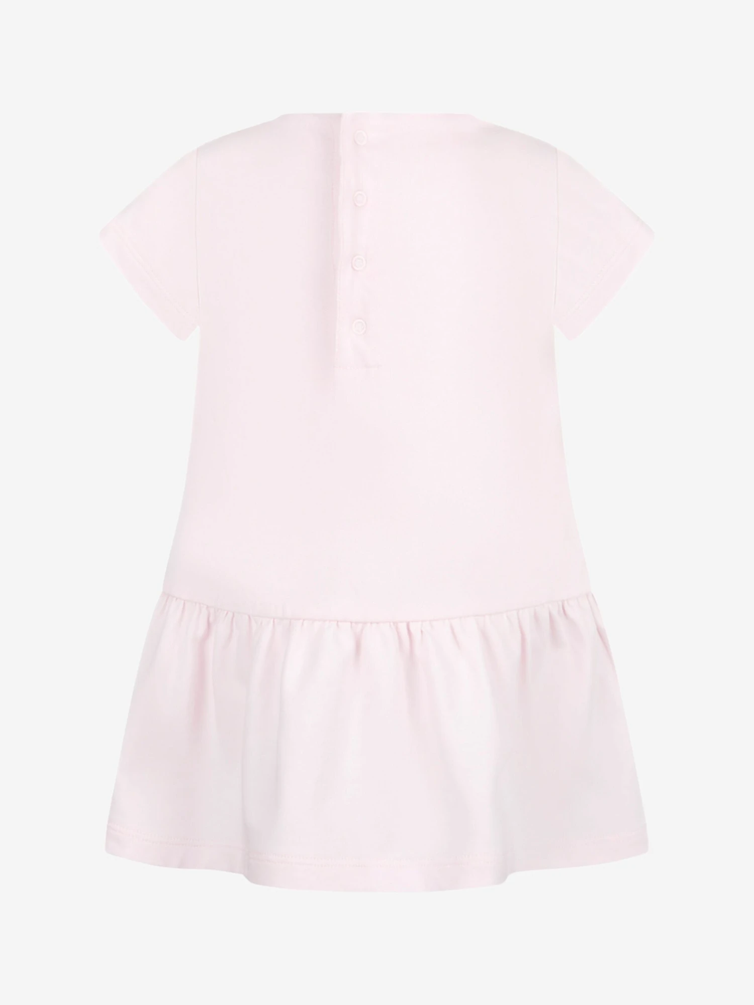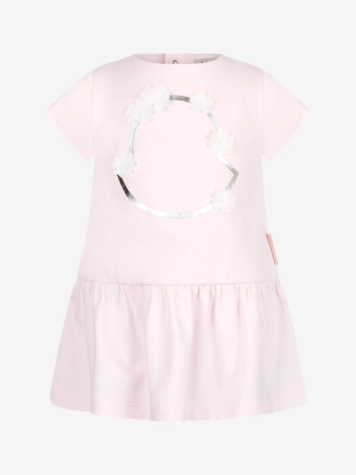 A charming little dress for your baby girl by the French designer Moncler Enfant. The pale pink summer dress is made from soft and stretchy cotton that will ensure her comfort throughout the day and boasts a simple t-shirt bodice with a lovely full skirt. The iconic luxury logo in silver decorates the front of this pretty dress and is further complemented with white appliqué flowers around it.