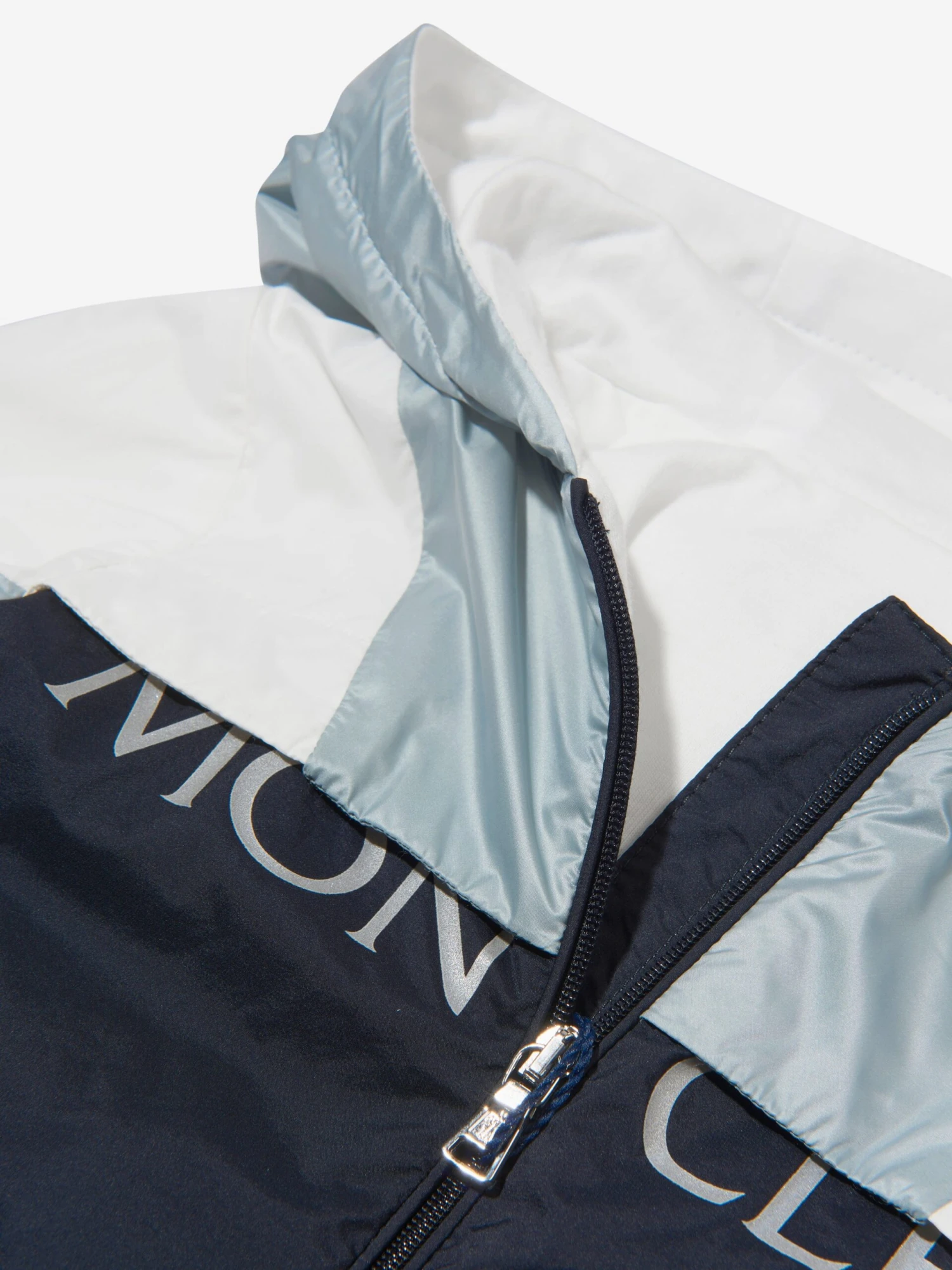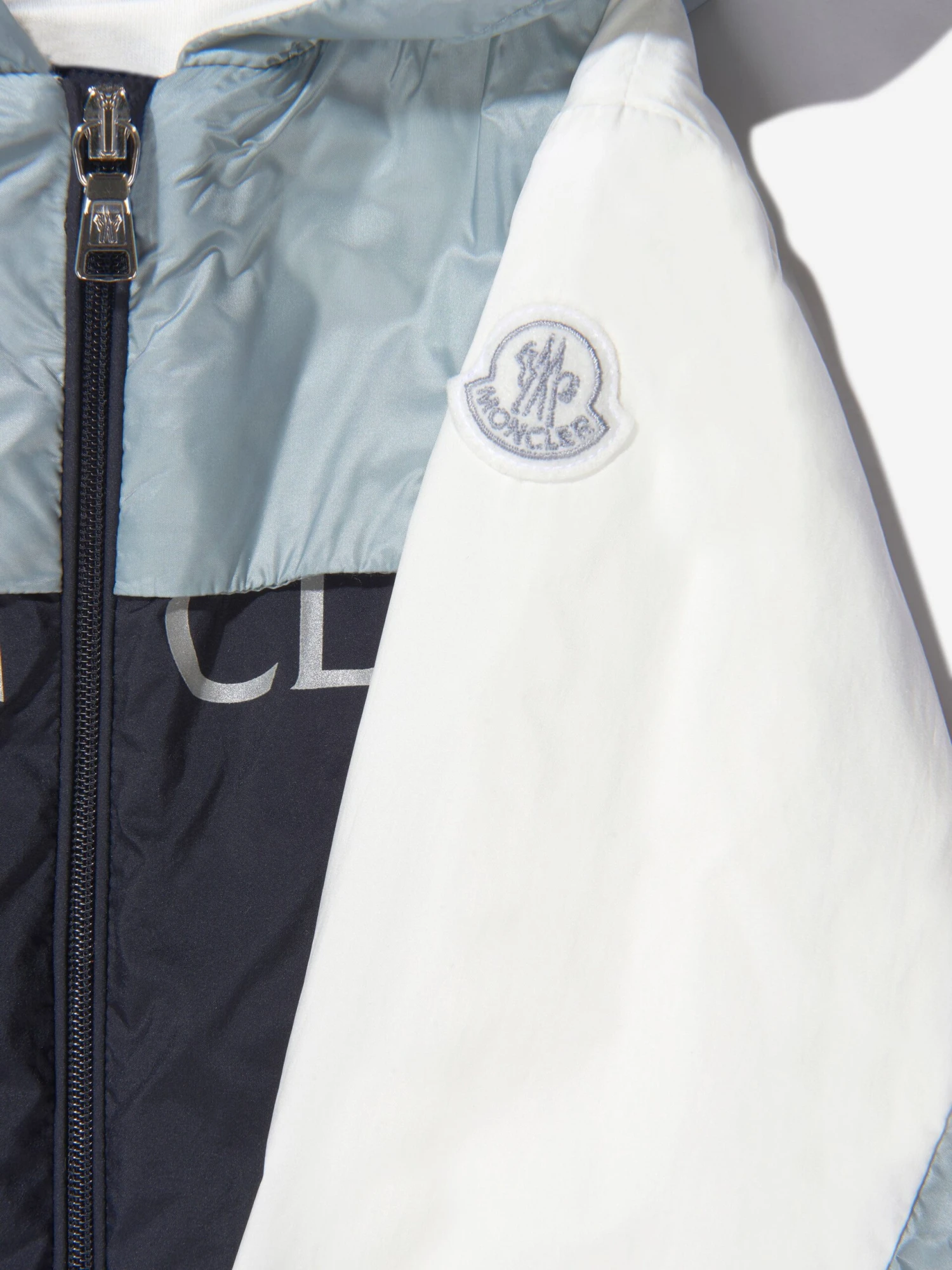 A lovely jacket for baby boys from Moncler Enfant. Made in white and navy accent patches to the hood and neckline, as well as down the sides for a cool contrast. The brand name logo is written across the chest in grey, and the jacket fastens to the centre front with a navy zipper. The cuffs and hemline are elasticated to ensure protection from the elements. The iconic brand logo patch sits to the left arm.