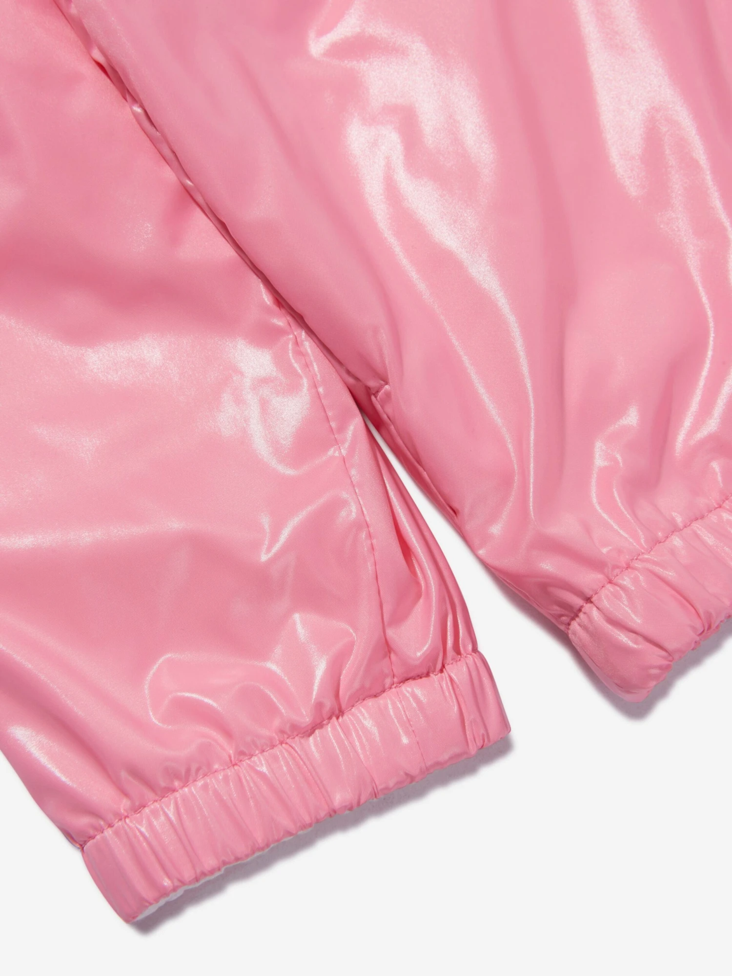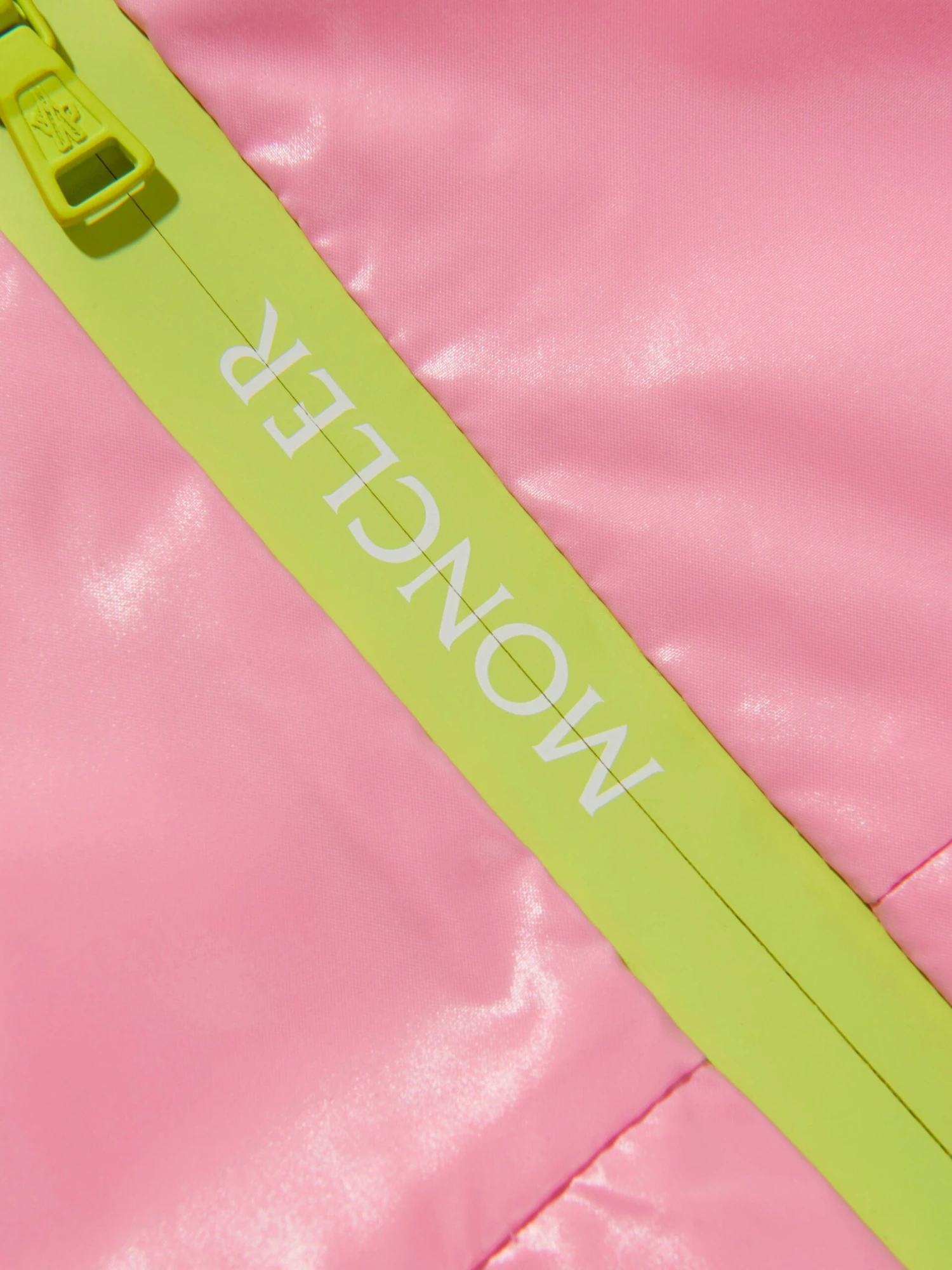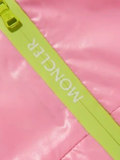 Candy pink hooded windbreaker jacket for little girls by luxury brand Moncler Enfant. Made in silky nylon with a lovely sheen, there are concealed front pockets, elasticated trims, and a contrast pale green zip fastening with a white logo print. Lined with soft and comfortable cotton jersey, the designer’s logo tab is stitched onto the side seam.