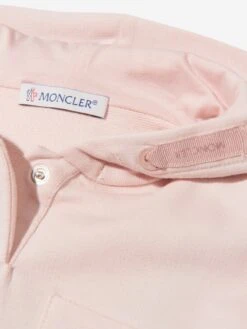 Moncler enfant dusky pink hooded dress for little girls by luxury French brand Moncler enfant. The bodice is made in lightweight cotton sweatshirt jersey and the skirt is in soft and silky nylon. the neck has a single popper fastening and the brand’s iconic felt logo patch on one sleeve. There is logo ribbon detailing on the hood, which is lined in a soft jersey.