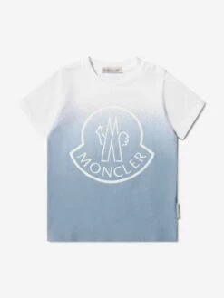 Cute and casual white and blue ombré t-shirt by luxury French brand Moncler Enfant. Made in soft cotton jersey, it has the brand’s signature logo printed on the front in white, and popper fastenings on one shoulder.