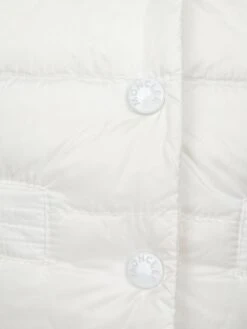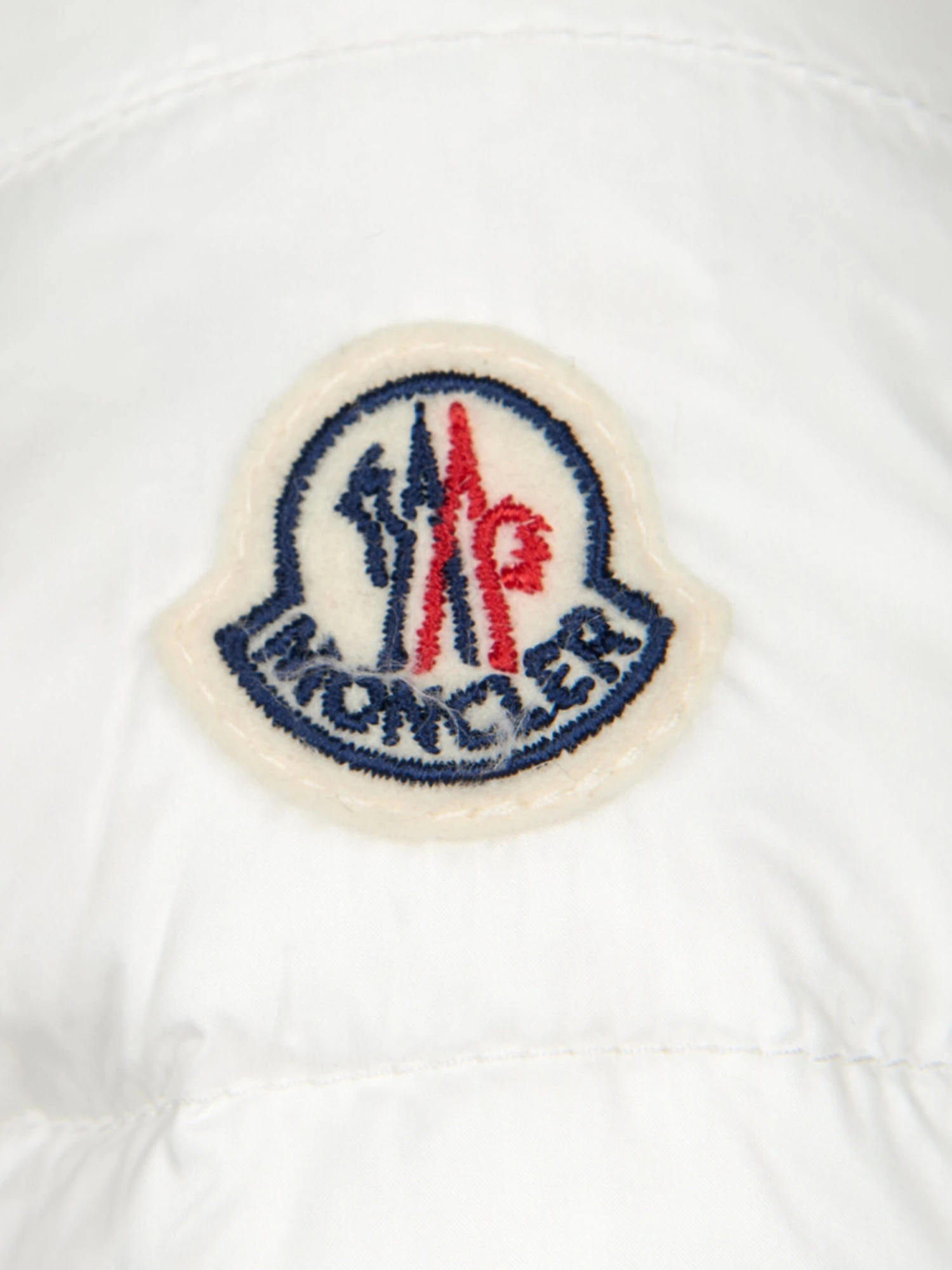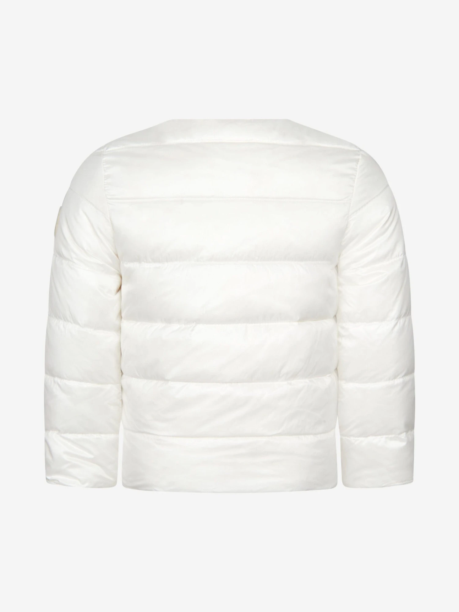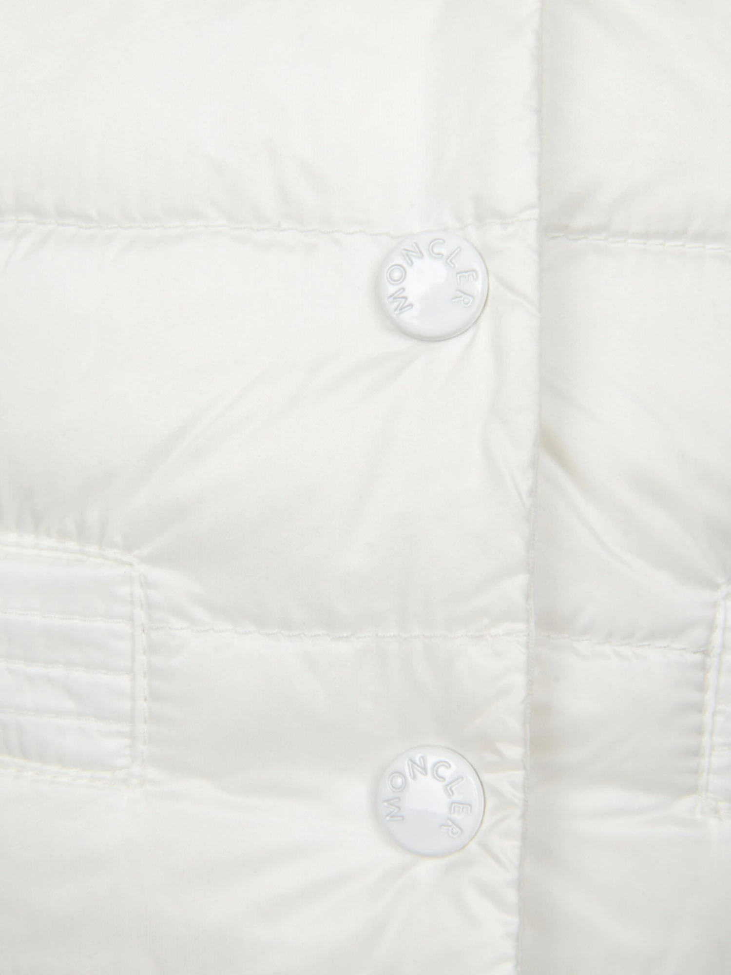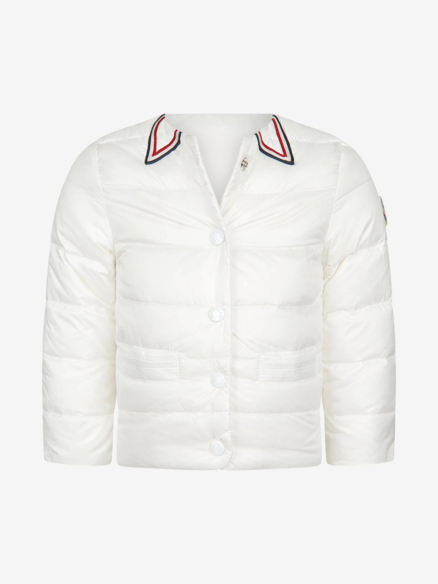 Bundle up your little one in luxury in this baby girls’ jacket by the French designer Moncler Enfant. The fresh white padded jacket is made from soft and lightweight nylon filled with warm down for extra cosiness on those wintry days. Every detail has been stylishly taken care of from the colour-matched metal branded poppers to the red, white and navy trimmed collar detail that completes this exquisite piece of outerwear.