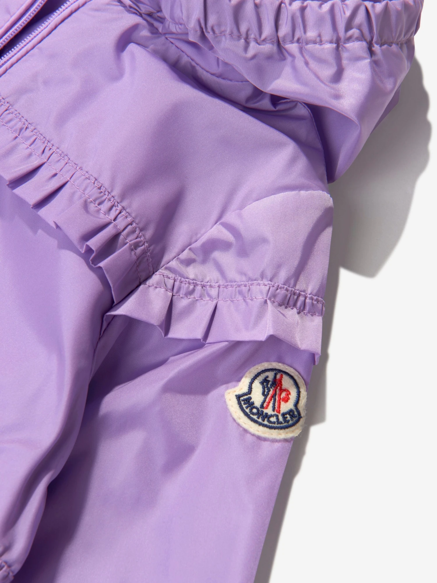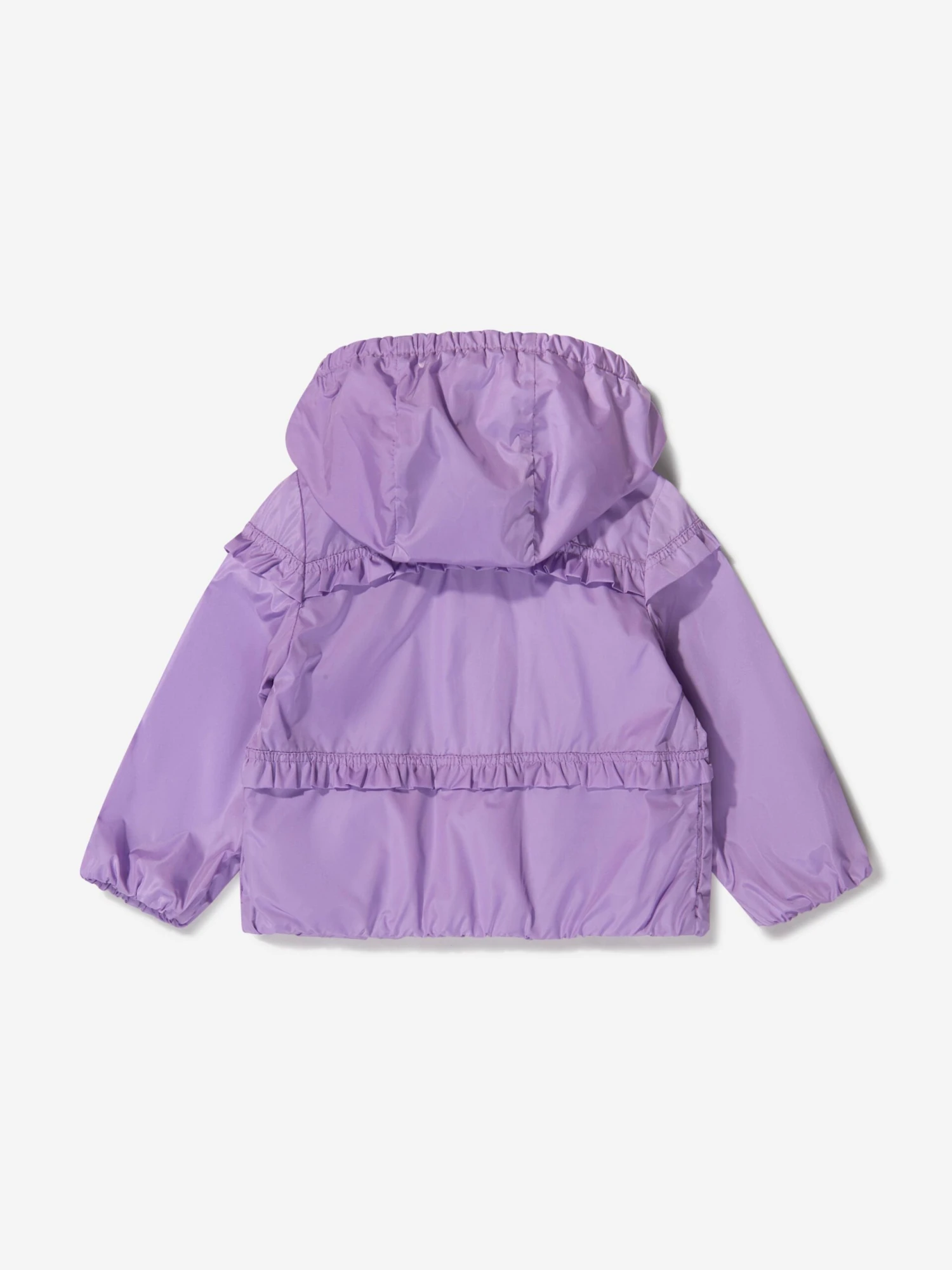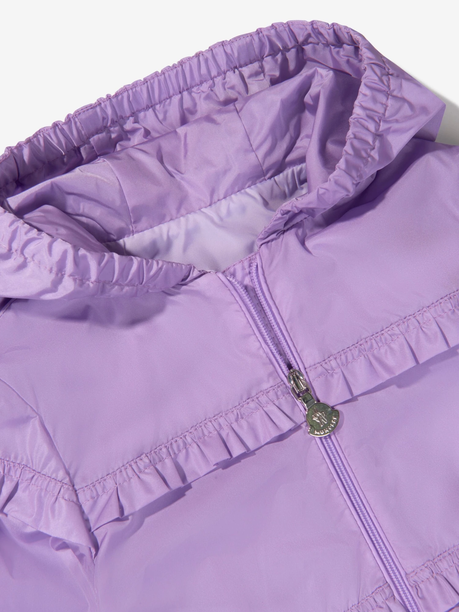 Pretty lilac ruffle-trim hooded jacket from Moncler Enfant featuring logo patch at the sleeve, ruffled trim, classic hood, front zip fastening, long sleeves, elasticated cuffs and elasticated hem.