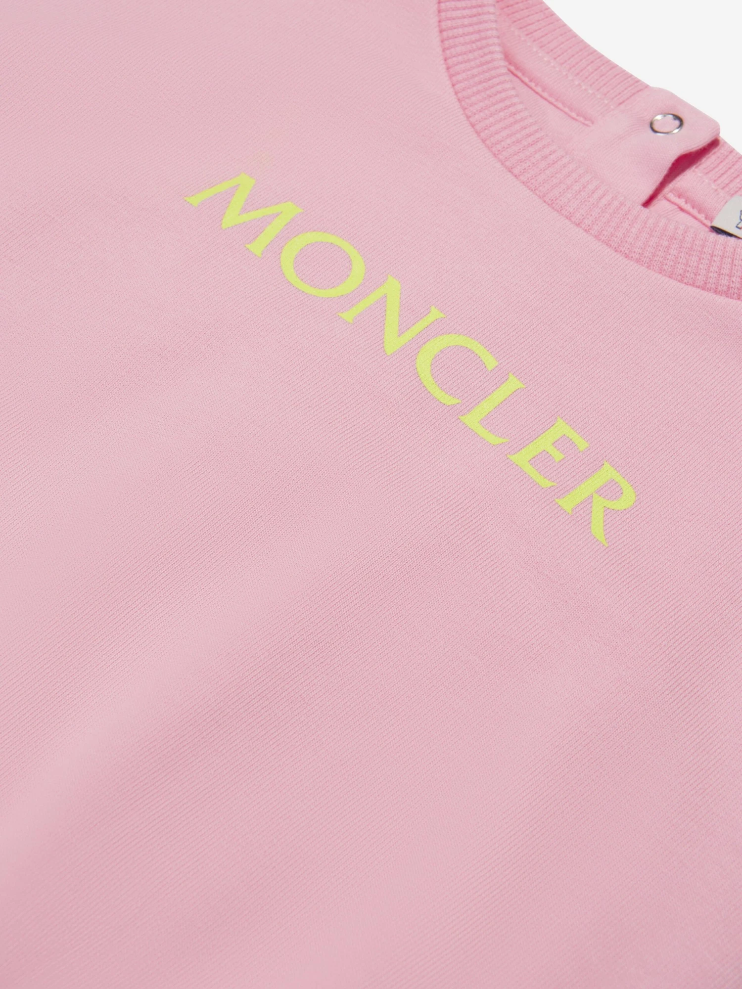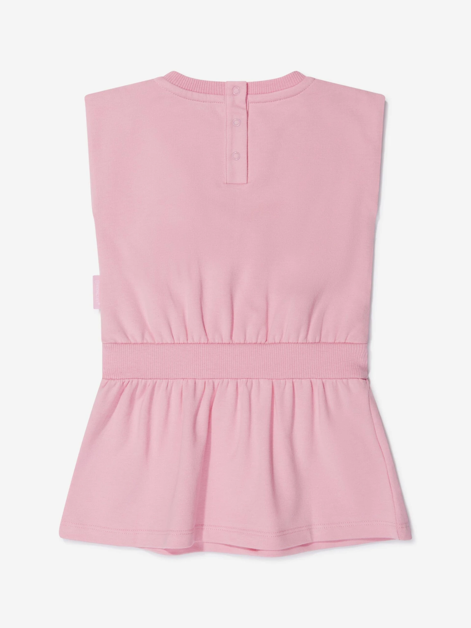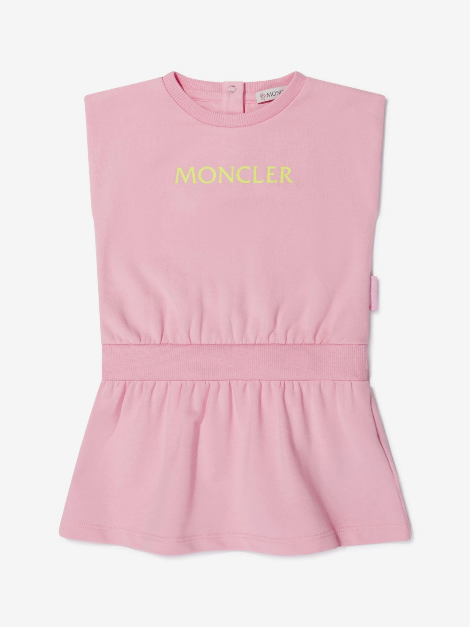 Pretty pink sleeveless dress by luxury French brand Moncler Enfant. Made in soft cotton jersey, it has the brand’s iconic logo printed on the chest in lime green, and a casual elasticated waist.