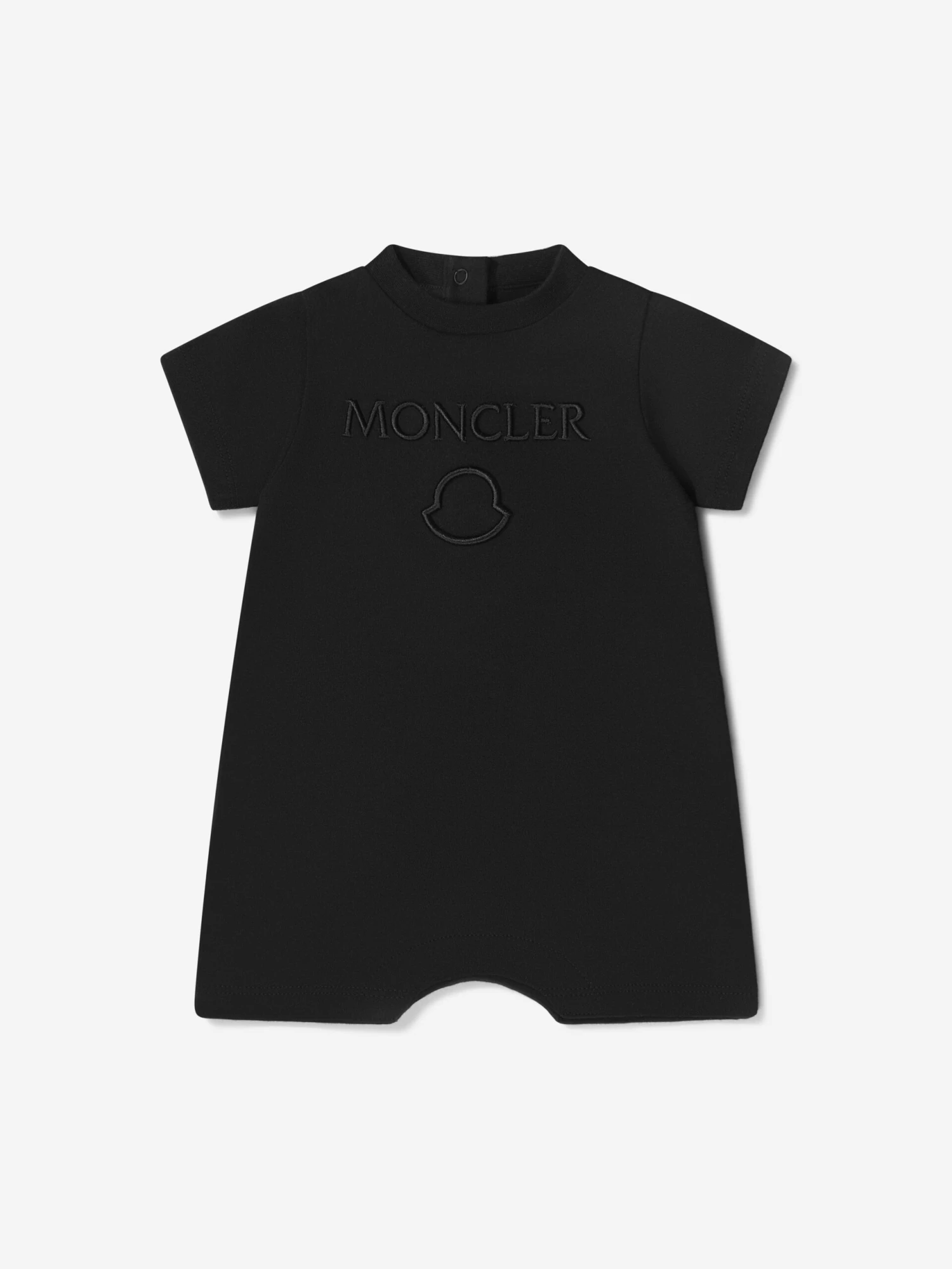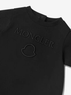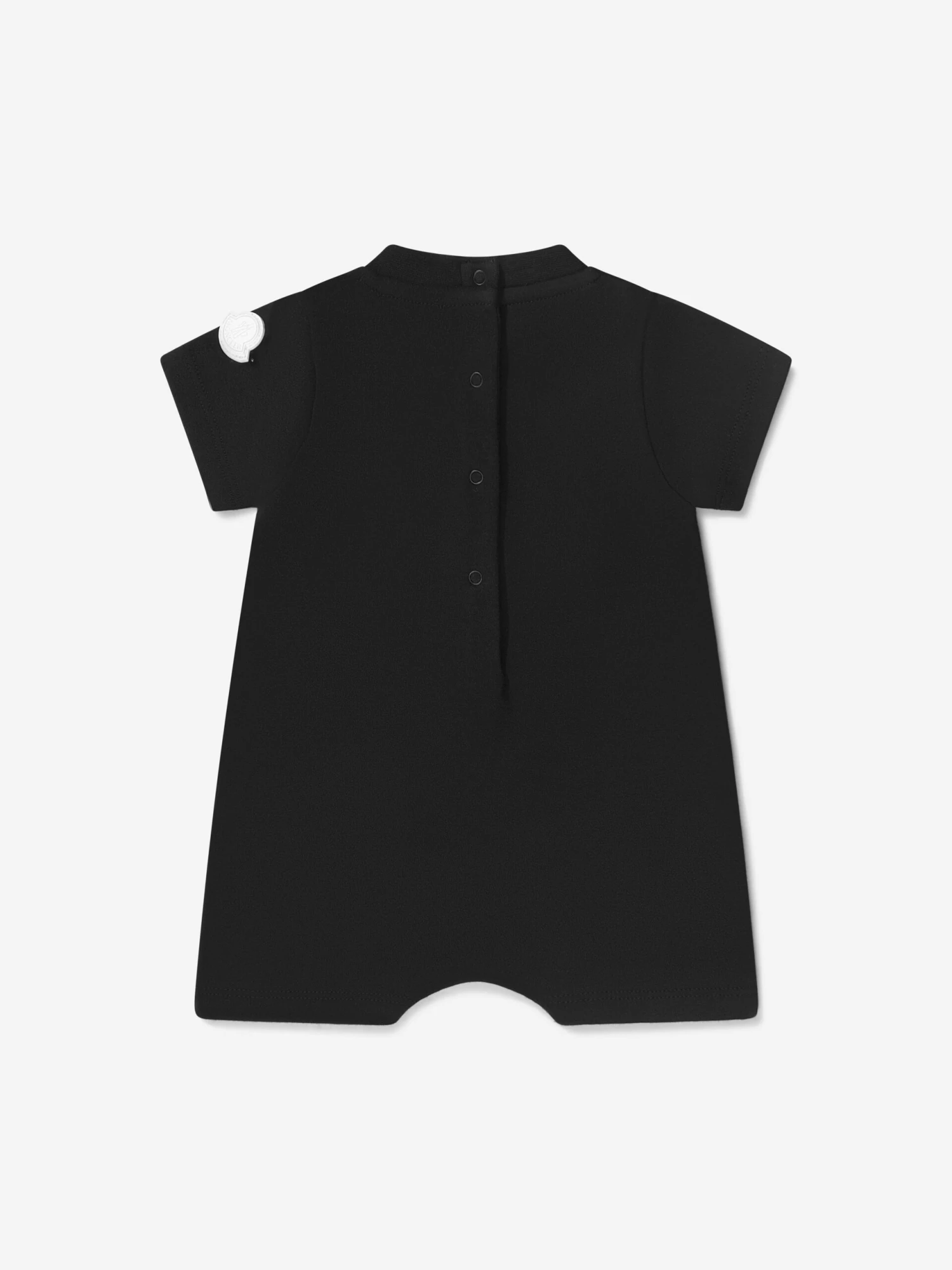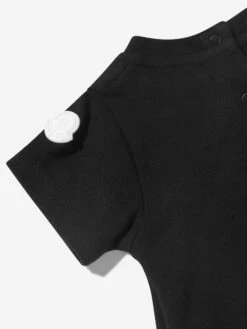 Black romper for baby boys and girls, by luxury French brand Moncler Enfant. Made in soft cotton jersey, it has the brand’s signature logo embroidered on the chest in black and a rubberised logo badge in white on one sleeve.