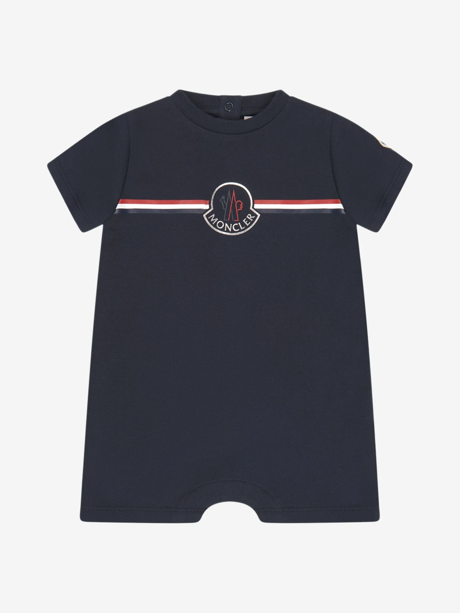 Cool and comfy, dress up your your little one in luxury with this babys’ shortie romper by Moncler Enfant. Made from soft and stretchy cotton, this charming all-in-one in navy boasts a relaxed fit with a simple t-shirt design on the top half and loose-fit shorts on the bottom. A stylish red, white and navy trim detail runs across the chest with the iconic logo in the centre and a popper opening at the back completes this beautiful designer piece.