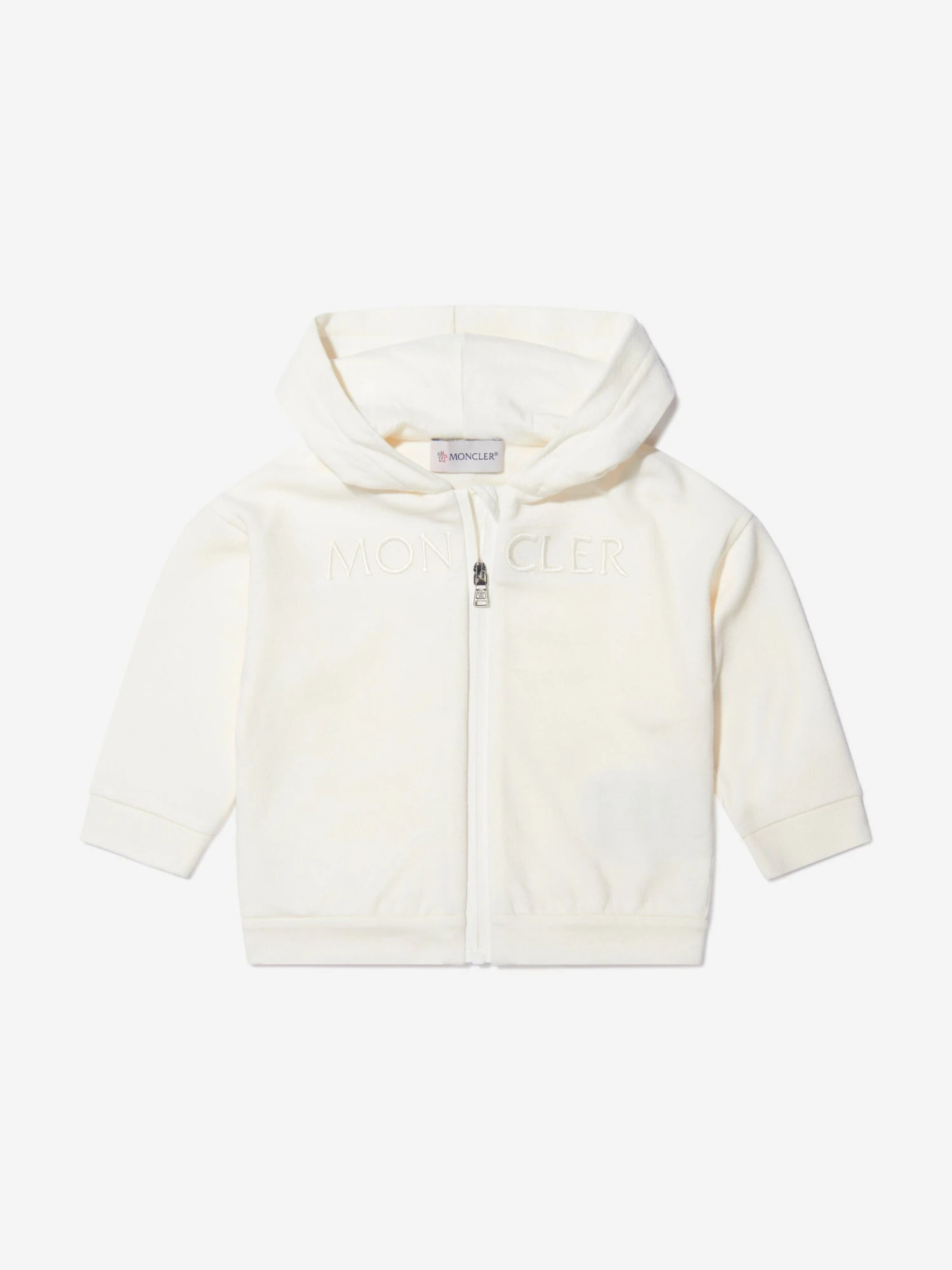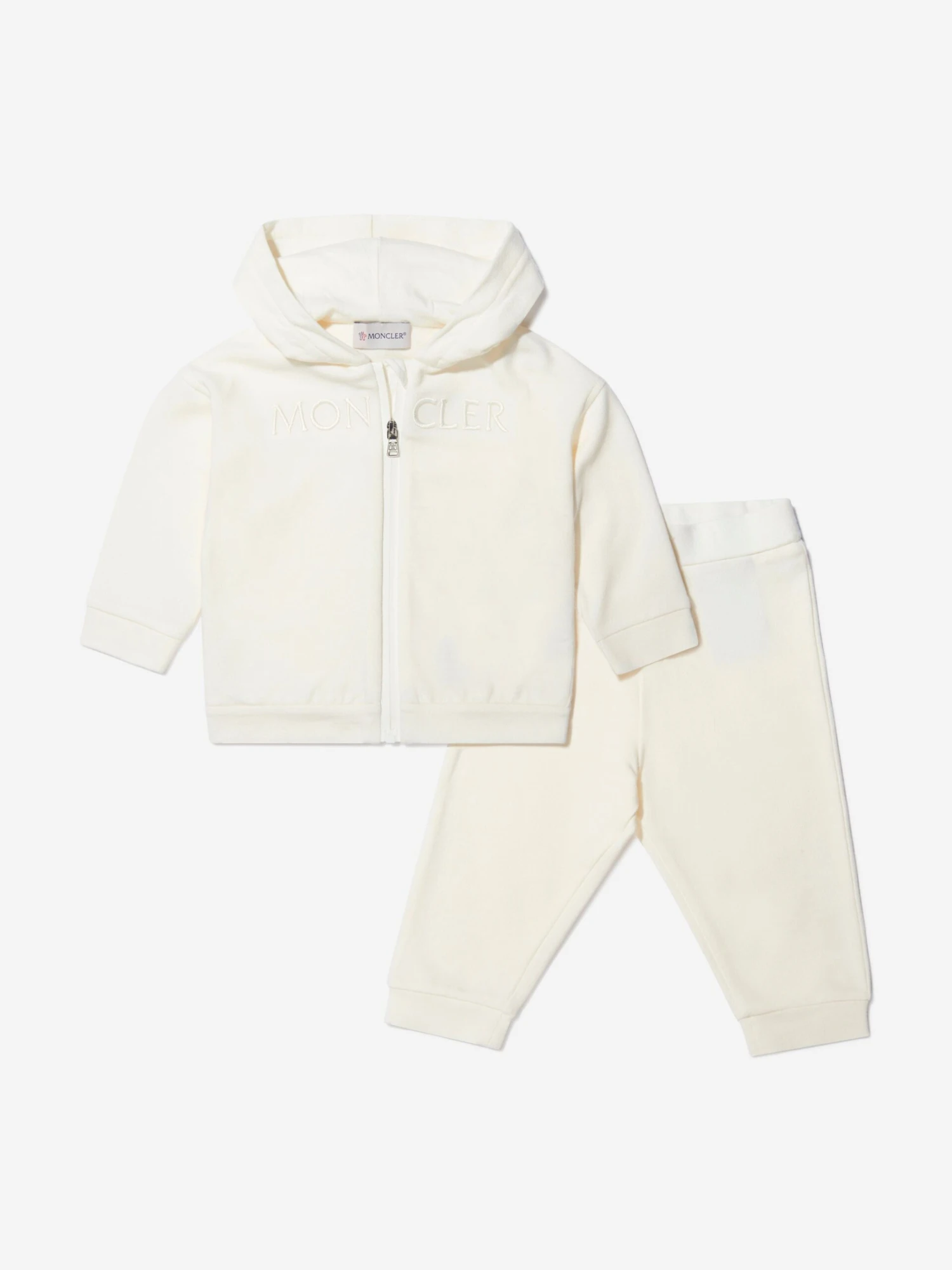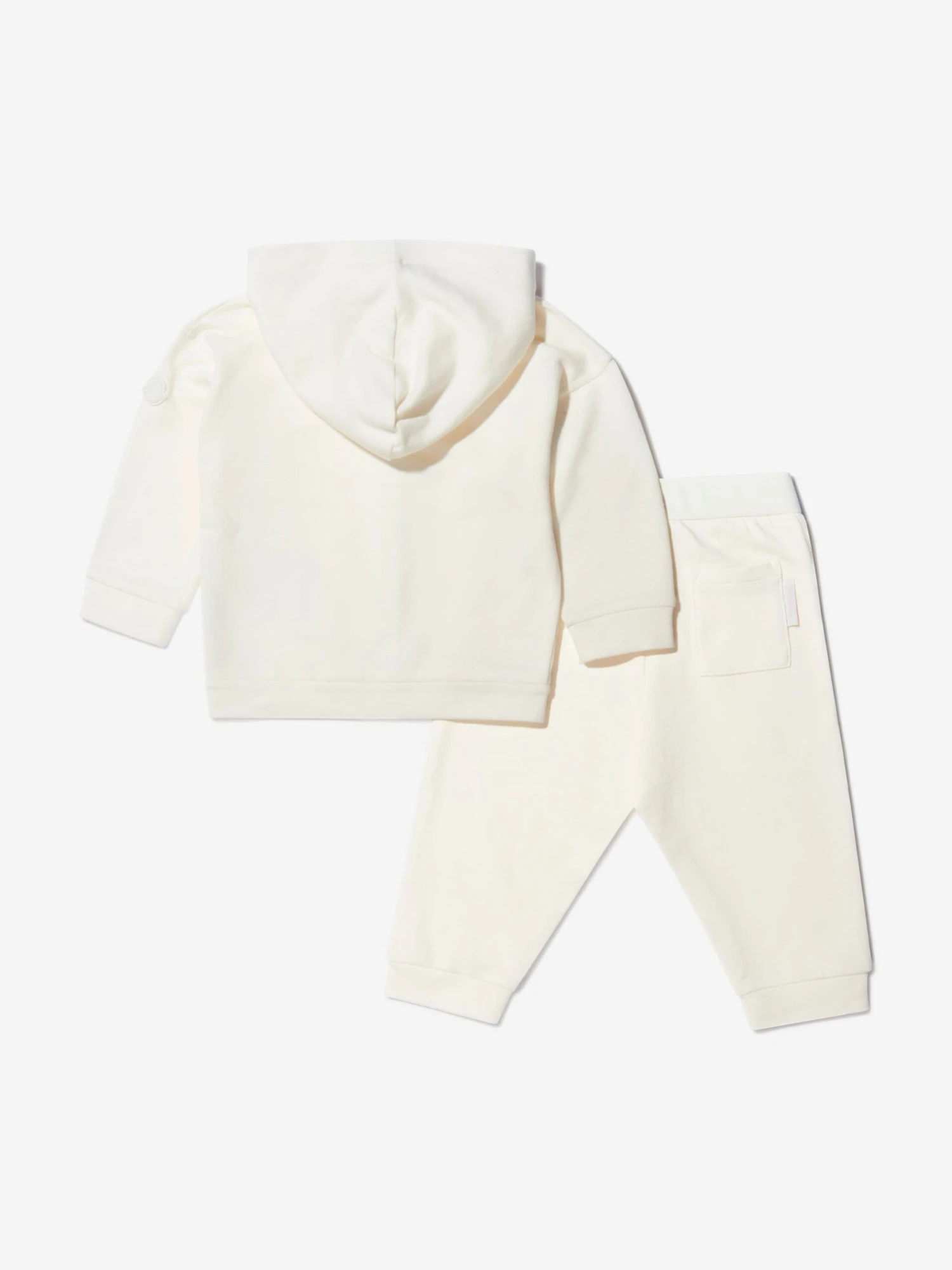 Dress your little ones from head to toe in designer with this luxurious tracksuit by Moncler Enfant. The stylish two-piece in ivory includes a charming hooded top with a pair of matching joggers. Boasting a cosy hood and zip neckline, the top and the joggers each have ribbed waistbands, cuffs and ankle cuffs for a comfortable fit and to keep her snug as a bug.
