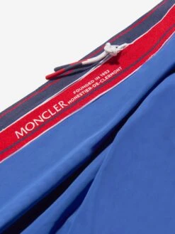 Blue hooded jacket by luxury French brand Moncler Enfant, and made in silky polyester taffeta. It has the iconic logo patch on the chest and red and navy blue stripes down the arms. Lined in soft cotton jersey, the jacket is water repellent and fastens with an exposed zip down the front. There are zip-fastening pockets on the front and on one sleeve.