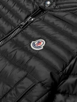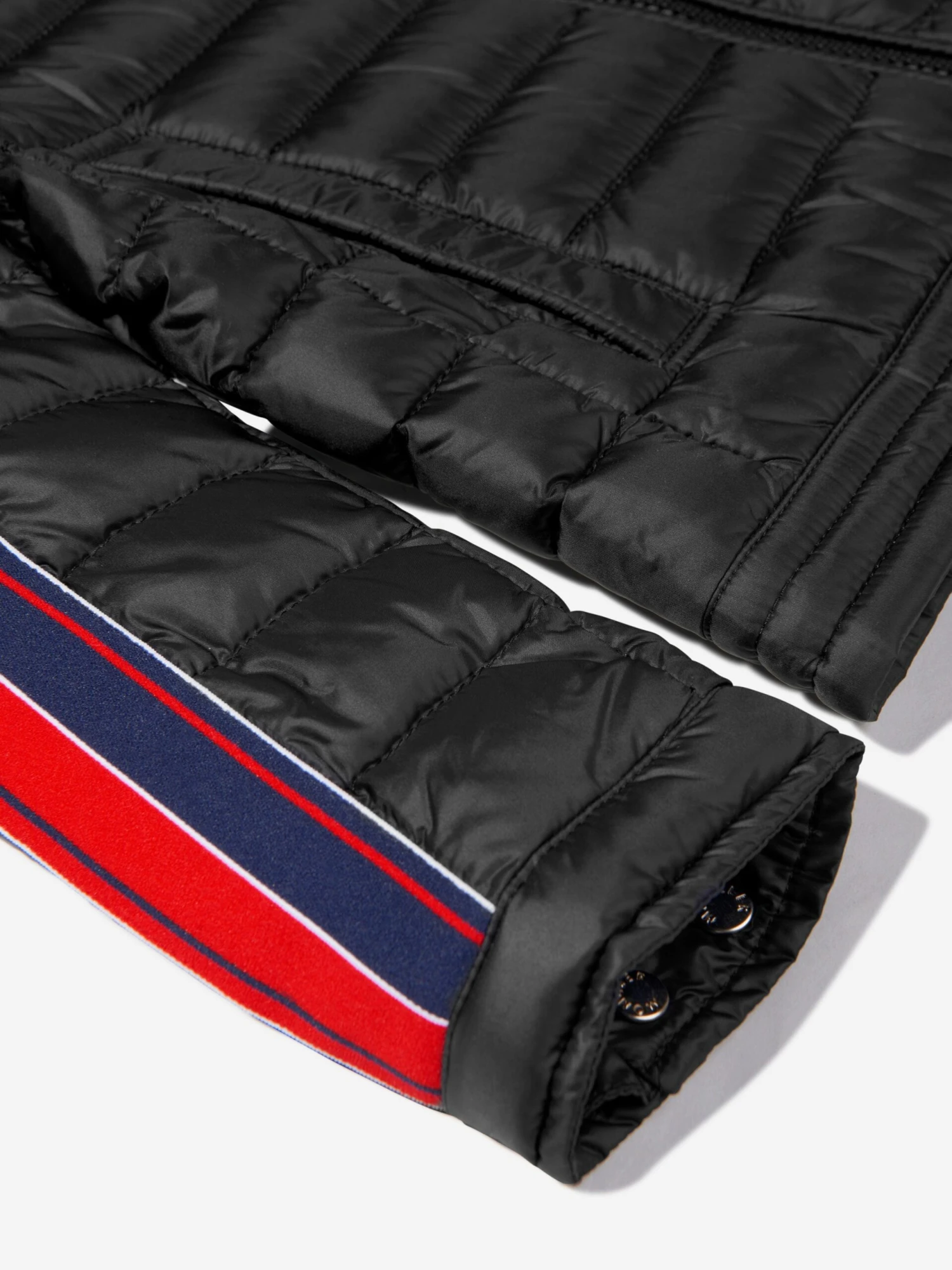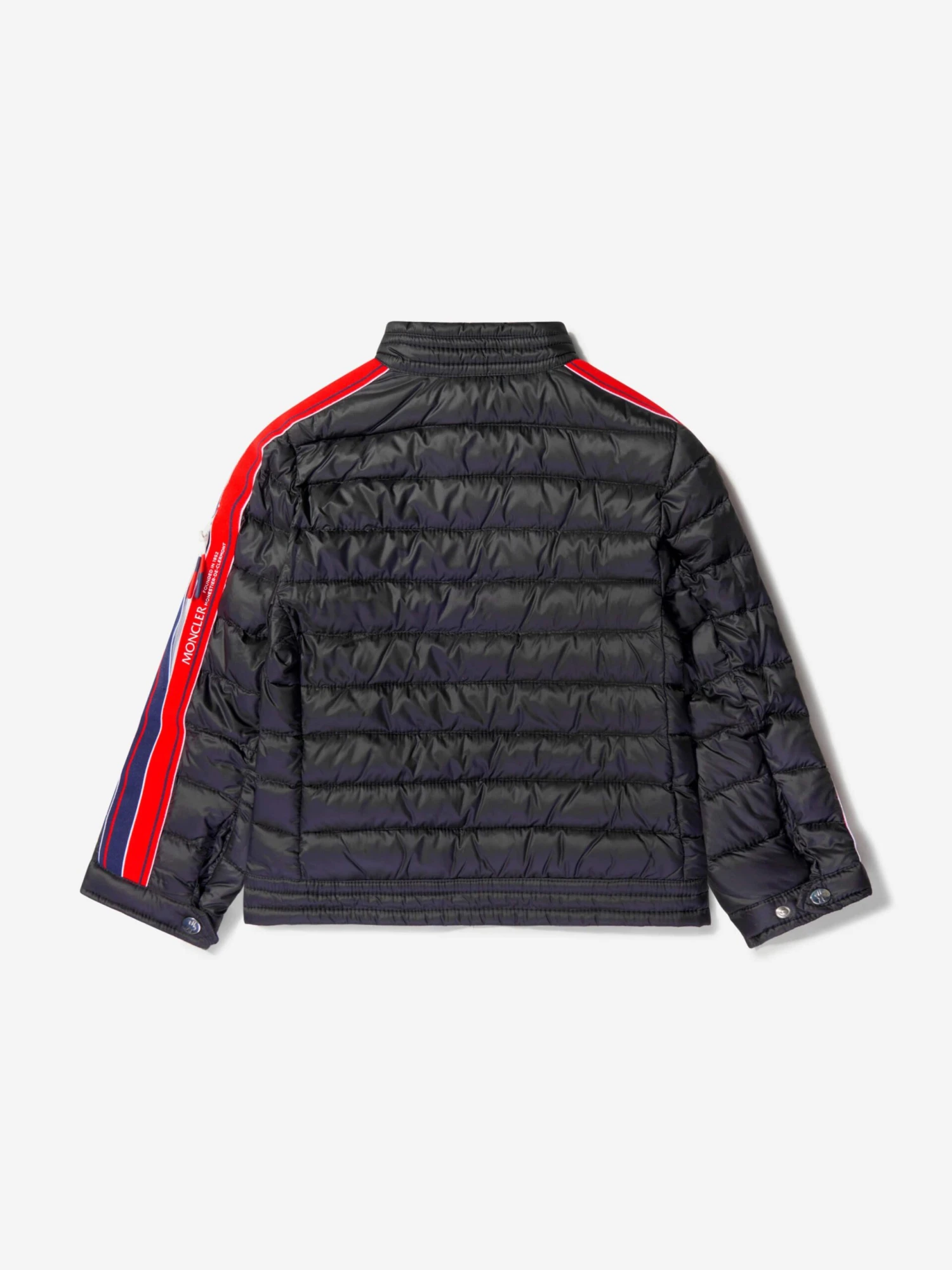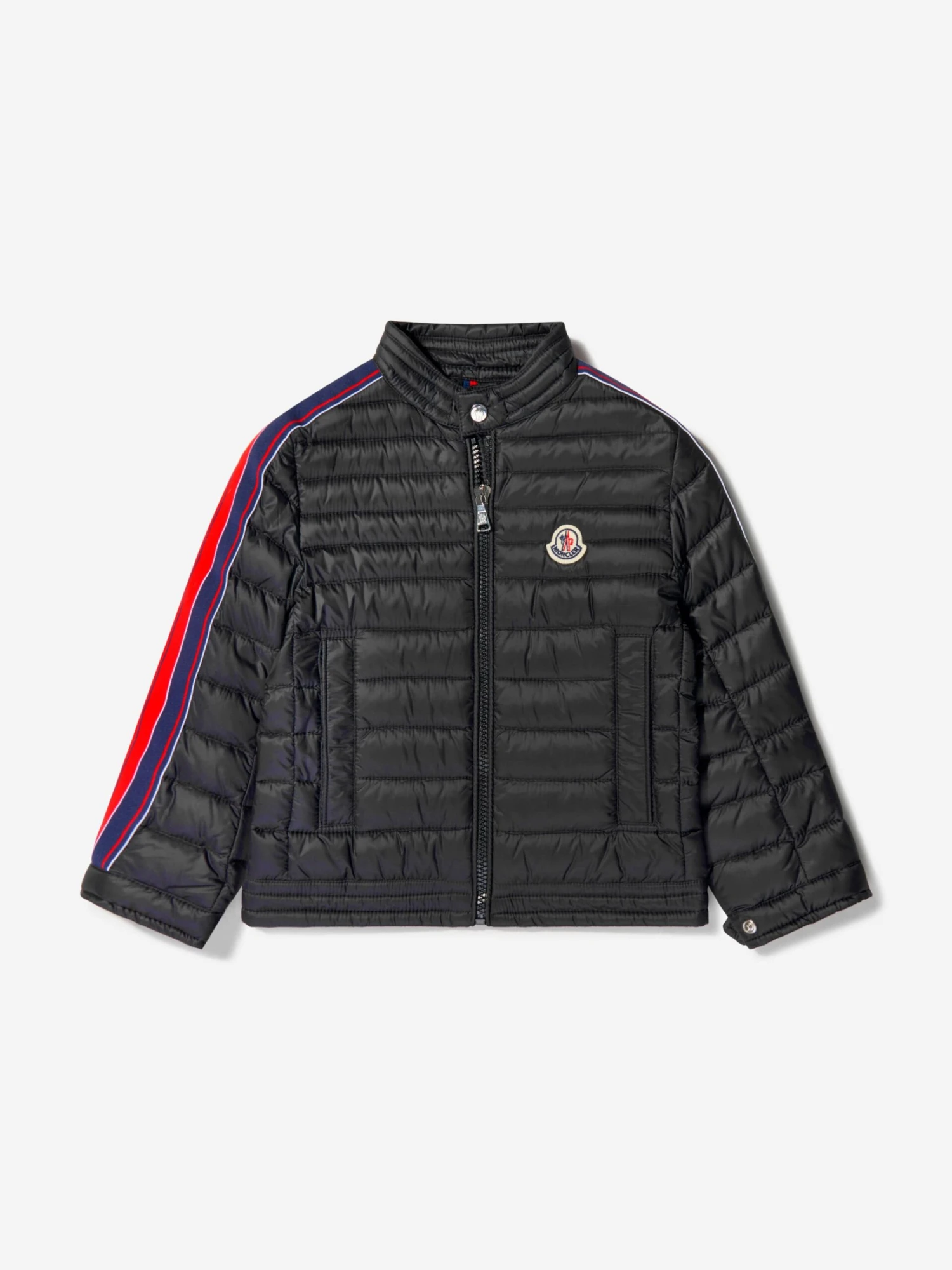 Black puffer biker jacket for boys by luxury French brand Moncler Enfant. It has red and navy blue stripes down the arms, with a logo patch on the chest. Made in silky smooth nylon with a matte effect, the jacket is water repellent and padded with lightweight down. It fastens with an exposed zip on the front and has popper-fastening pockets.