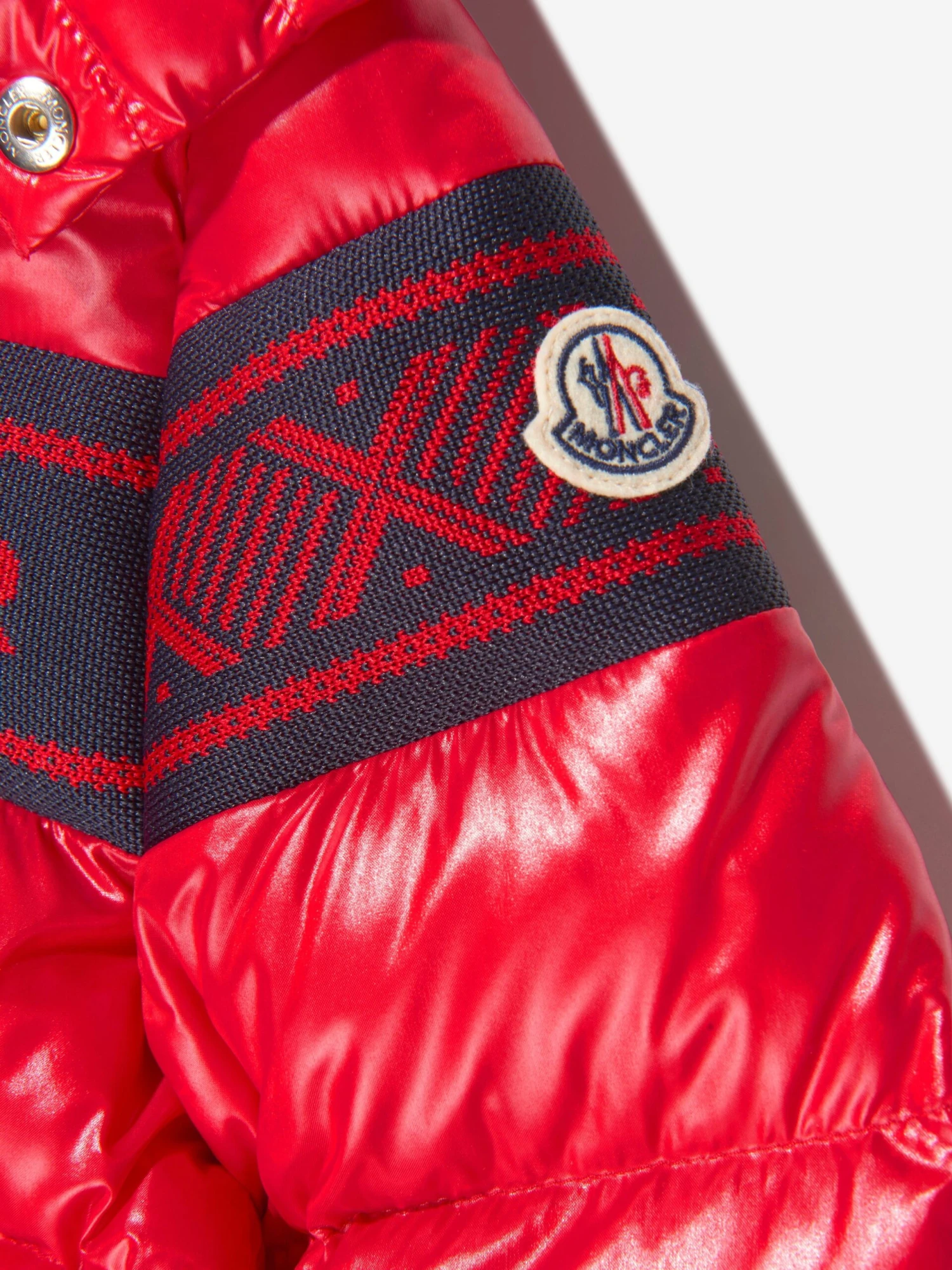 Distinctive and XXXclusive, this boys red Holmi jacket from Moncler delivers red hot style and warmth. Glossy nylon lacqué contrasts with a woven navy jacquard across the chest and sleeves containing a logo and repeating X motif for a distinctive piece. Luxurious feather and down padding provides cutting edge insulation and the iconic logo badge sits on the left sleeve.
