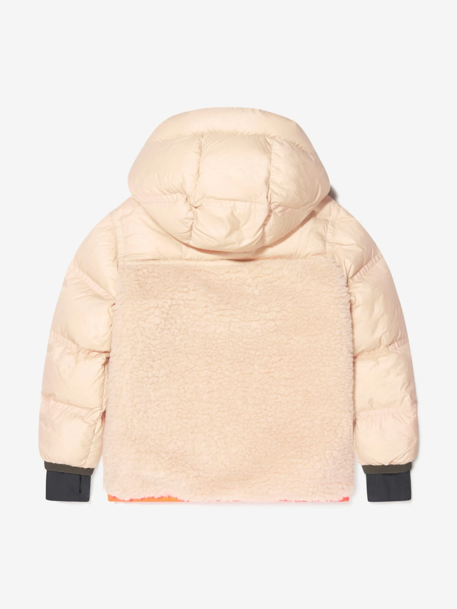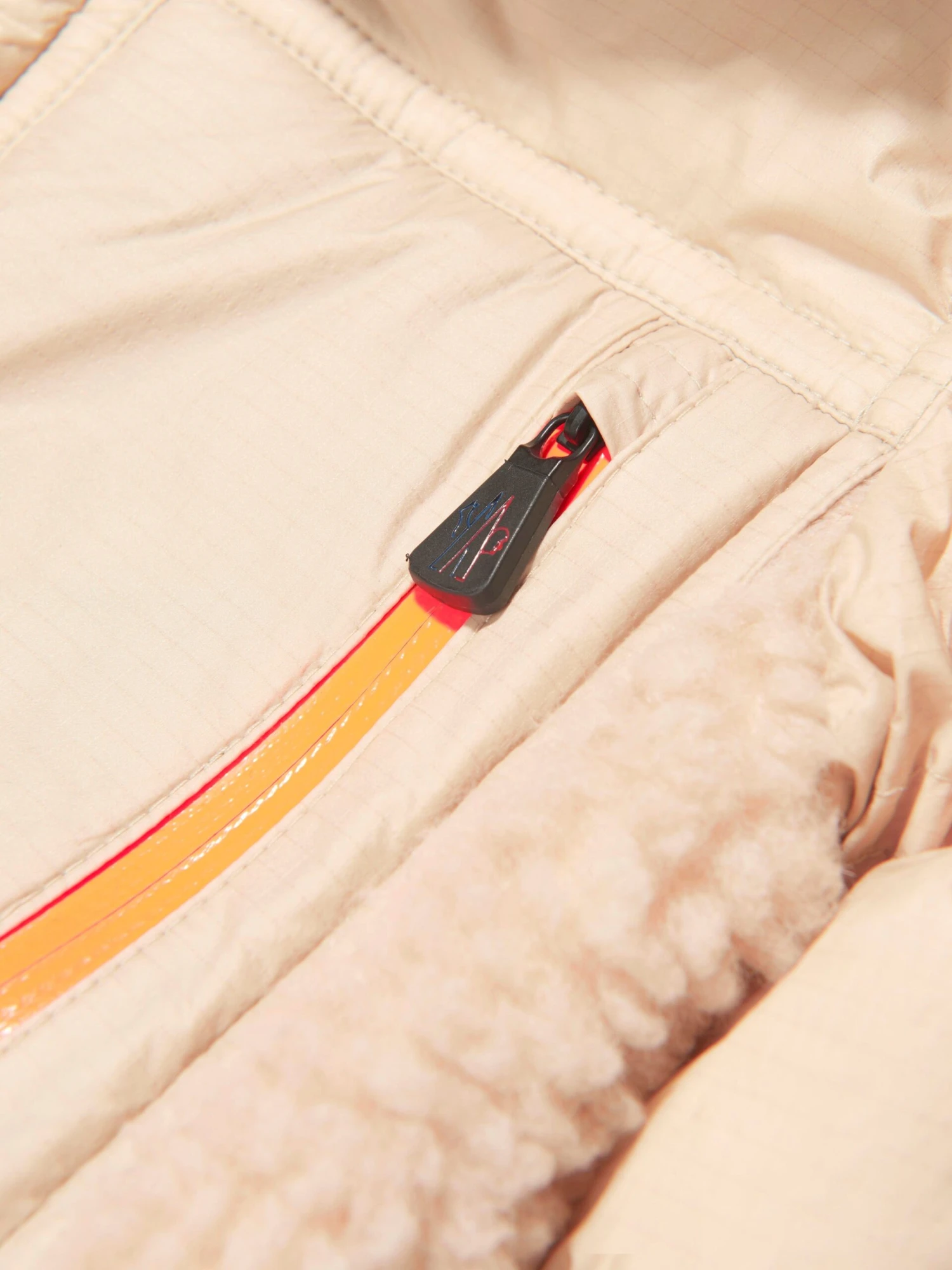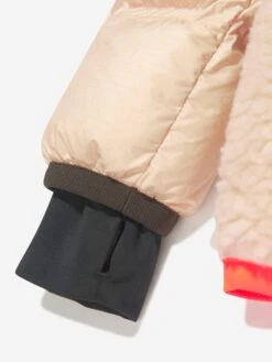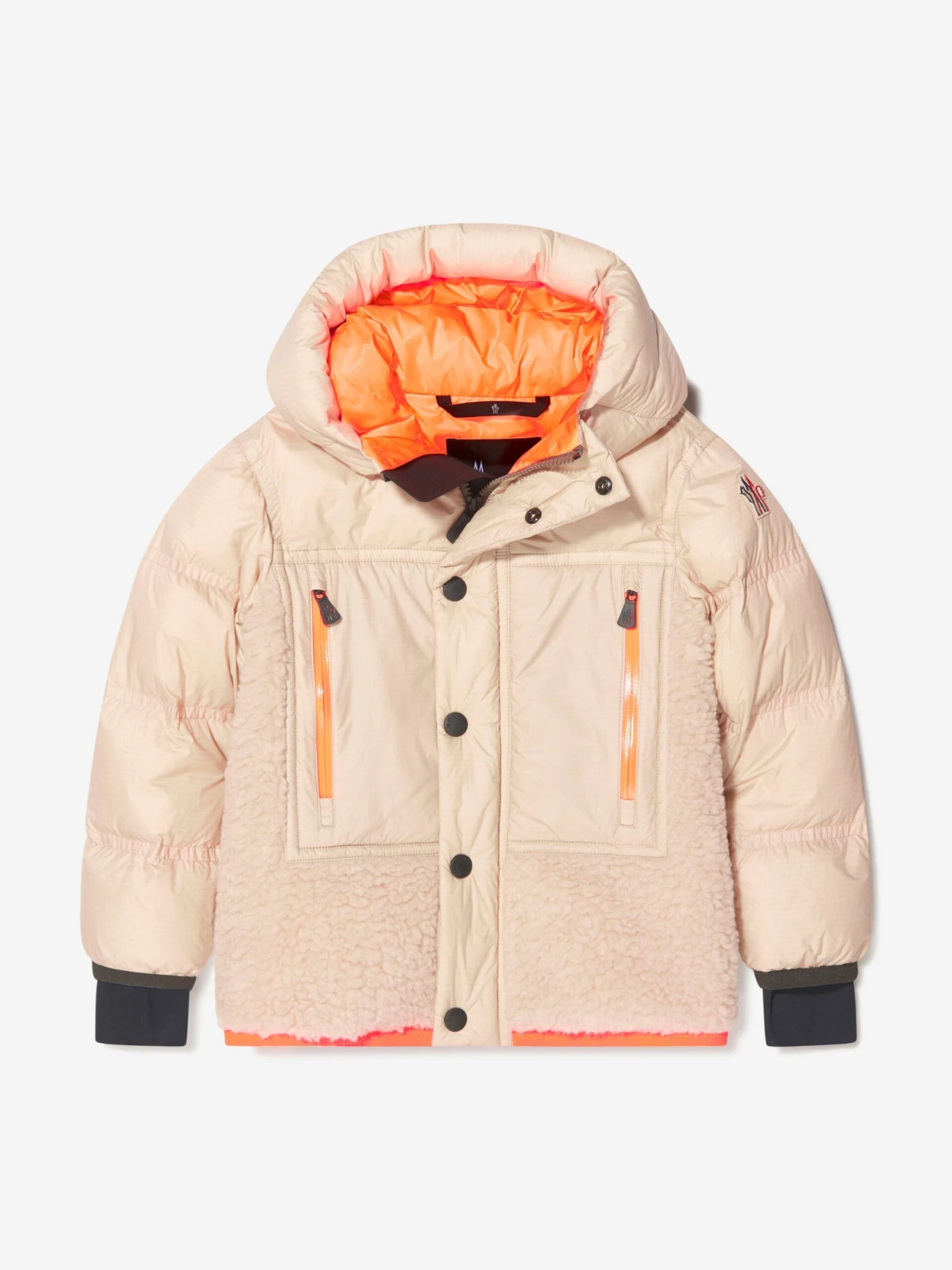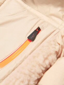 Part of Moncler’s Grenoble collection, this lush and textured Verlonnaz jacket offers style and luxury. Down padded for superior warmth and comfort, lightweight ripstop panels joins tactile teddy to provide soft layers of insulation, whilst mantaining form and poise. Pops of orange and brown accent the beige piece and an embroidered logo badge sits on the left sleeve.