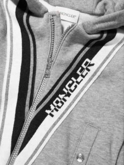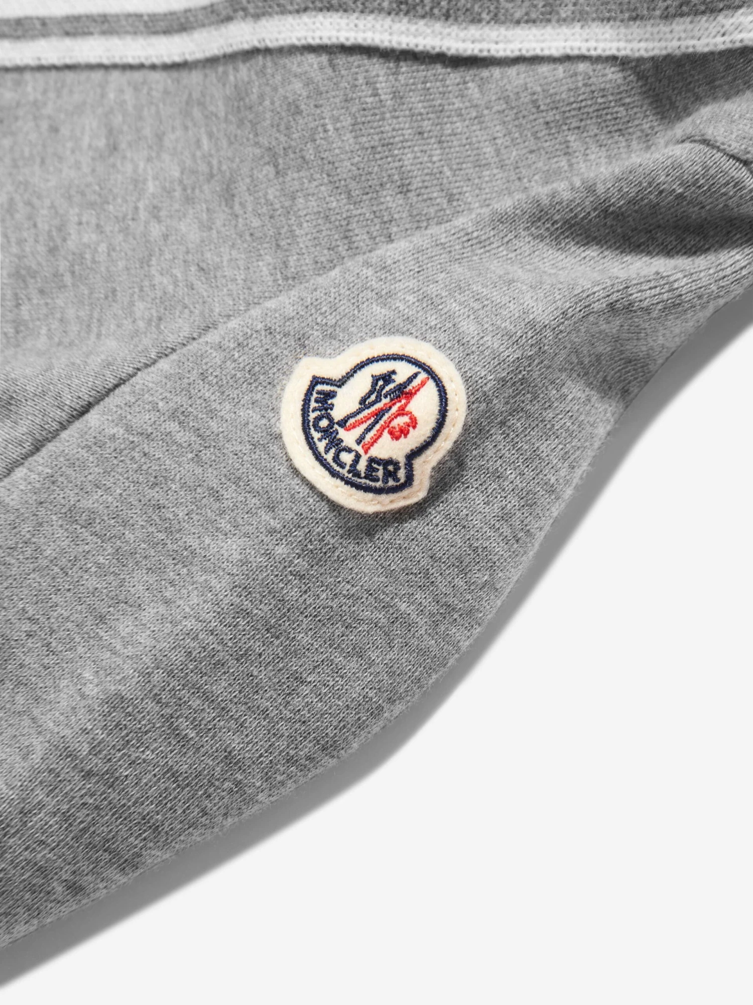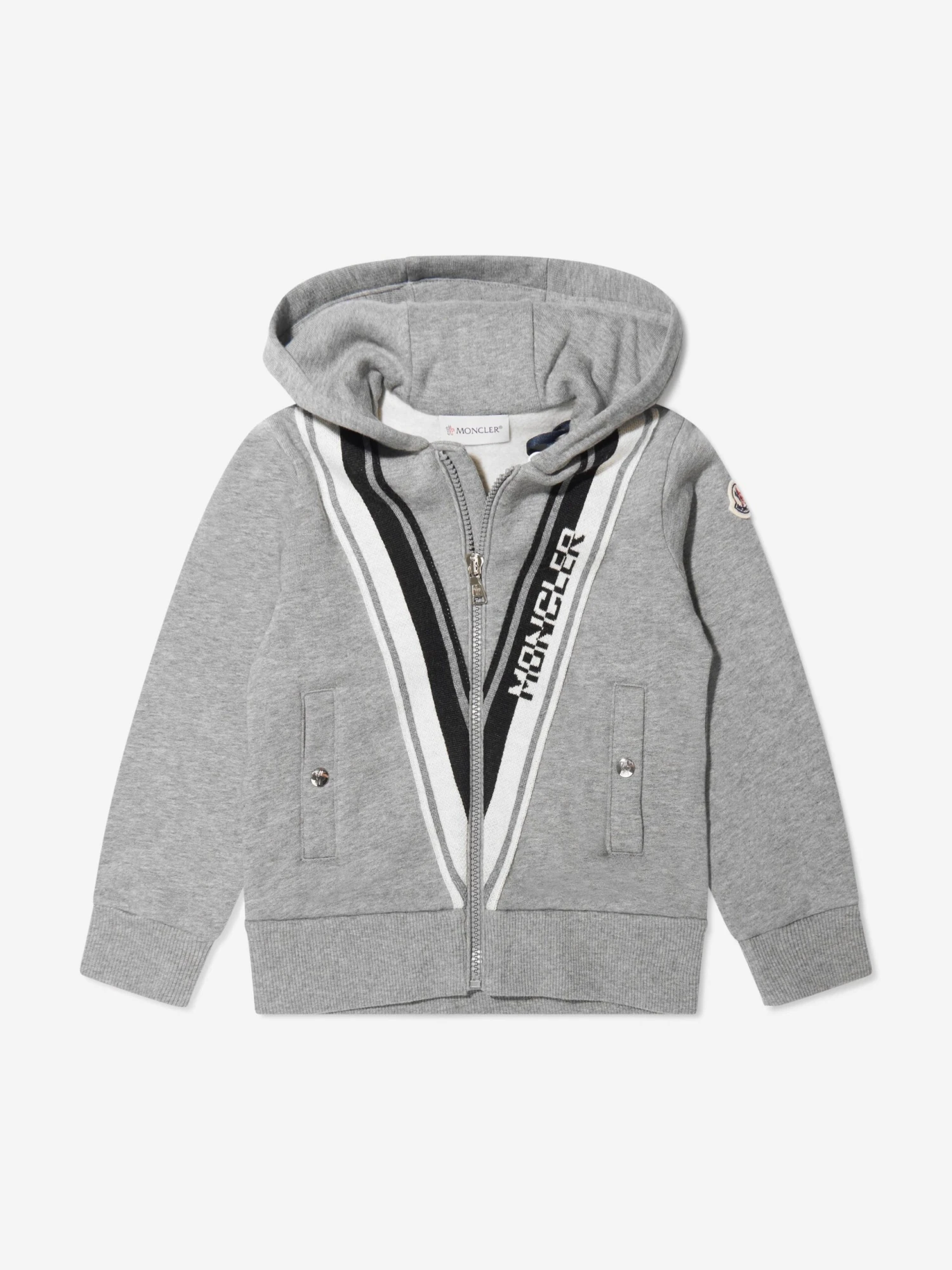 Layer up in apres-ski chic with this boys grey zip-up hoodie from Moncler. Lauded for their weatherproof wear, this cosy cotton piece offers warmth, comfort and style; decorated with a striped chevron on the front, the cosy piece is finished with the iconic felt logo applied to the left sleeve.