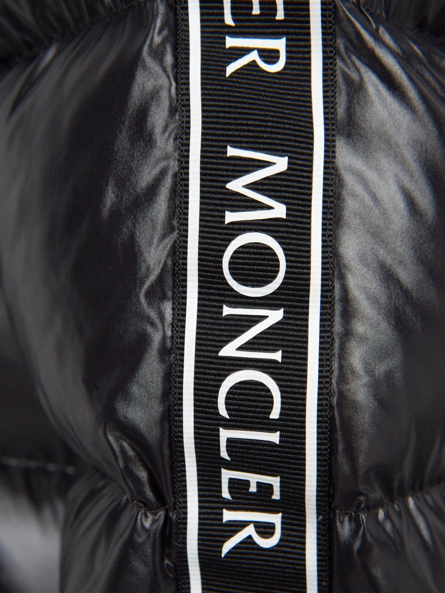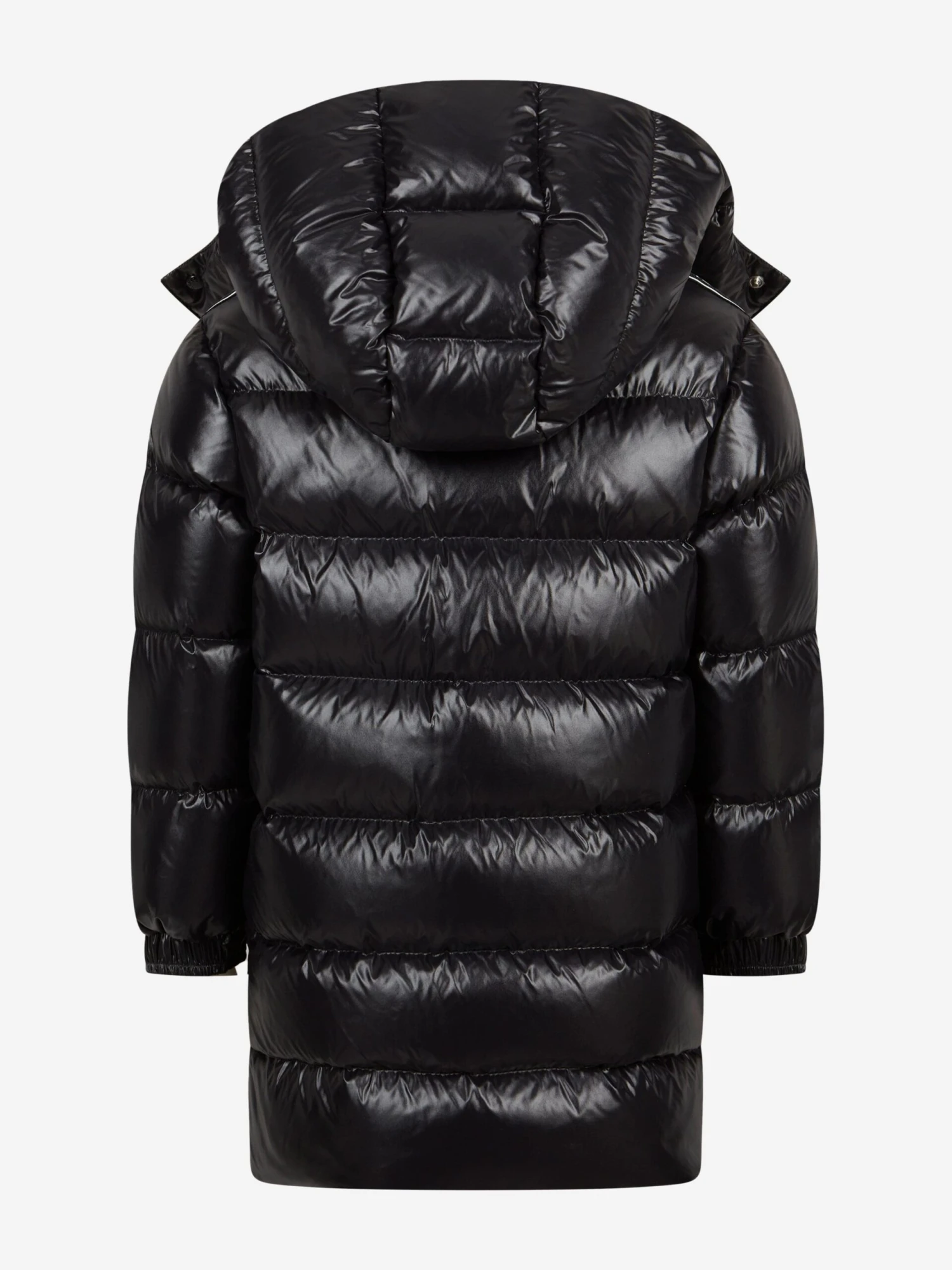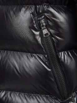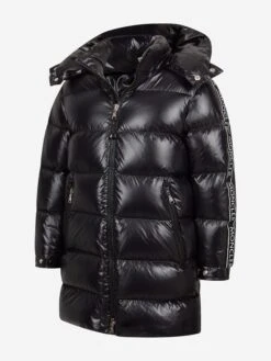 A luxurious winter coat with an urban edge designed by the French label Moncler Enfant. Delivering style and substance, this rich black coat is padded with down for extra warmth and has a cosy hood, front pockets and popper fastening cuffs for a snug fit. The arms are trimmed with brand name tape for a statement finish.