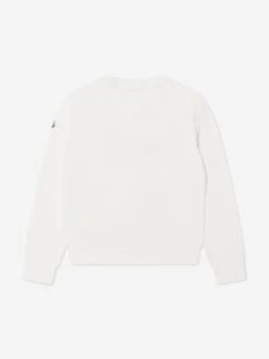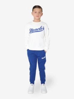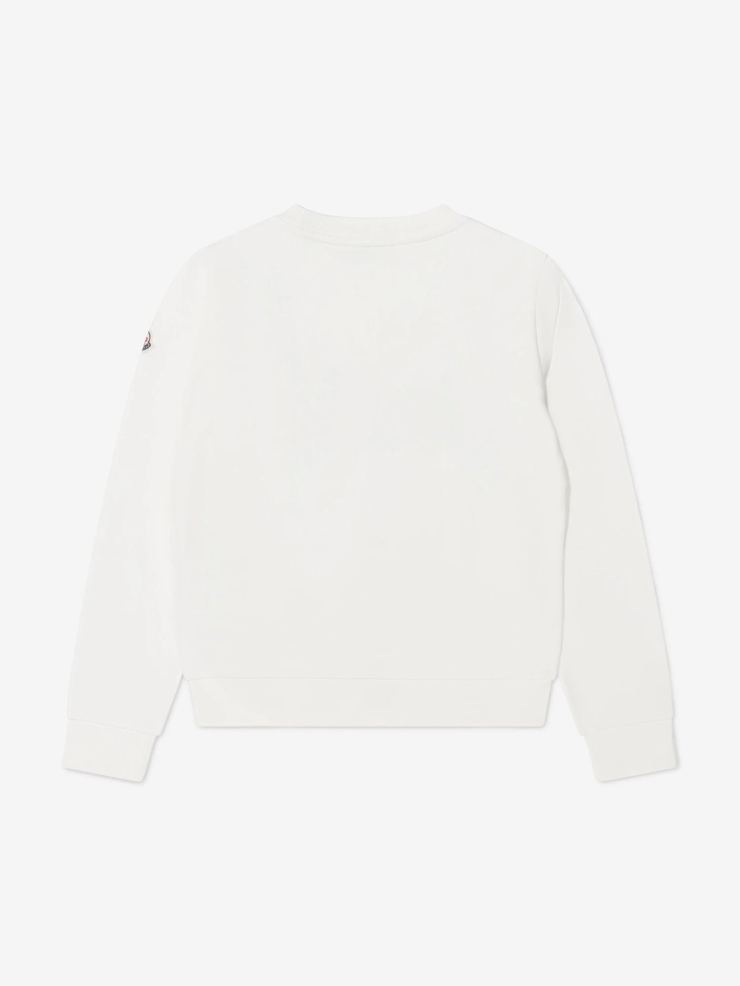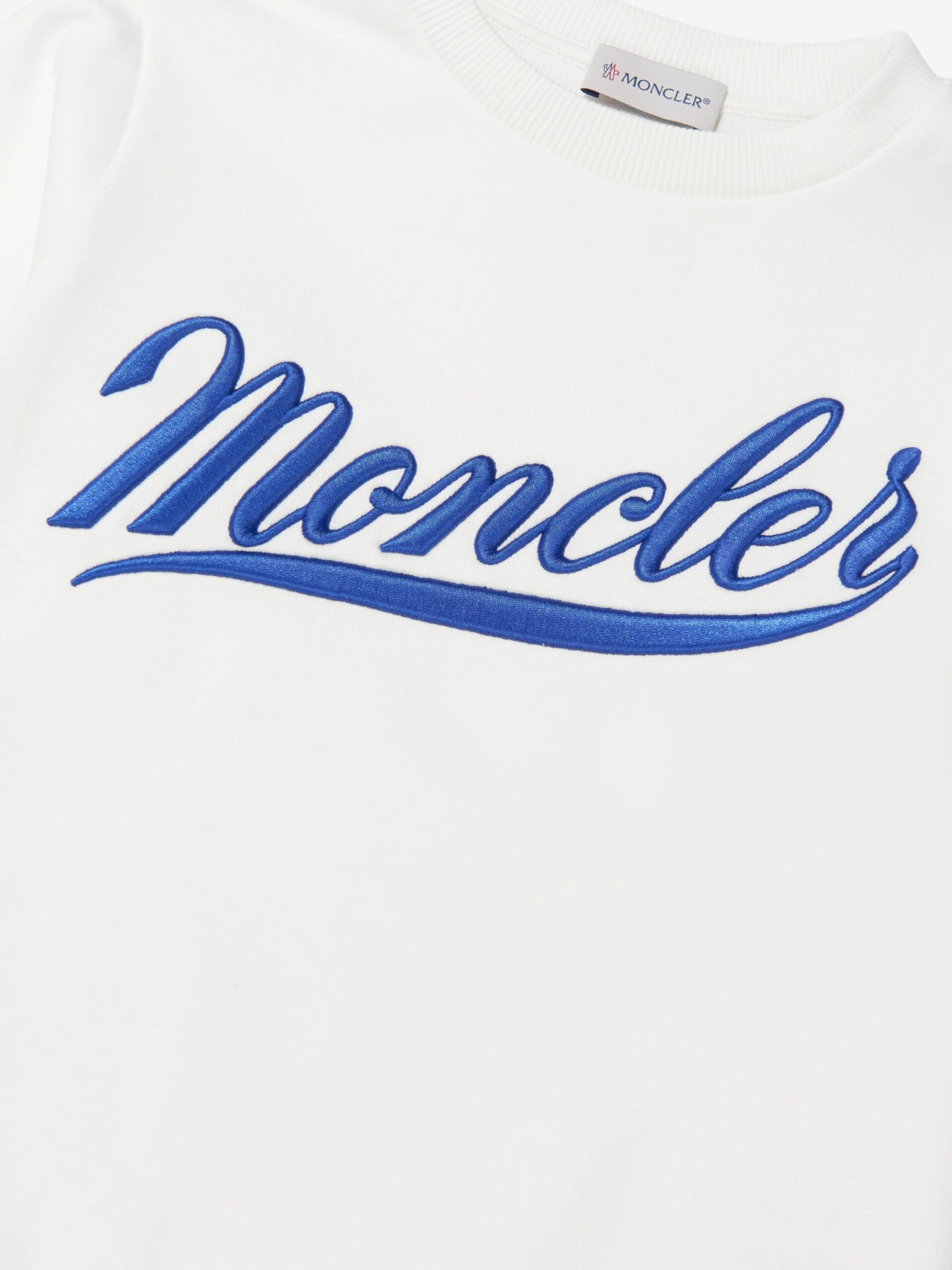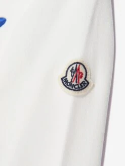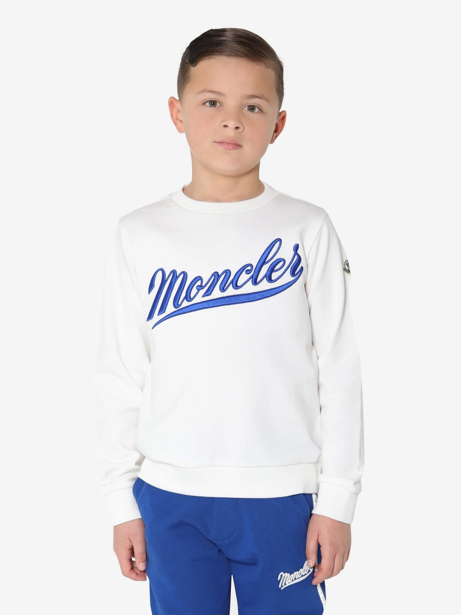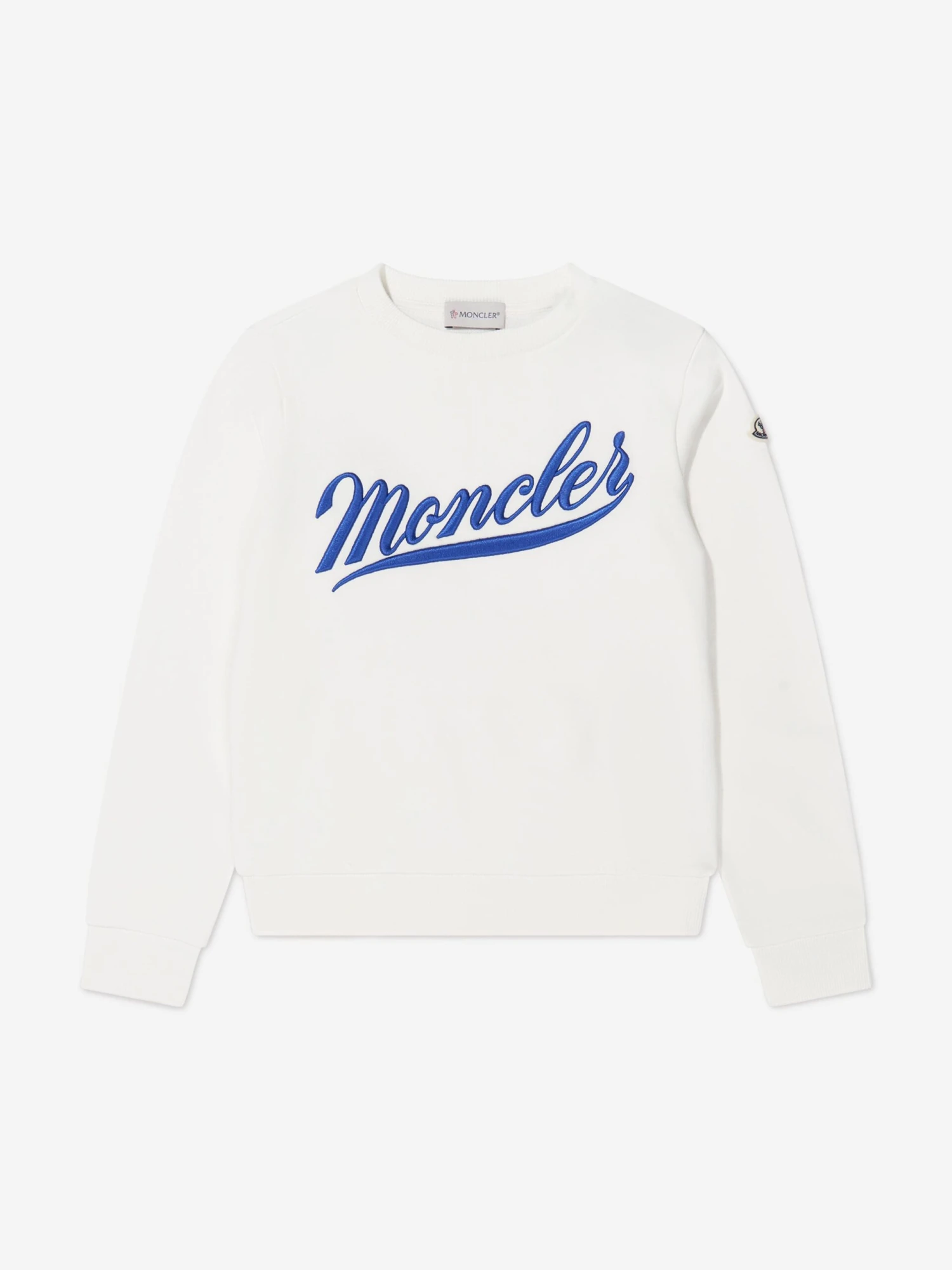 An Alpine take on varsity style, this boys white sweatshirt from Moncler boasts a cool, classic look. Crafted from a soft and stretchy cotton, the cosy sweat features a cursive embroidered logo across the front and is finished with the iconic badge appliqué sitting on the left sleeve. Pair with navy joggers for a stylish, off-duty look.