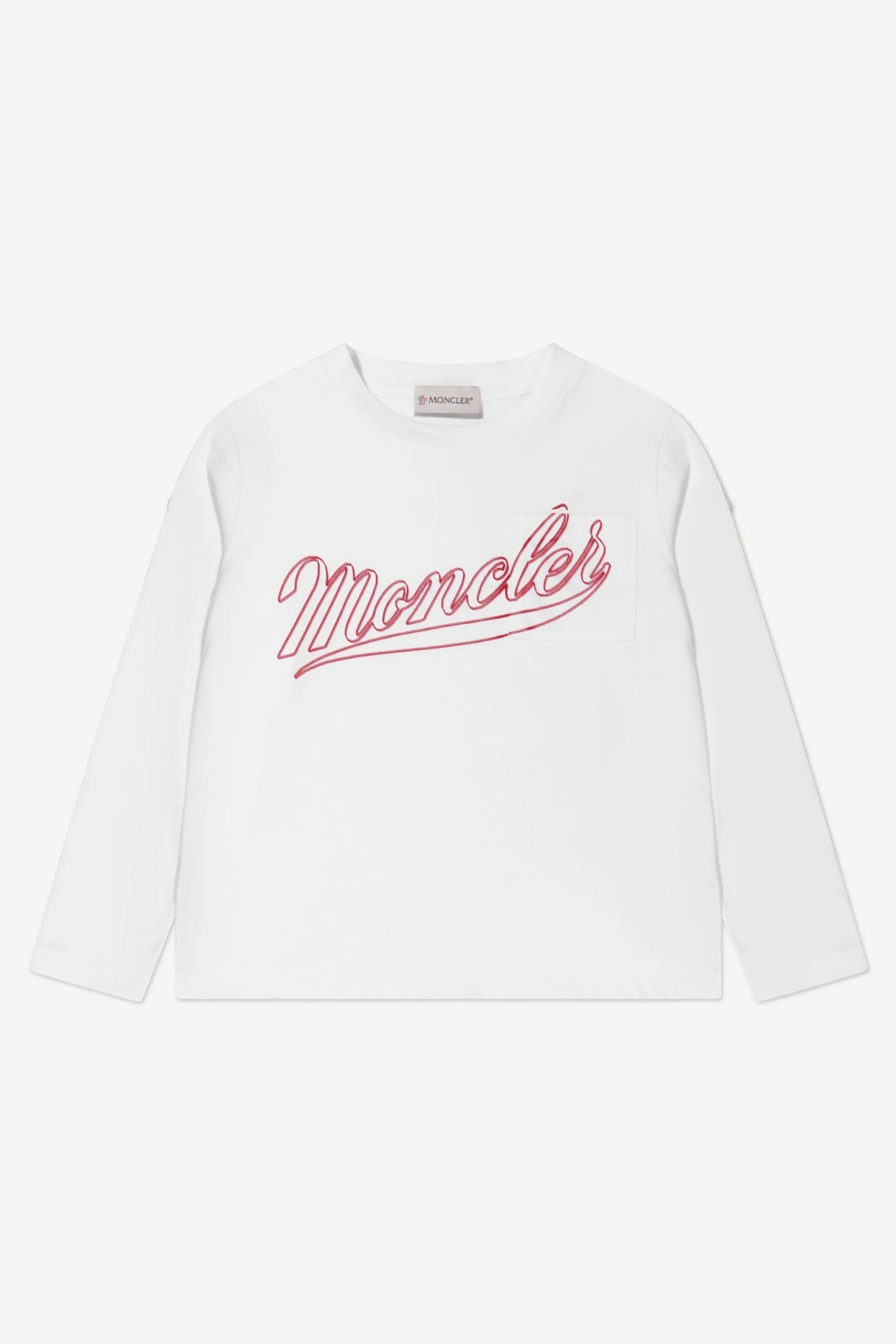 Cool and clean, this boys white long-sleeve t-shirt from Moncler offers a versatile piece suited to many a look. Crafted from a soft and comfy cotton, the tee features a retro print logo on the front in red and is finished with the iconic badge appliqué adorning the left sleeve.