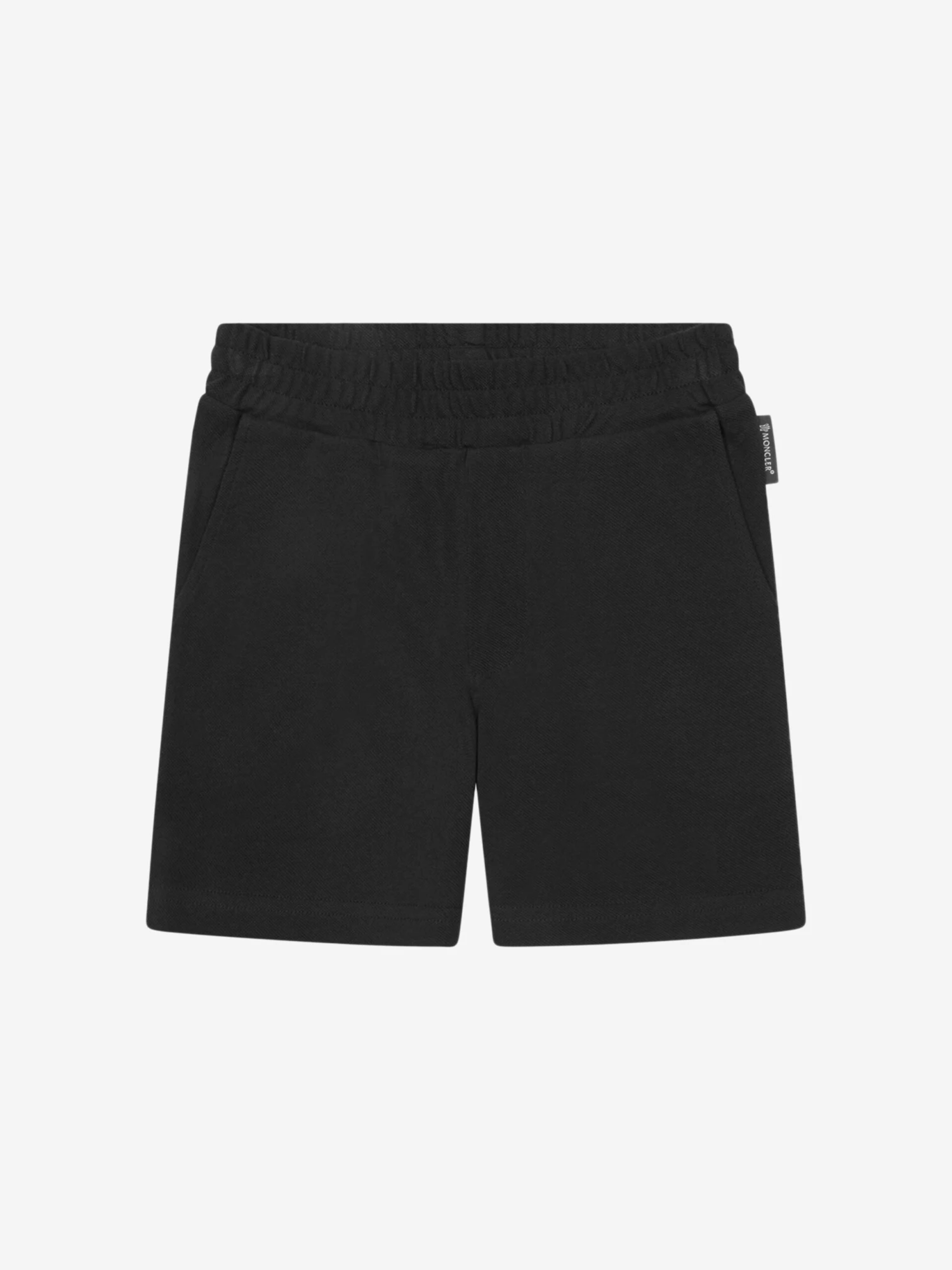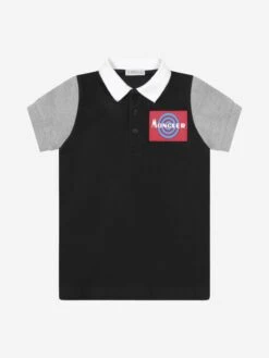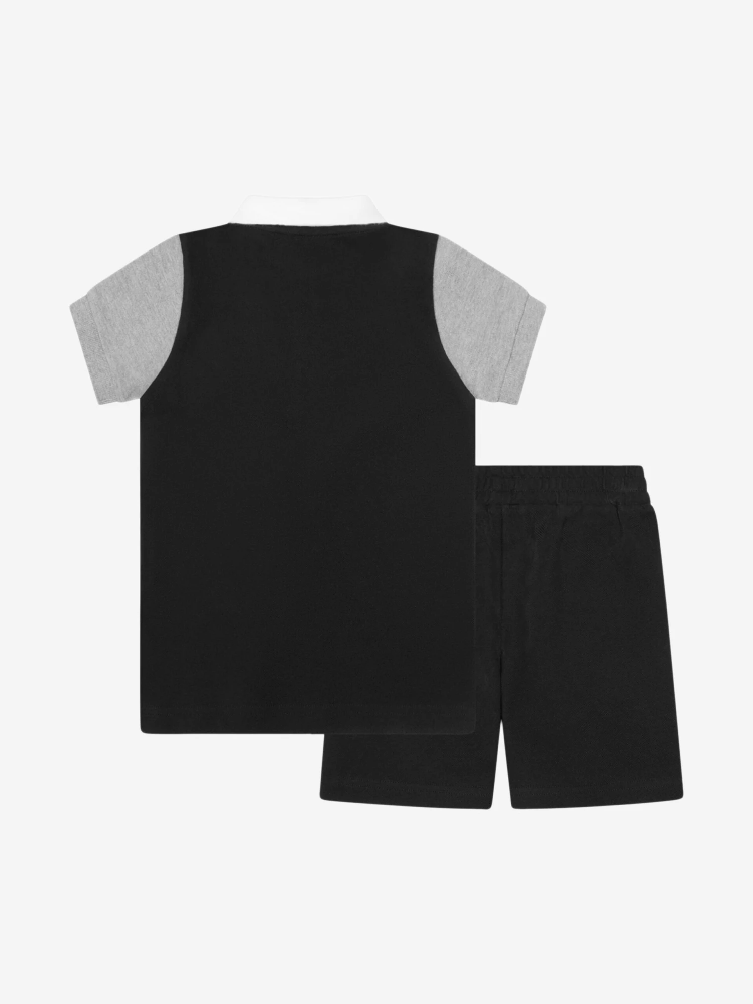 Moncler top and short set for boys. The polo top has contrast sleeves and ribbed collar, logo box applique and three embossed button placket on the chest. The shorts have an elasticated waistband, side seam pockets and a branded side seam tab.
