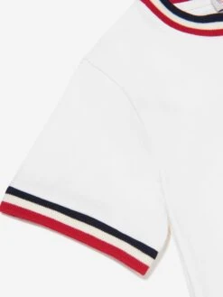 Elevate everyday casuals with this boys white t-shirt from Moncler for a touch of Alpine spirit. Crafted from a soft, cool cotton, the piece features a striking tricolour rib trim and is finished by the iconic logo emblem sitting on the chest.