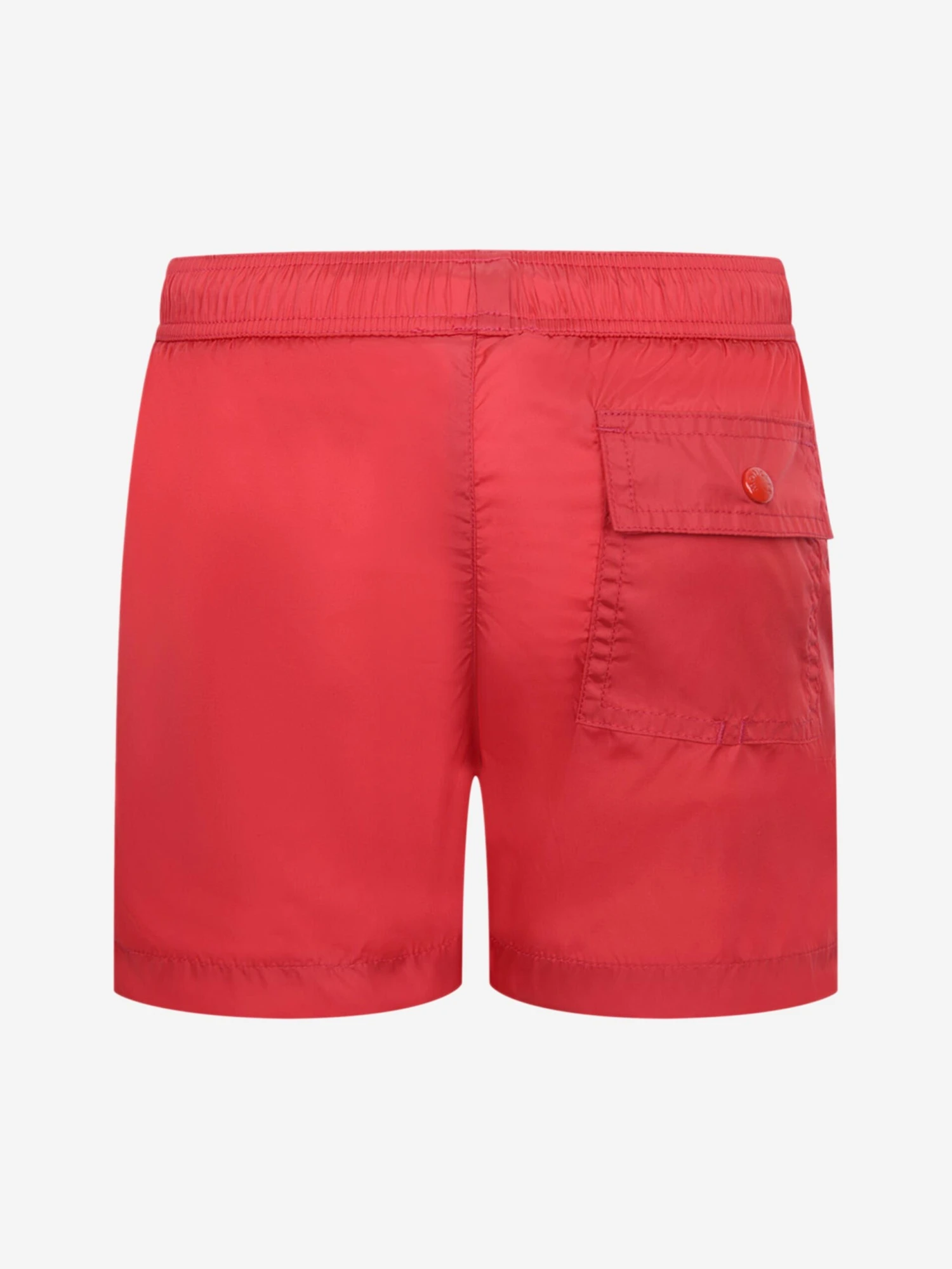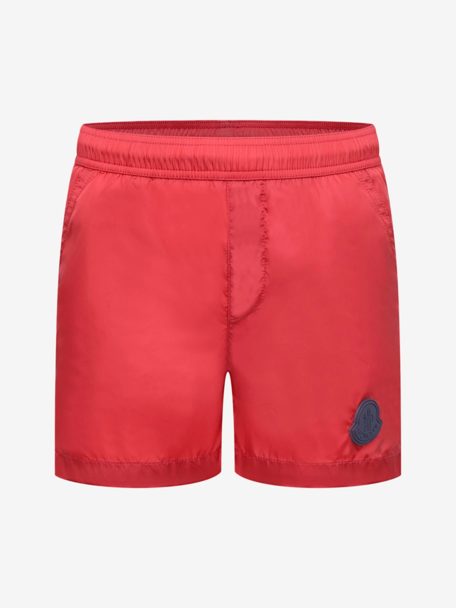 Boys red swim shorts from Moncler. These stylish shorts feature a contrast navy rubber Moncler badge applique above the hem.