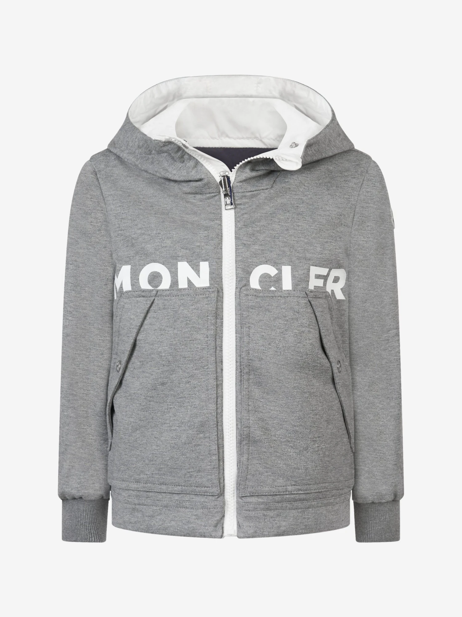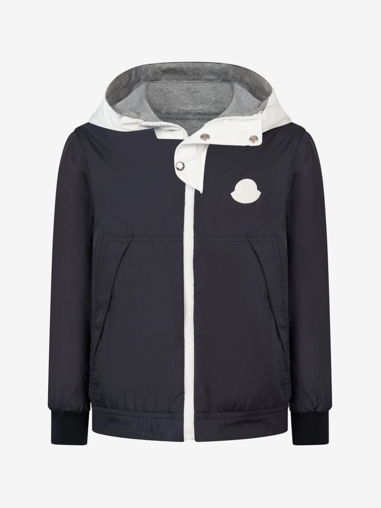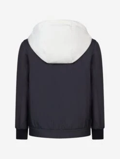Get double the style in one piece with this boys reversible jacket from Moncler Enfant. With a navy jacket on one side with contrast white trimming, a zip fastening and rubberised signature Moncler Badge. With a navy jersey jacket on the other side with w white logo print through the front and signature badge to the sleeve.