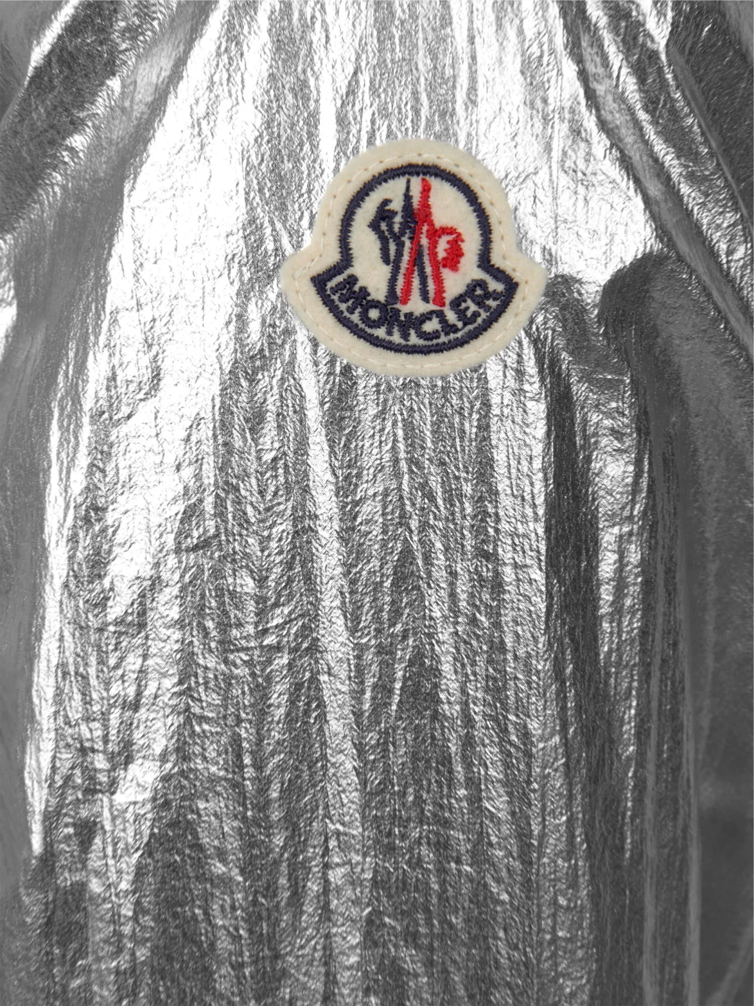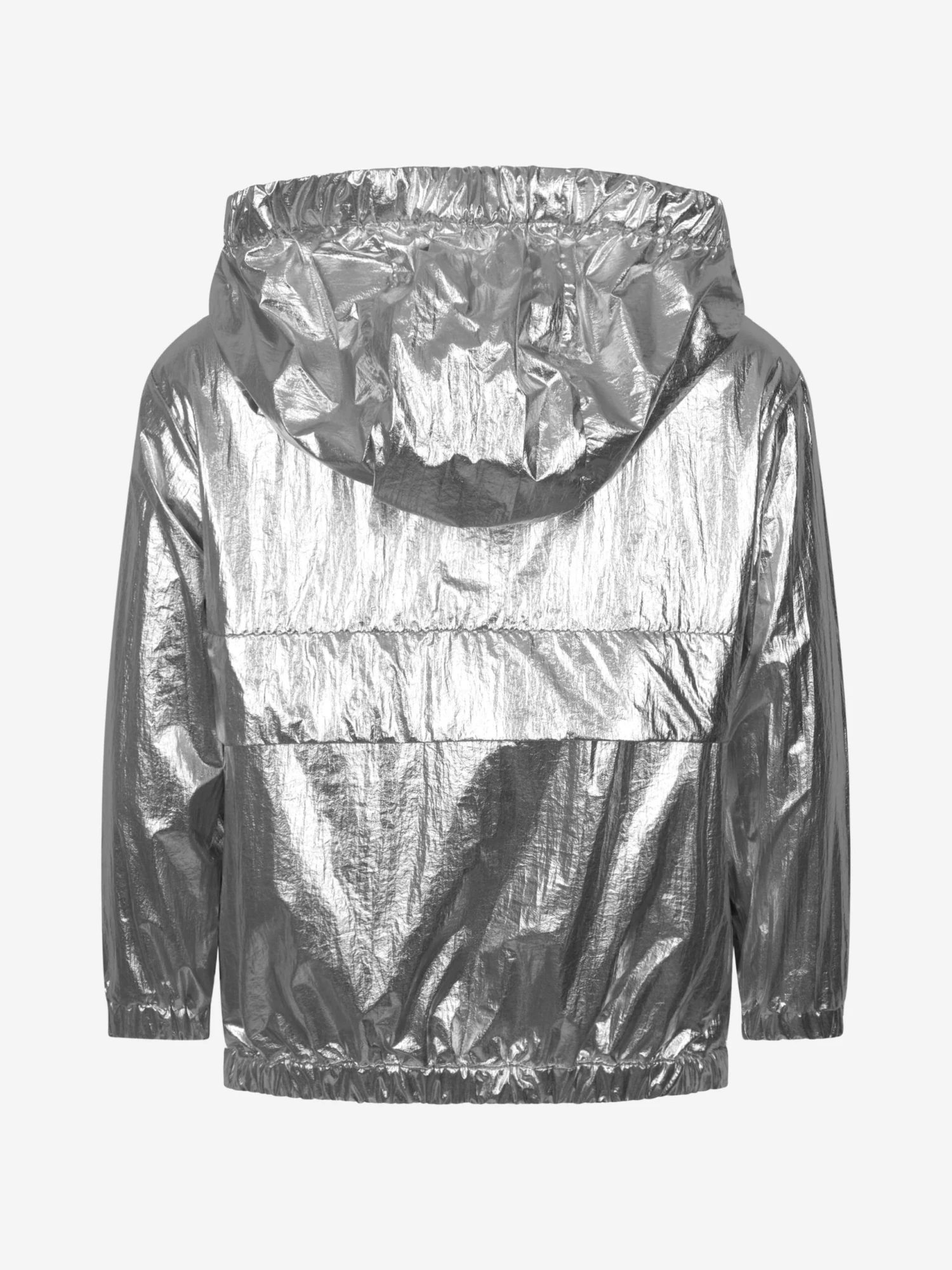 A dazzling jacket for girls from designer label Moncler Enfant. The high-shine silver windbreaker is made from lightweight nylon and boasts the iconic branding across the lower half and the Moncler logo sewn on the front. A useful hood, zip fastening and elasticated cuffs and waistband for a comfortable fit complete this fashionable and functional jacket.