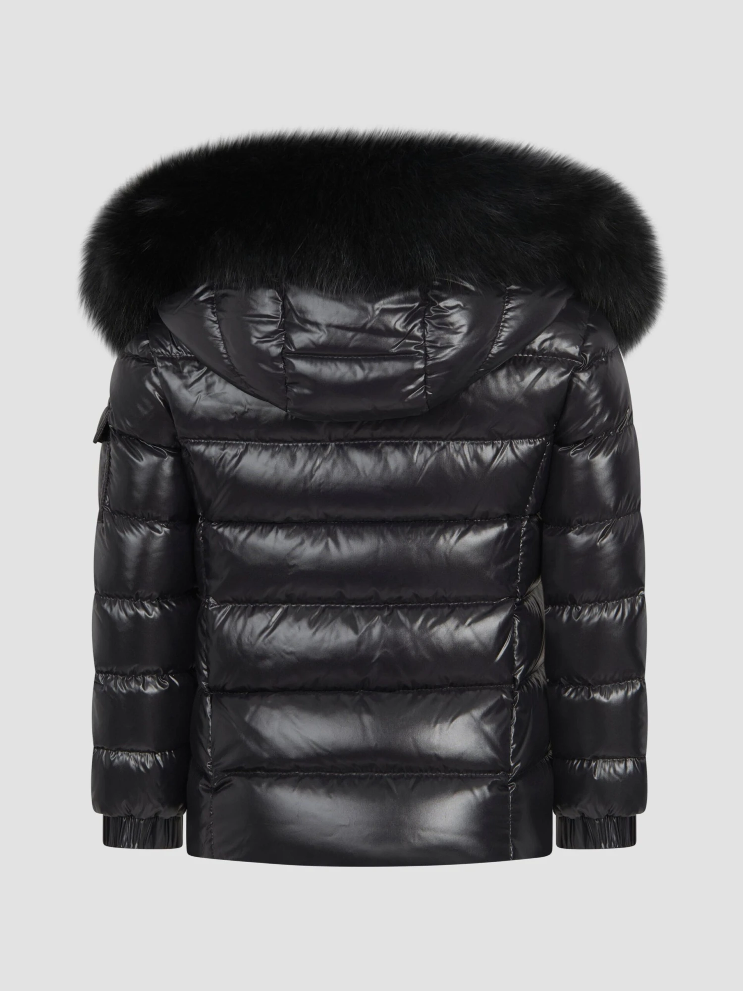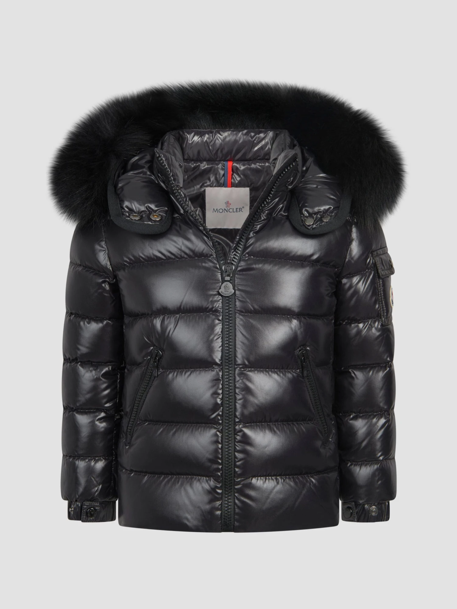 Keep her stylishly cosy in this girls’ black fur jacket from Moncler Enfant. Renowned for producing the down jacket to protect mountain workers, this chunky shiny jacket with matte black embossed zip fastening keeps the elements out and the style stakes high. Vertical side zip pockets are perfectly positioned to warm little hands and the chunky real fur trimmed hood keeps cheeks warm with a luxurious touch. A windproof collar stand with popper fastenings keeps out the cool whilst the woven embroidered logo on a double stitched and reinforced arm pocket means there’s no mistaking the quality and heritage of this jacket. **This item contains real fur**