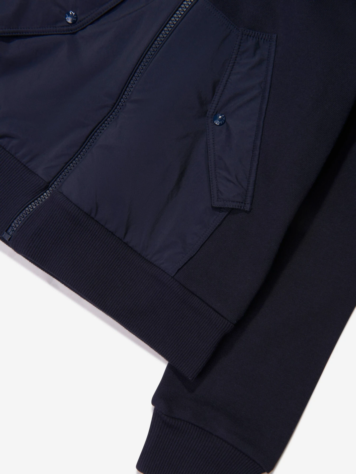 A super cool hoodie for girls by Moncler Enfant, hailing from the luxury French designer’s SS22 collection. Made in cotton, the hoodie comes in a dark shade of navy blue, ribbed trims and front pocket with a popper button fastening. There is logo detailing to one arm.