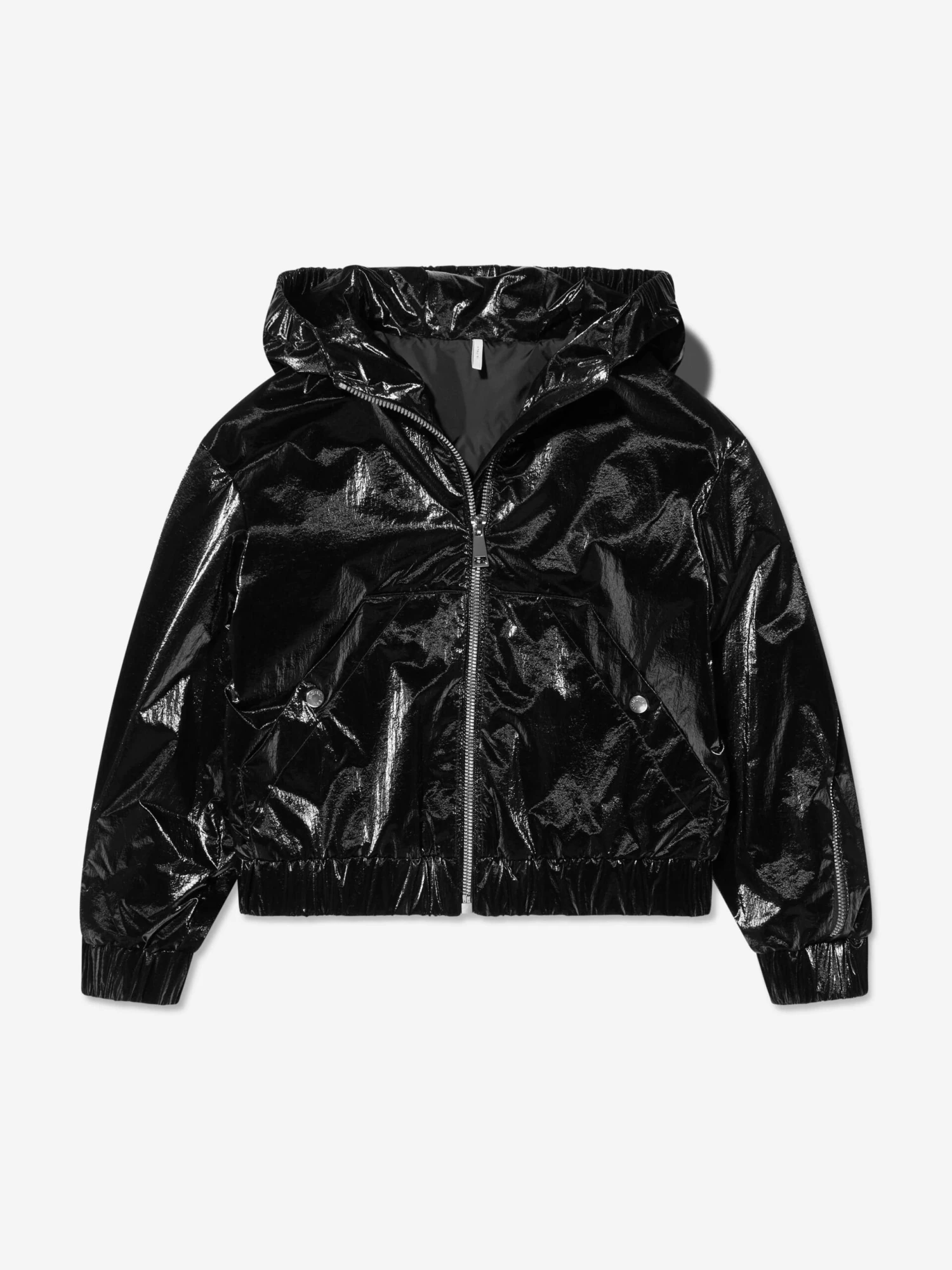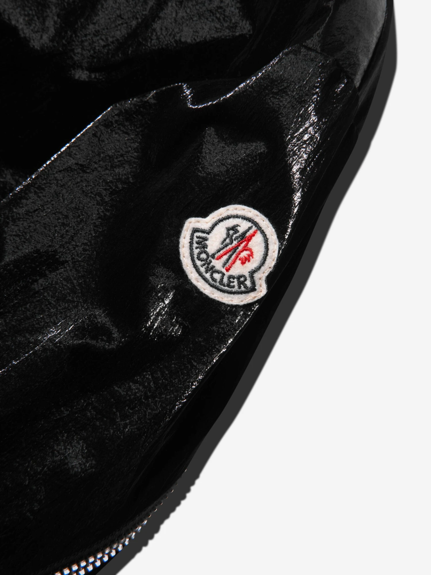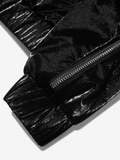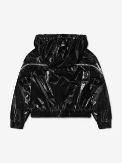 Warmer weather means lighter layers and this girls black Brienne jacket from Moncler is the perfect covering for cross-seasonal dressing. Elasticated trims and a fixed hood offer protection from adverse weather, whilst an interesting double zip works itself around the sleeves to reveal a grosgrain logo motif on the reverse.