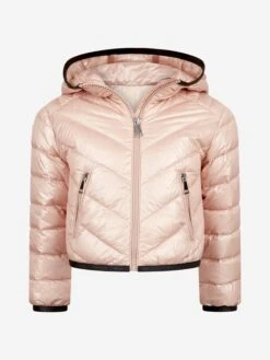 Pretty and practical, this girls’ jacket by Moncler Enfant will be a must-have winter piece. The light pink padded jacket is made from lightweight nylon and filled with a warm down to keep out the chill on wintry days. A useful hood, zip fastening and front pockets also adorn this luxury jacket that is finely finished with the brand’s logo patch sewn onto the arm.