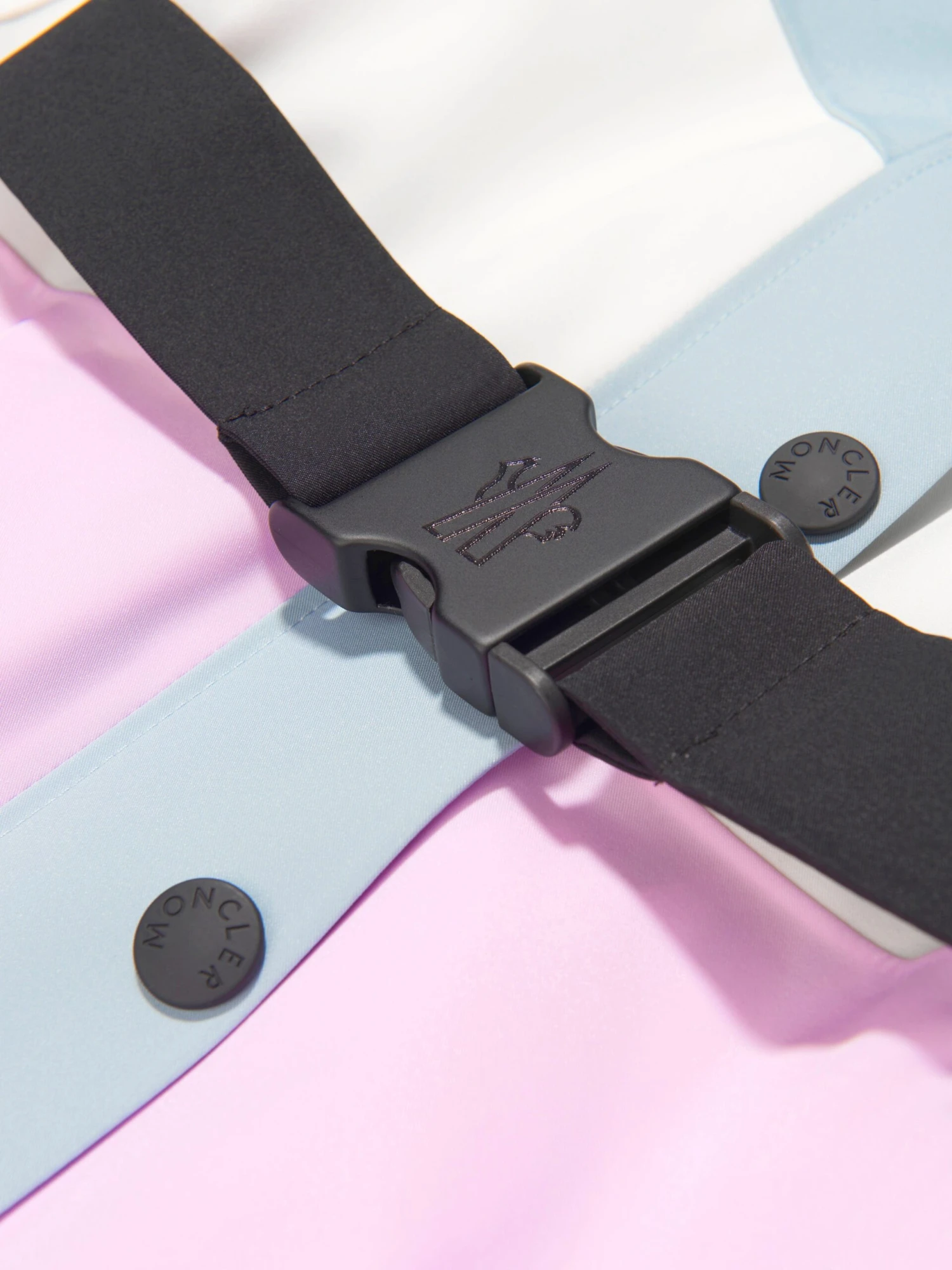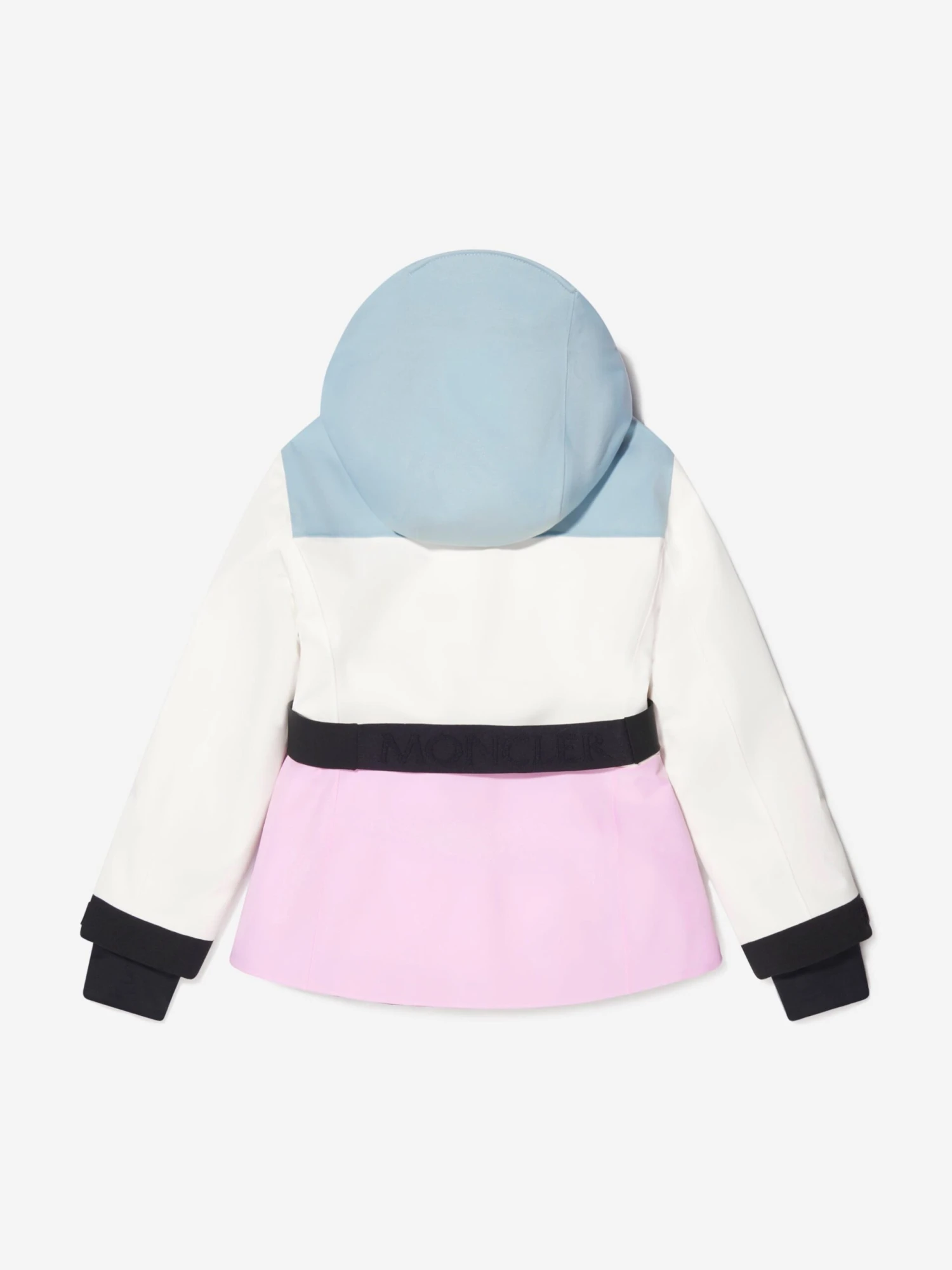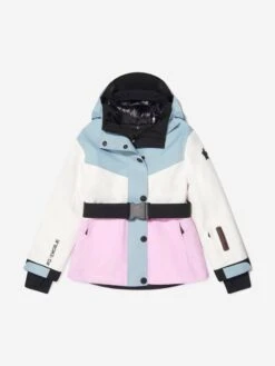 Future fashion now, this girls Corserey ski jacket from Moncler gives feminine flair and freedom of movement on the slopes. A cool pastel colourbock palette decorates this down padded piece for a warm, luxe feeling. Essential skiwear from the Alpine label’s Grenoble collection, the jacket is crafted from a tech nylon that stretches four ways to ensure maximum ease of movement when in action. An elasticated belt, skirt silhouette and silicone badge complete the outdoor garment.